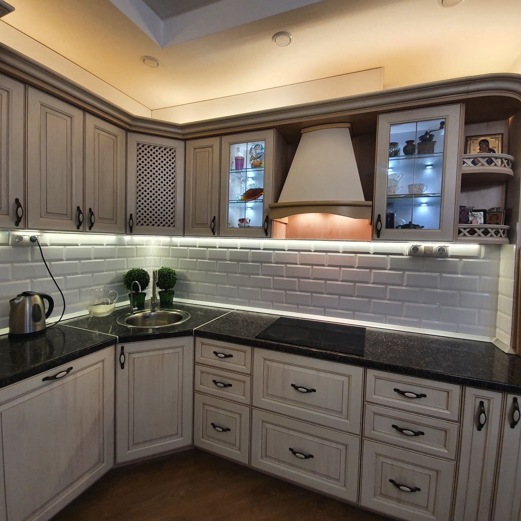 Кухня оборудована встроенной техникой: посудомоечная машина Bosh на 12 комплектов посуды,духовой шкаф Bosh, варочная панель Электролюкс, два холодильника.