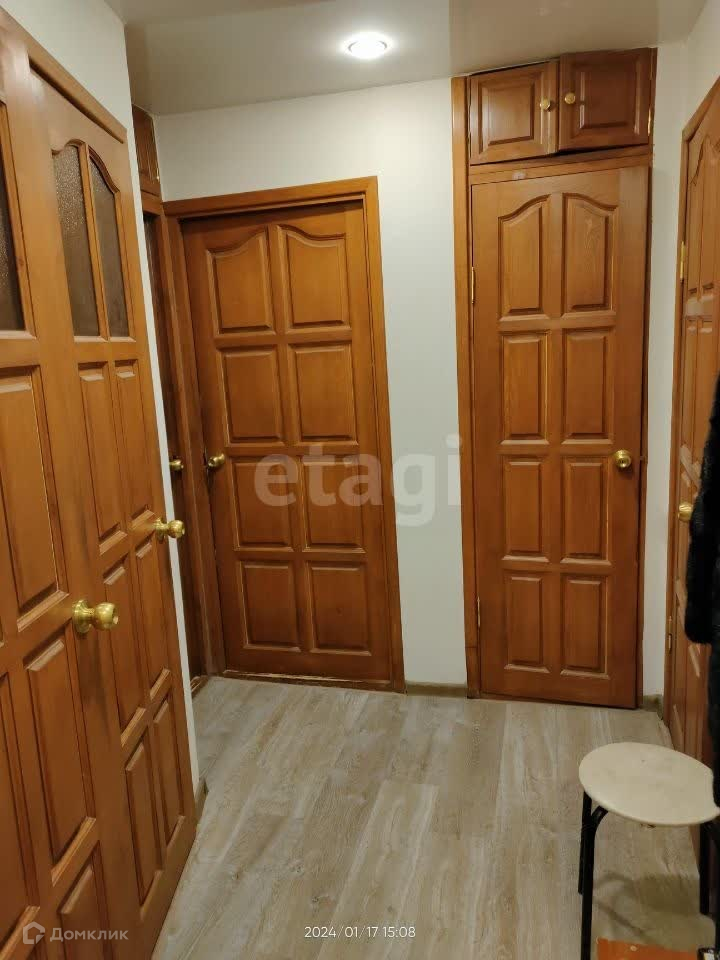 На все окна установлены стеклопакеты, межкомнатные двери из массива коричневого цвета (двери возможно перекрасить в другой цвет), натяжные потолки во всей квартире, на полу постелен ламинат, металлическая входная дверь с зеркалом.
