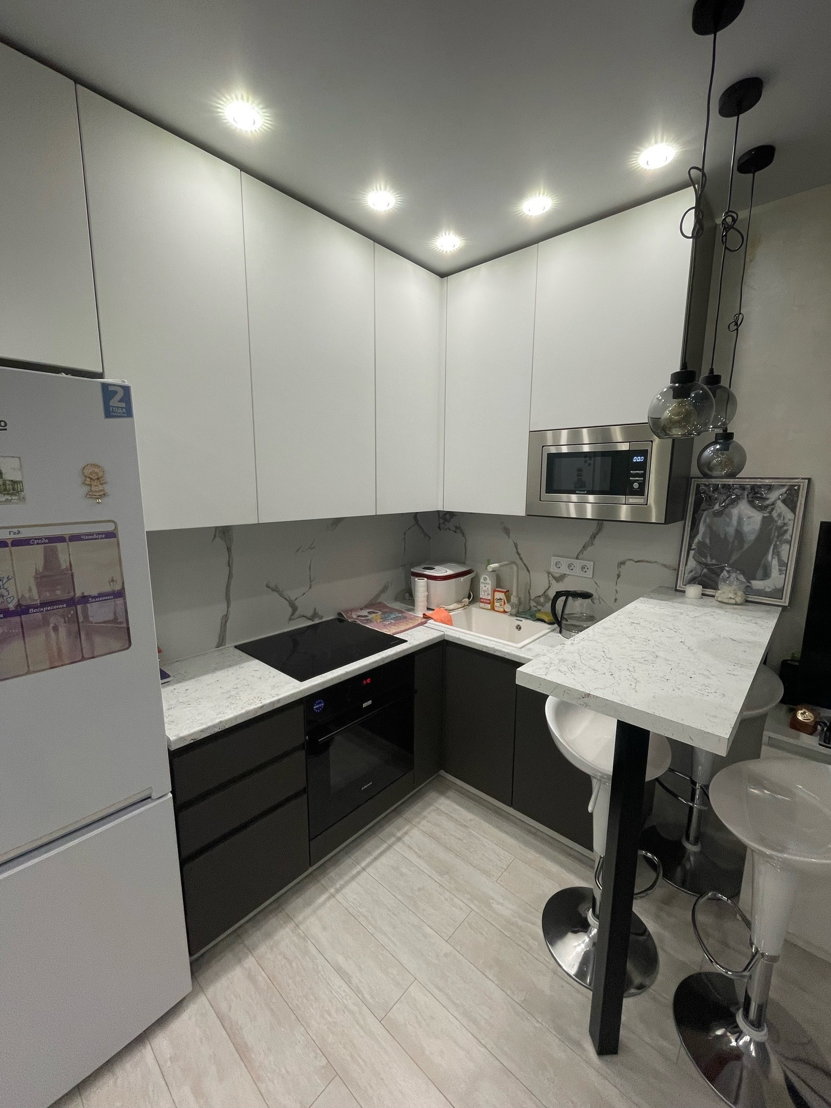 Ремонт делали для себя, поэтому в квартире все продумано до мелочей. Кухня сделана под заказ, установлена дорогая встроенная техника. В санузле теплый пол.