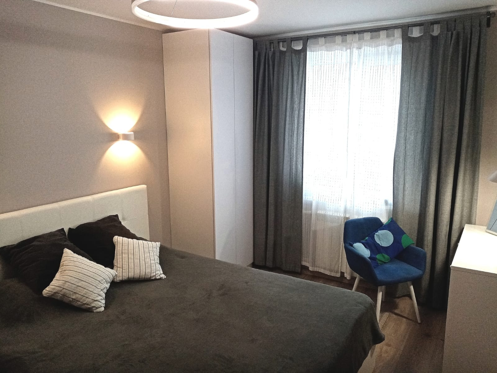 В квартире остаётся: кухонный гарнитур, электрический духовой шкаф, посудомоечная машина, два гардеробных шкафа в спальне.