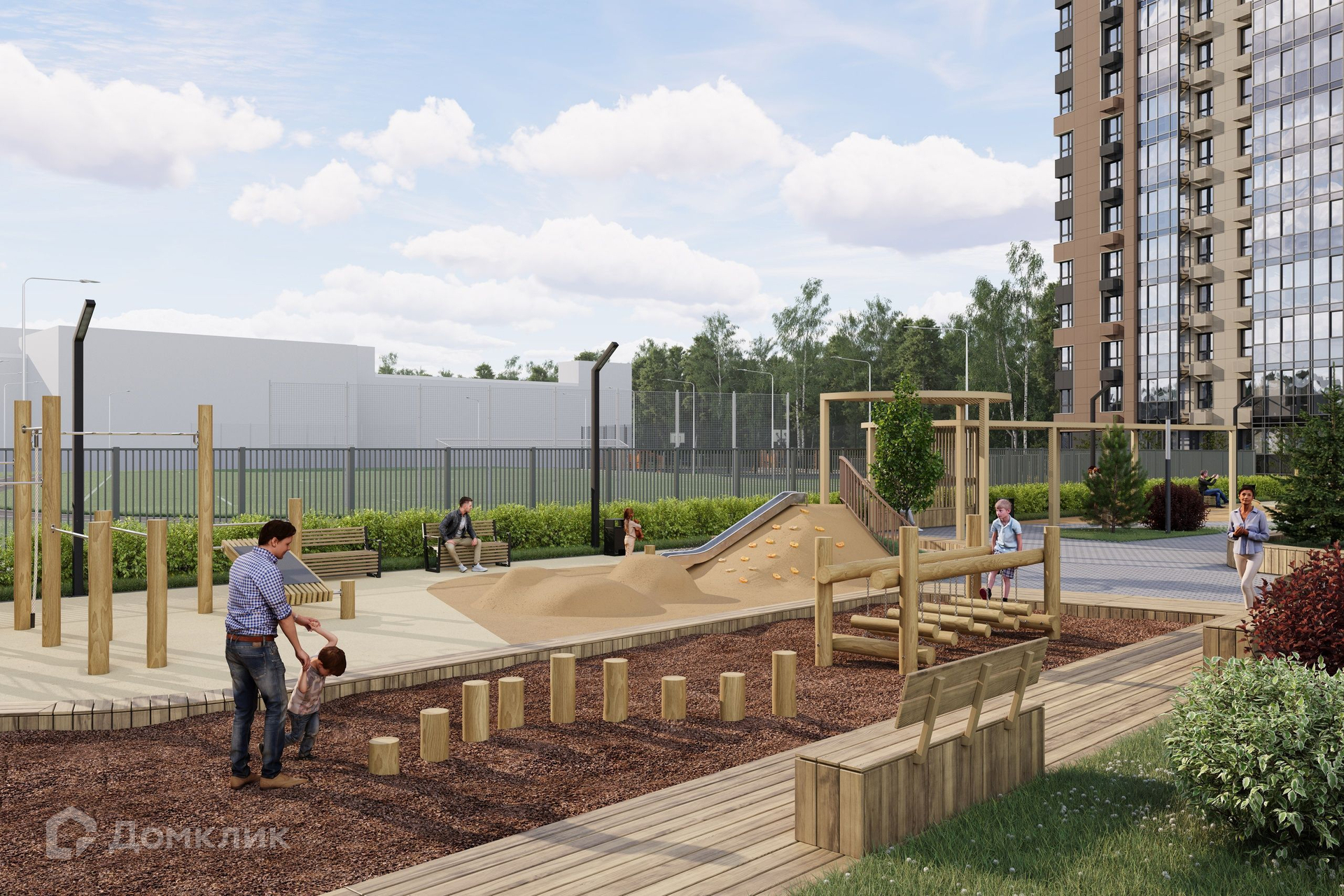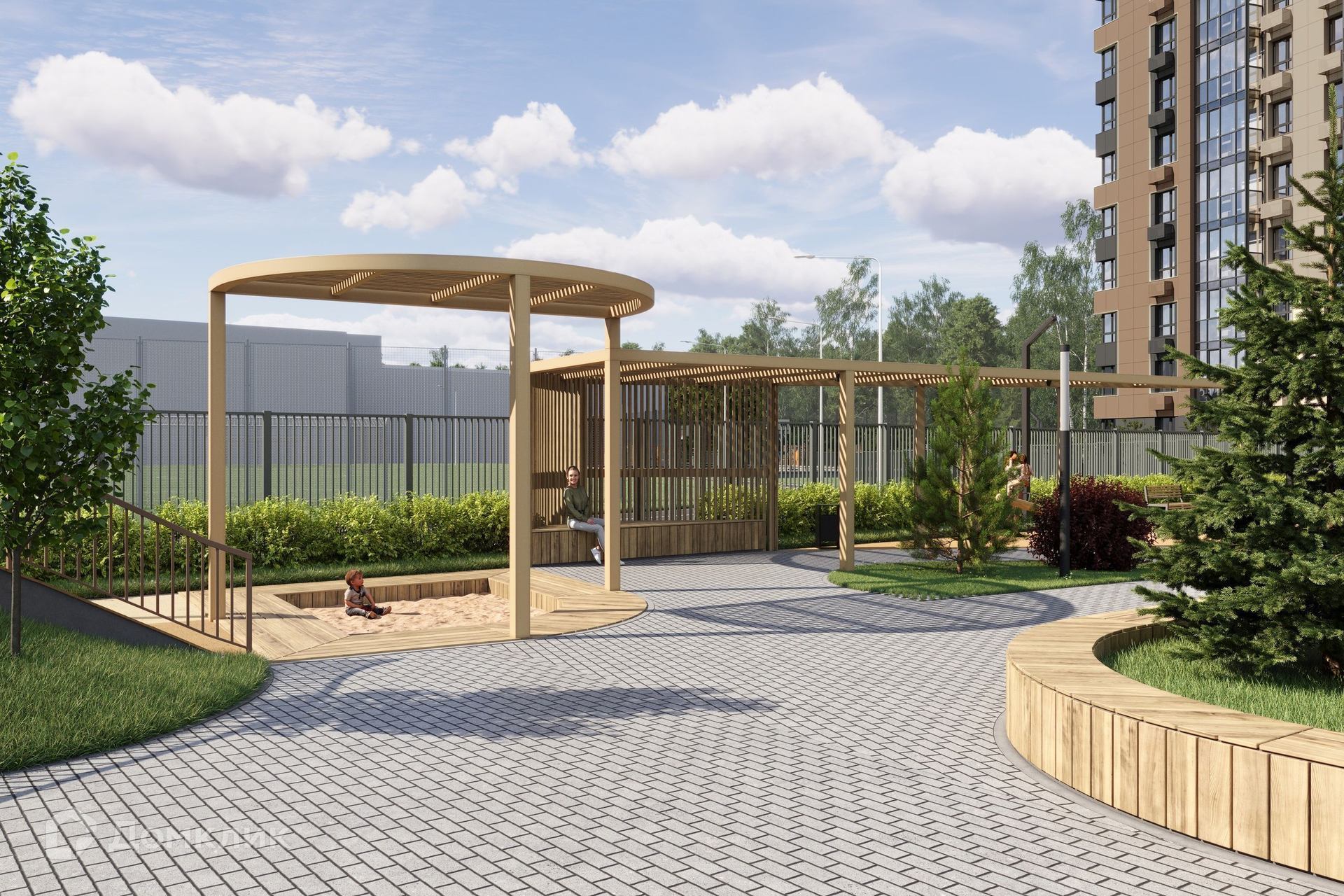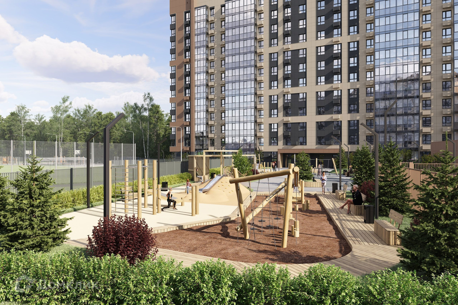 Двор в «Нóве» без машин, уютный и закрытый от посторонних, комплексно благоустроен в экостиле. Здесь в приватной атмосфере разместились места для отдыха, детские и спортивные площадки. Комфорт усиливают деликатная геопластика и разнообразное озеленение из хвойных, лиственных, цветущих плодовых деревьев и кустарников.