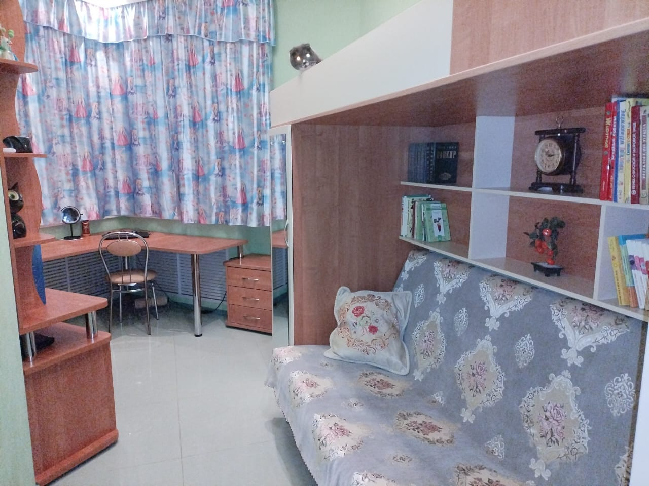 Отличная современная квартира с высокими потолками, очень теплая. В общем коридоре есть собственная вместительная кладовка. Квартира чистая, светлая, с хорошим ремонтом, качественные дорогие материалы, на полу плитка, обои на стенах под покраску. Ванная комната полностью вся в плитке.                   В квартире остается встроенная мебель, сделанная на заказ: кухонный гарнитур, 2 шкафа-купе в коридоре, в комнате кровать-чердак со шкафами, письменный стол с тумбами, книжный шкаф, в ванной комнате остается пенал с зеркалом. Из техники остается варочная поверхность и духовой шкаф фирмы Электролюкс, вытяжка, водонагреватель. Остальная мебель по договоренности. Соседи спокойные, во дворе детская площадка. В следующем году планируется ремонт дороги во дворе. Рядом находятся: спортивный центр "Скала", ресторан "Армения", АЗС, сбербанк, почта, детский садик через дорогу, школа, почта, магазины. Квартира без залогов и долгов.