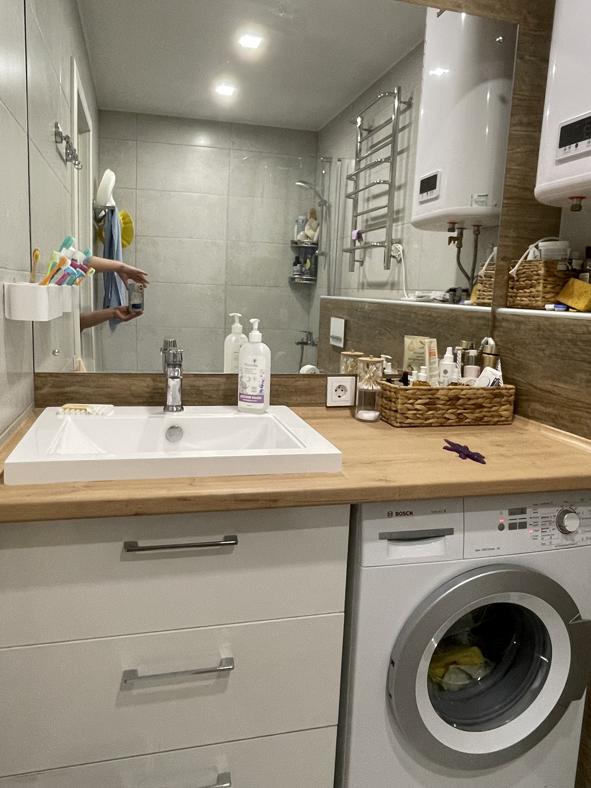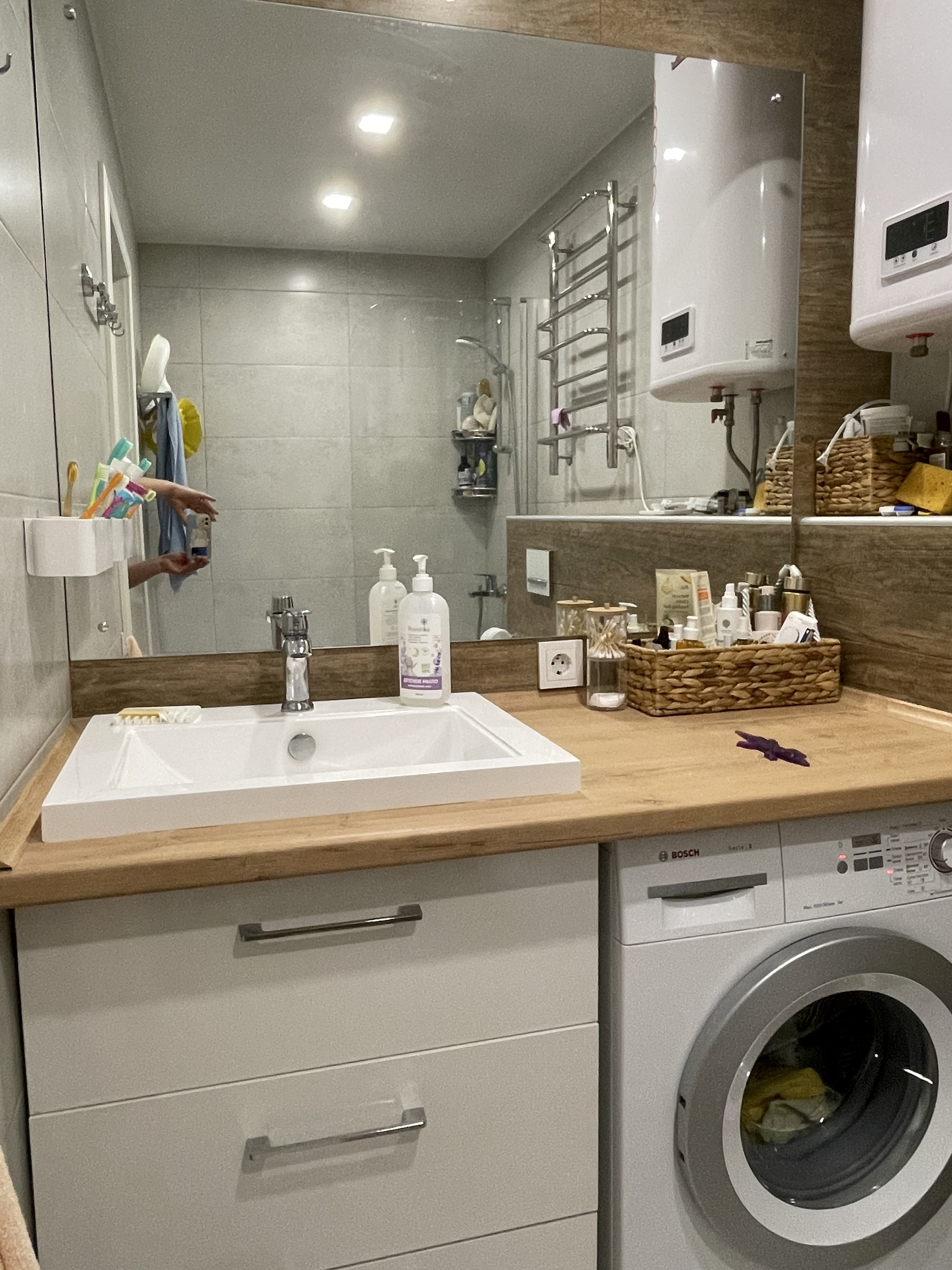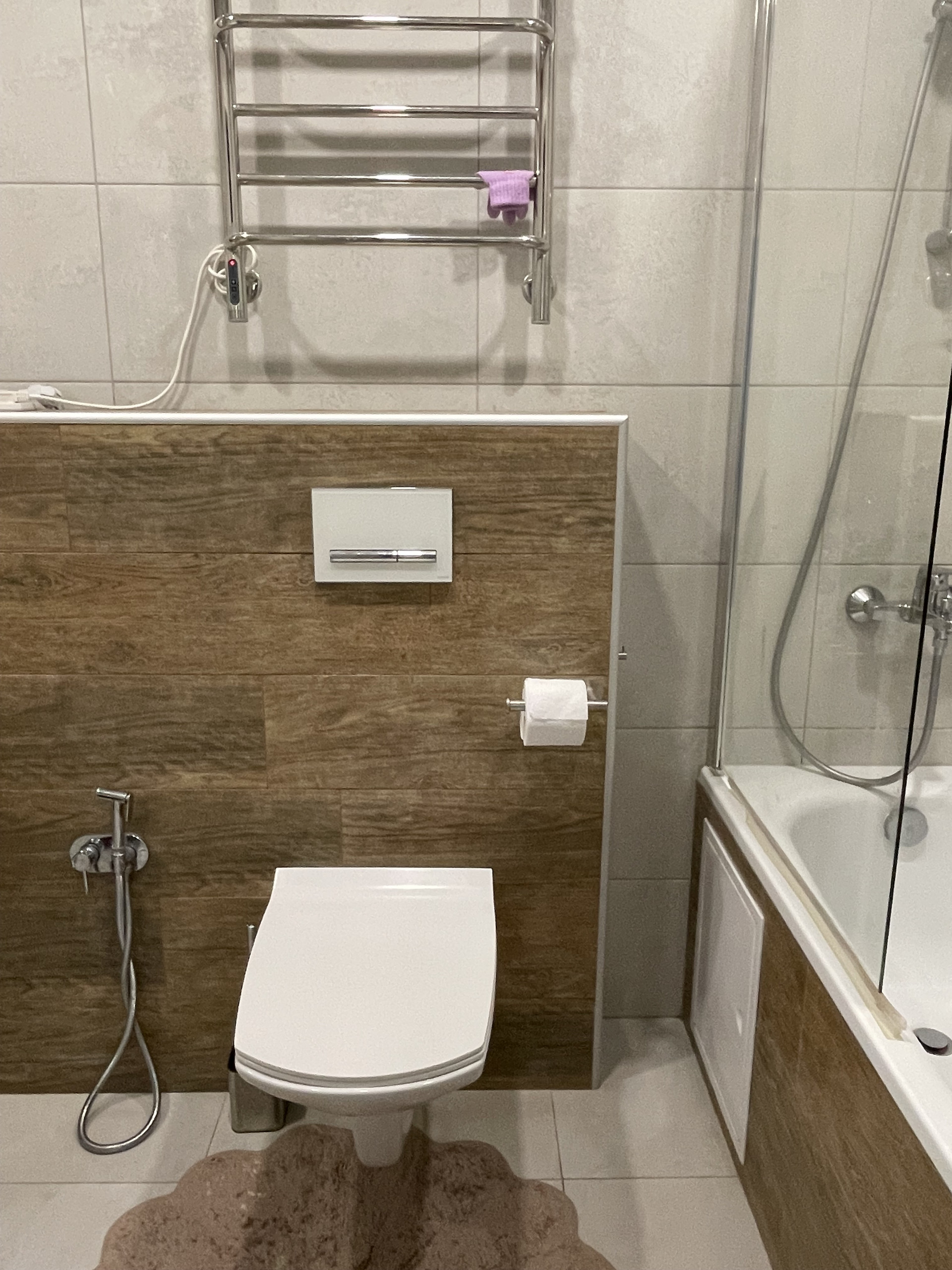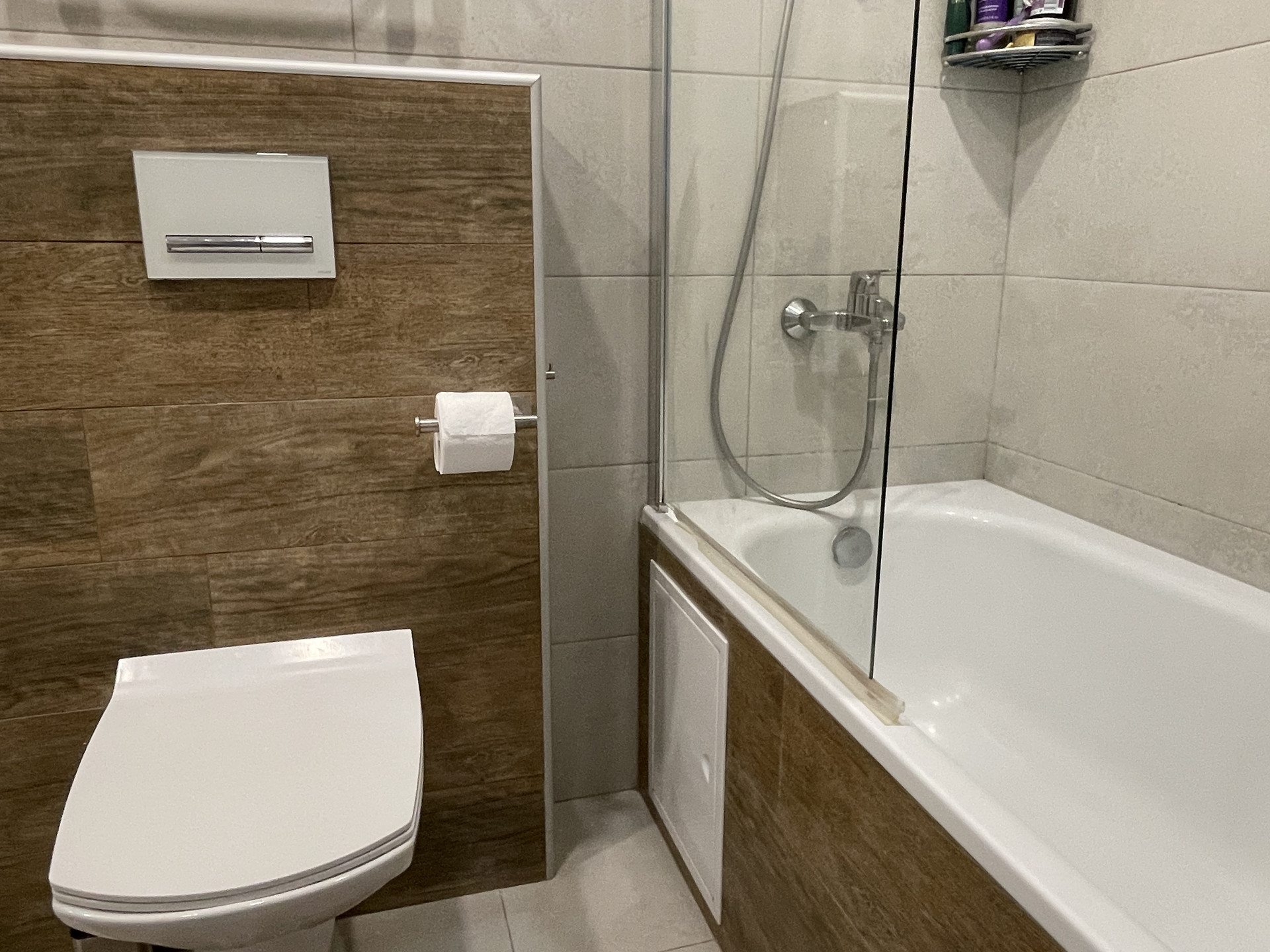 Санузел совмещенный, очень большой отделан кафельной плиткой, гигиенический душ, водонагреватель).