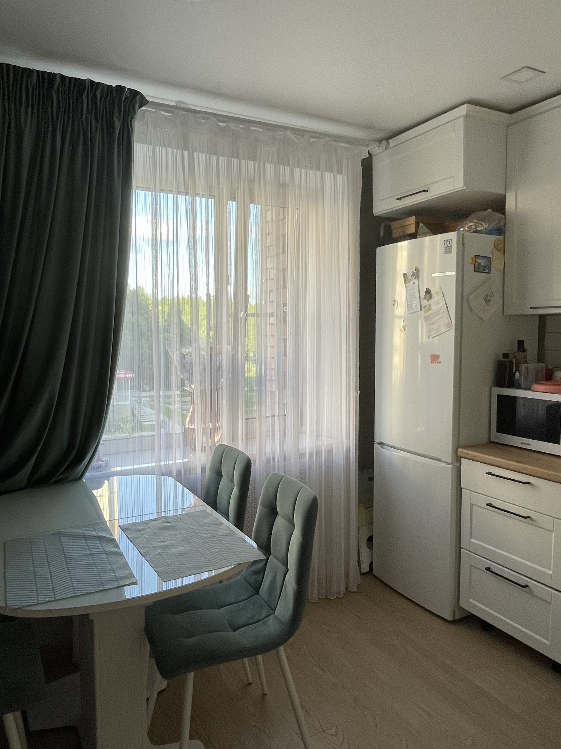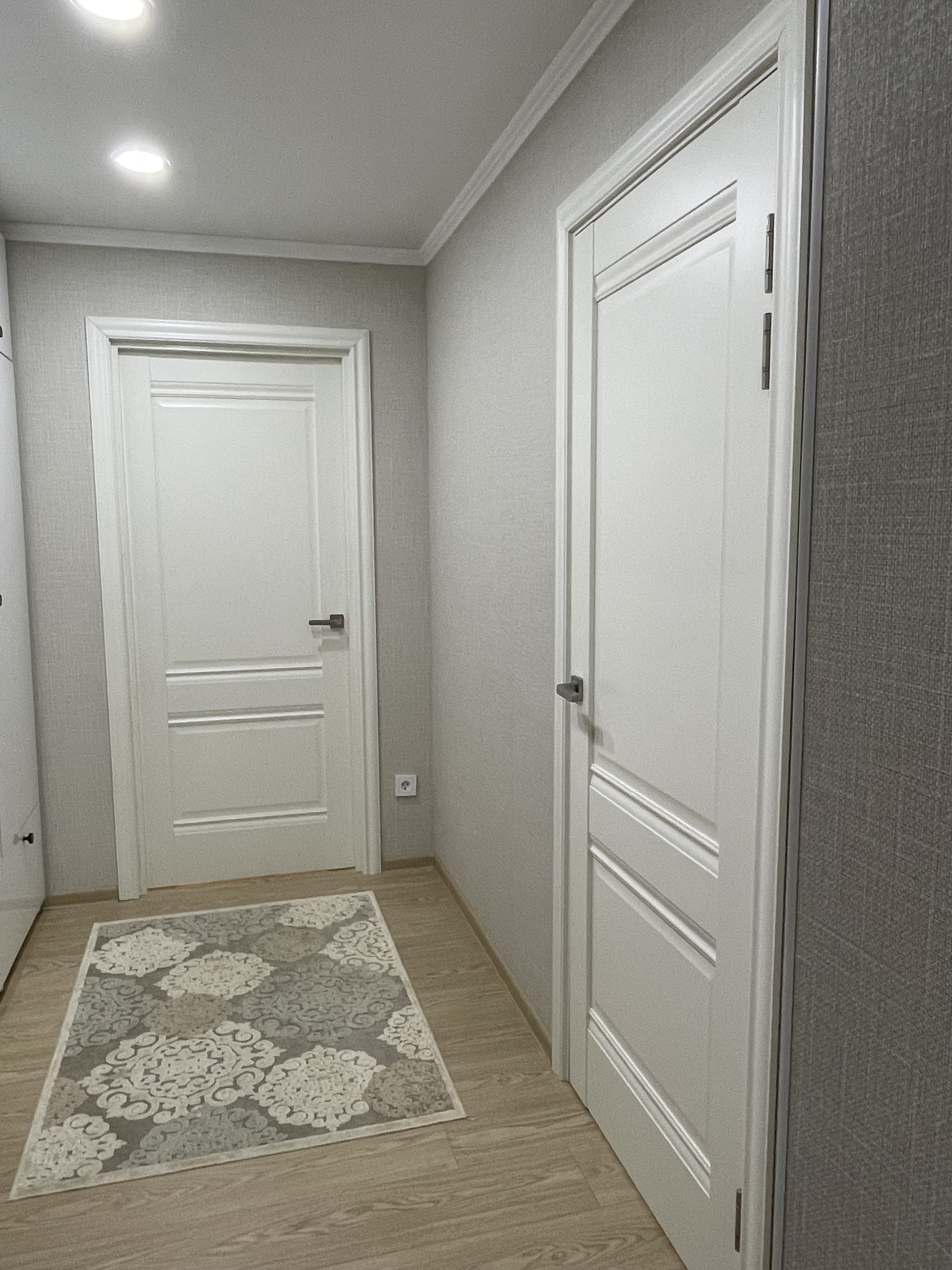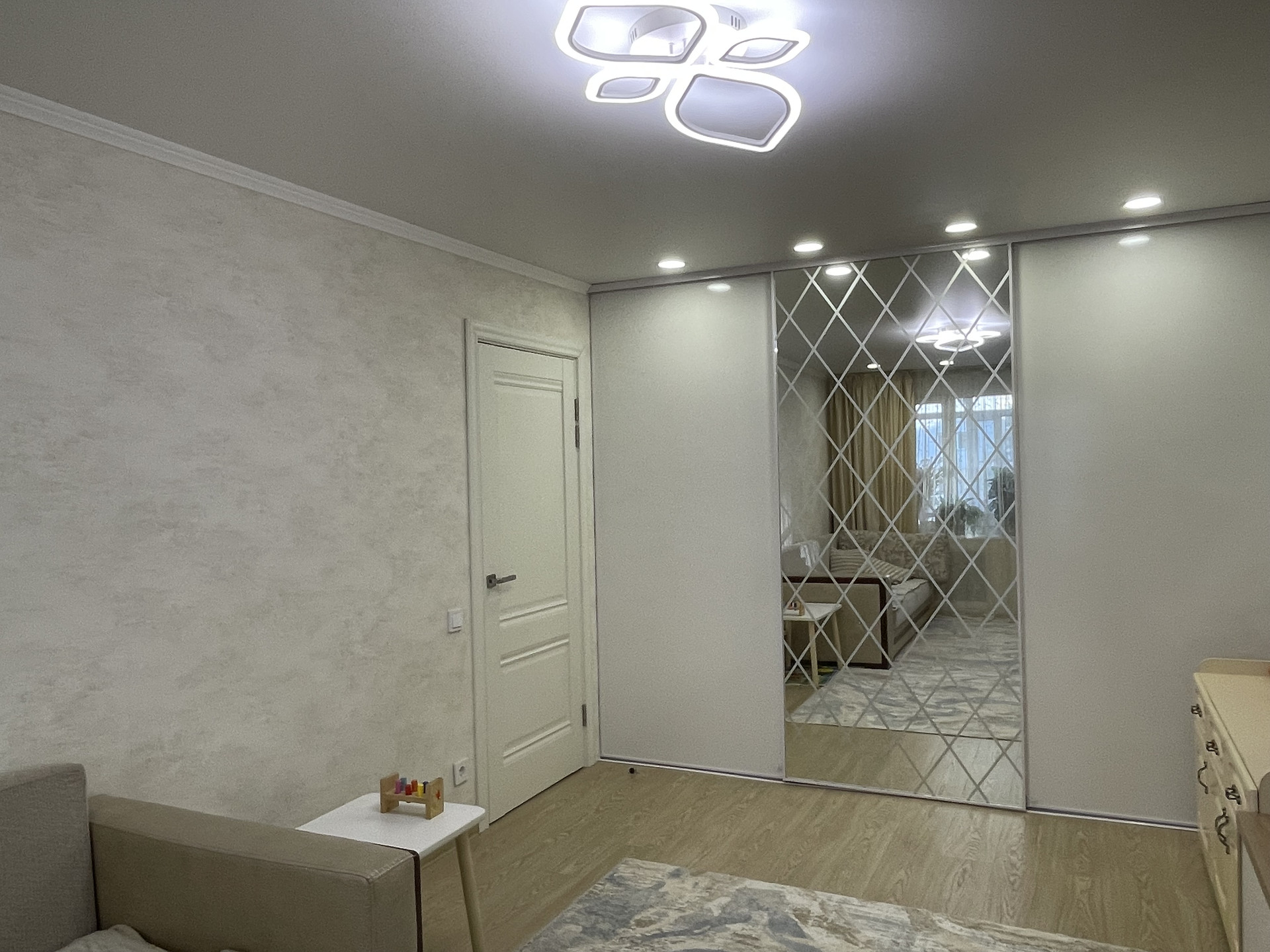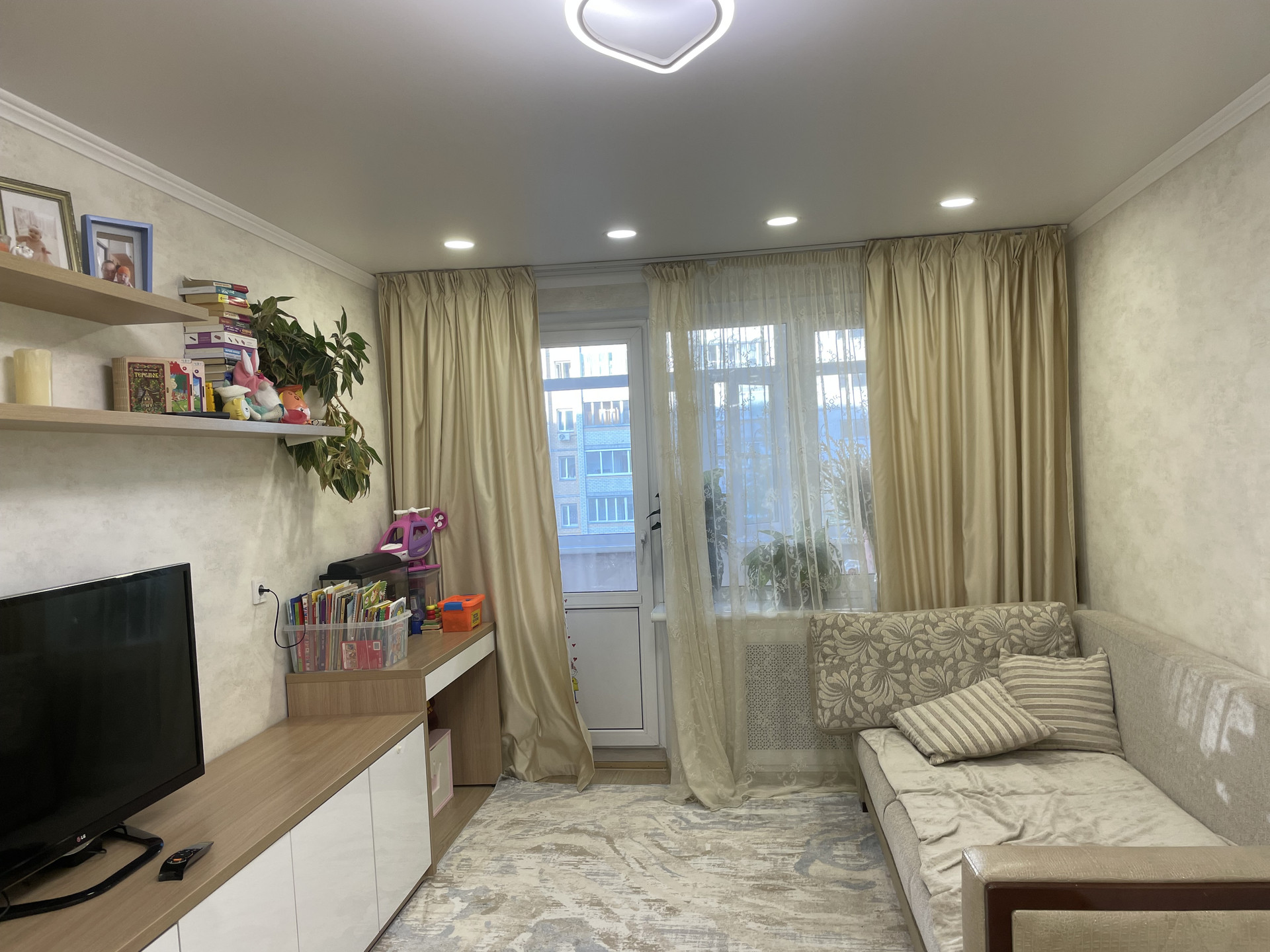 Окна стеклопакеты, балкон "зимний вариант" утеплен, стеклопакеты, натяжной потолок со встроенными светильниками, декоративная штукатурка.