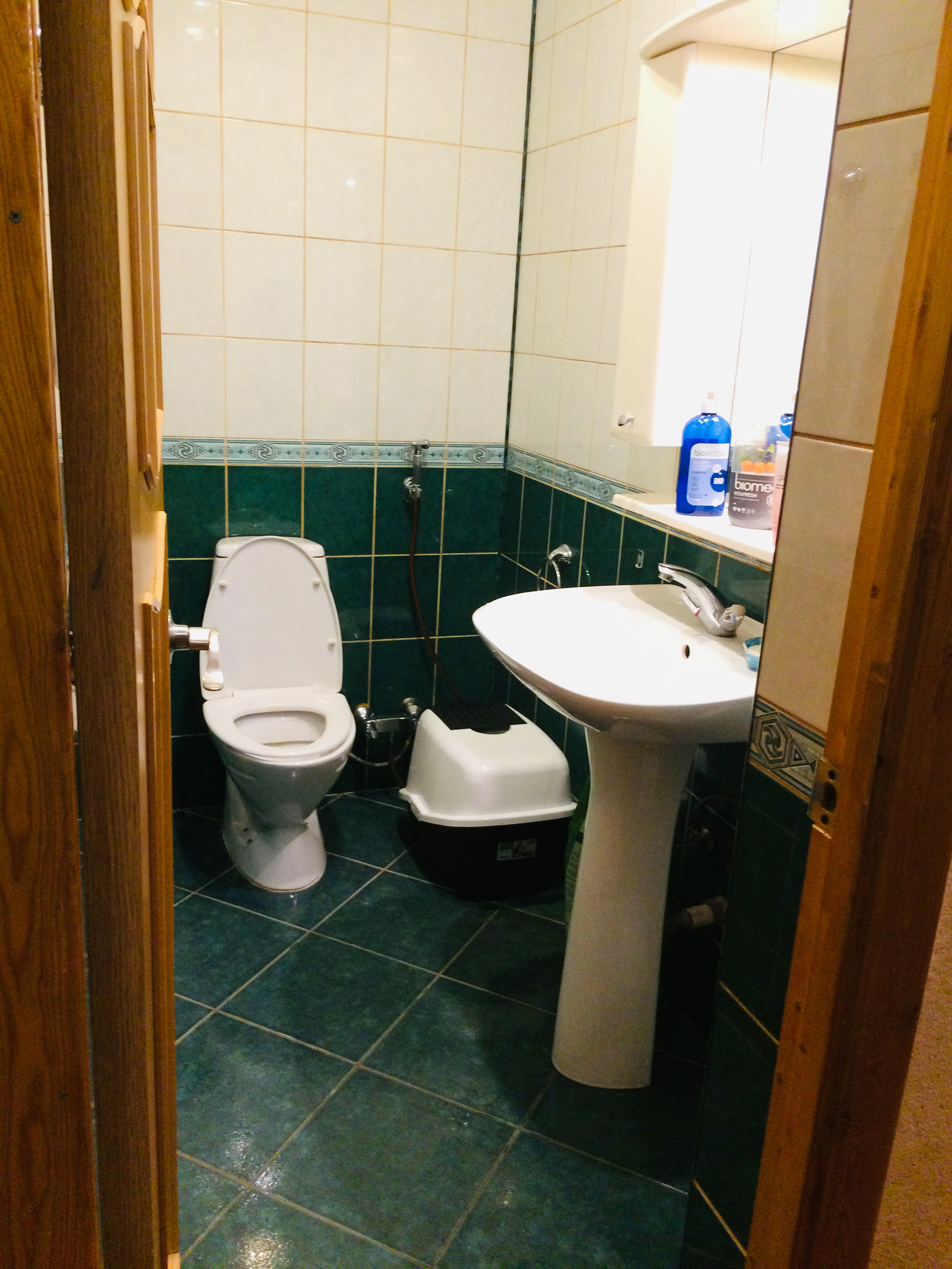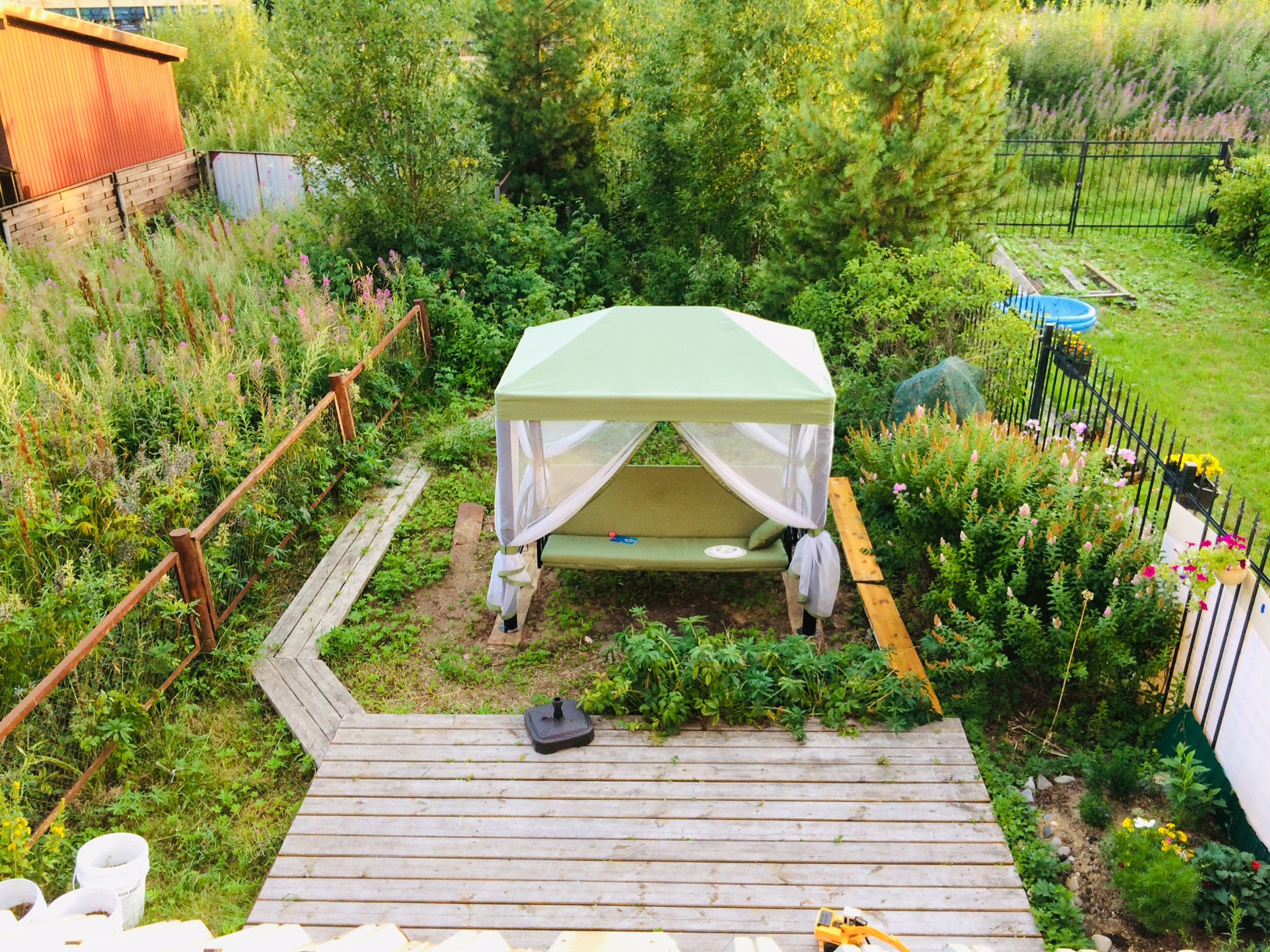 На дворике посажены кедры, березы, сирень, цветы, плодоносящие малина, вишня, смородина. Деревянный настил, качели, помещение для хранения садового инвентаря и игрушек.