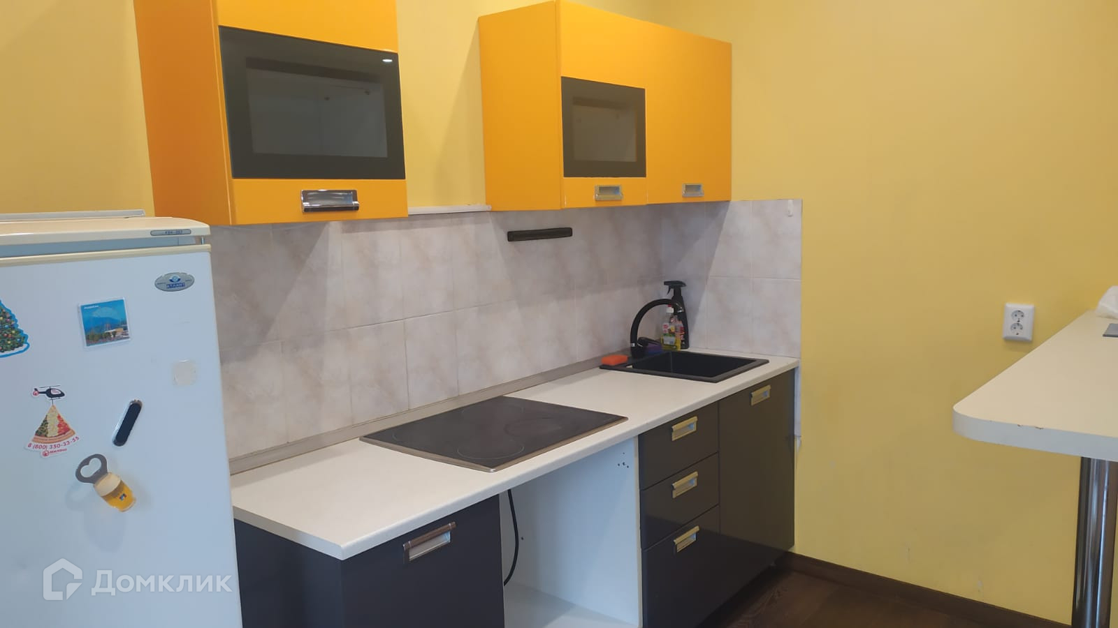 Из мебели кухня с варочной панелью. Холодильник, стиральная машина, шкаф.