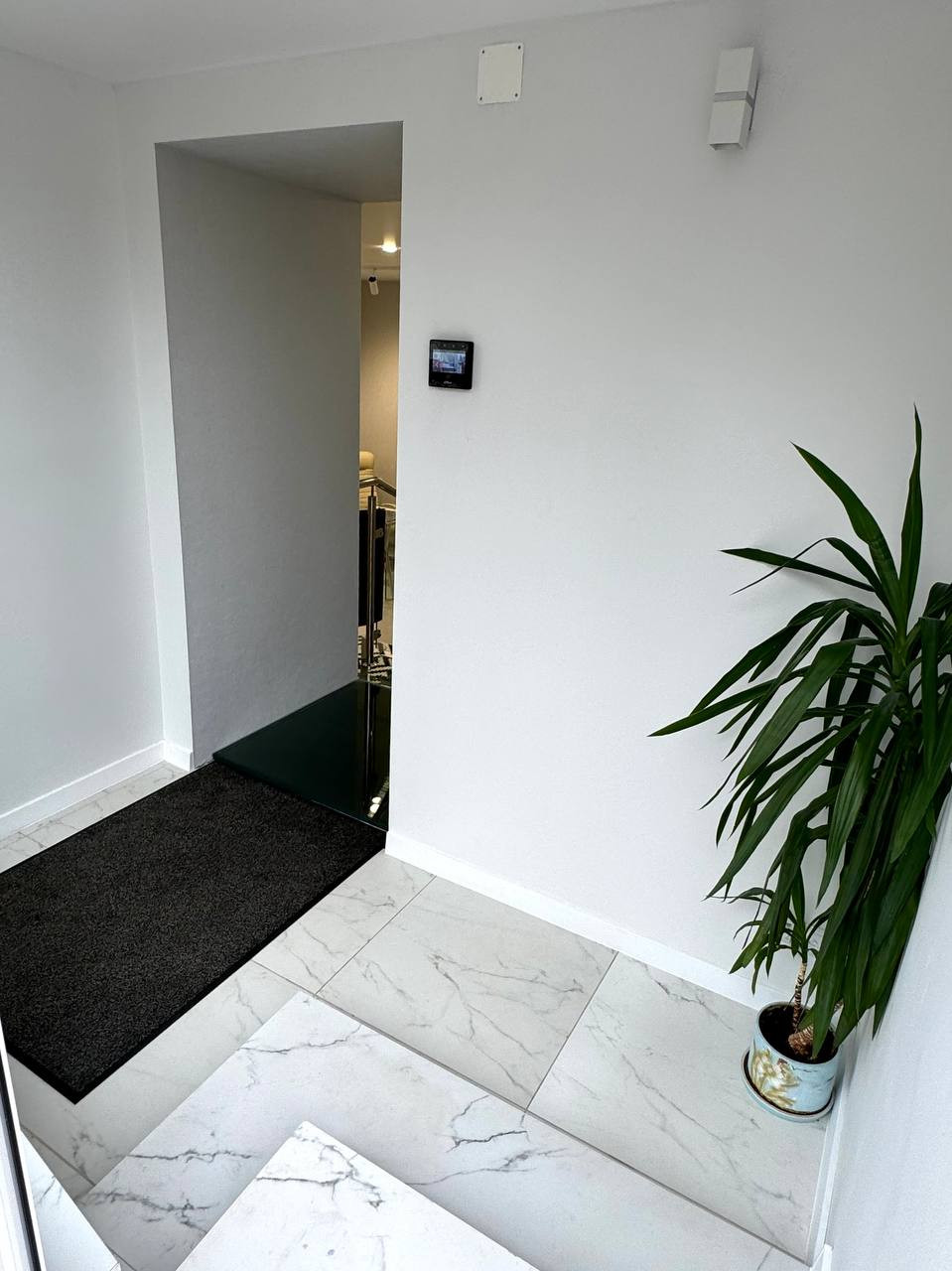Панорамный вид из зоны входа под видеонаблюдением и видеодомофоном , которая застеклена и оснащена зеркальной тонировкой, позволяет видеть всё, что происходит на улице, и наслаждаться живописными городскими пейзажами и зелеными зонами. Снаружи люди видят только свое отражение, обеспечивая конфиденциальность и спокойствие внутри апартаментов.