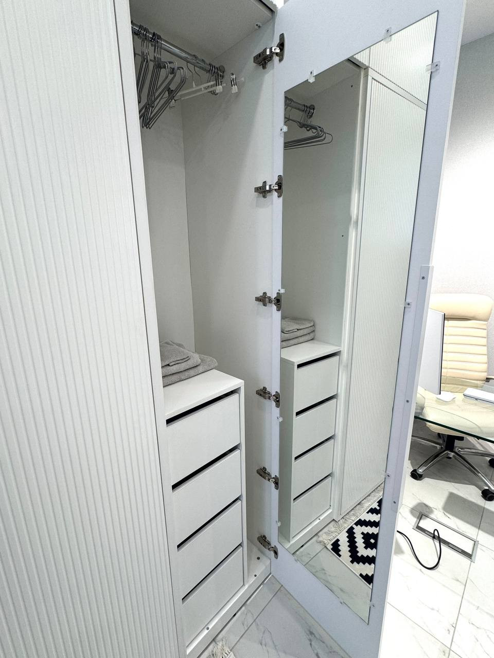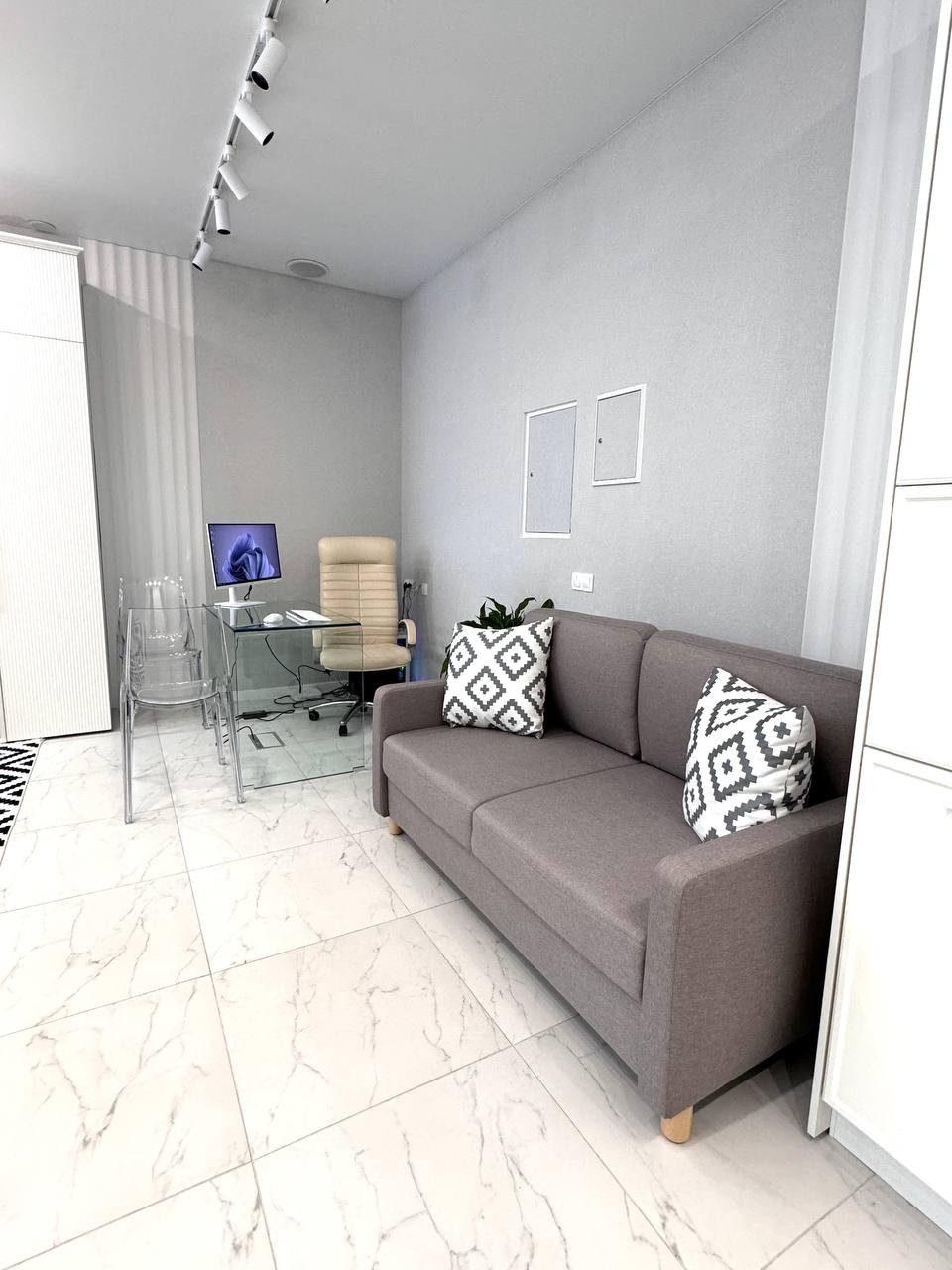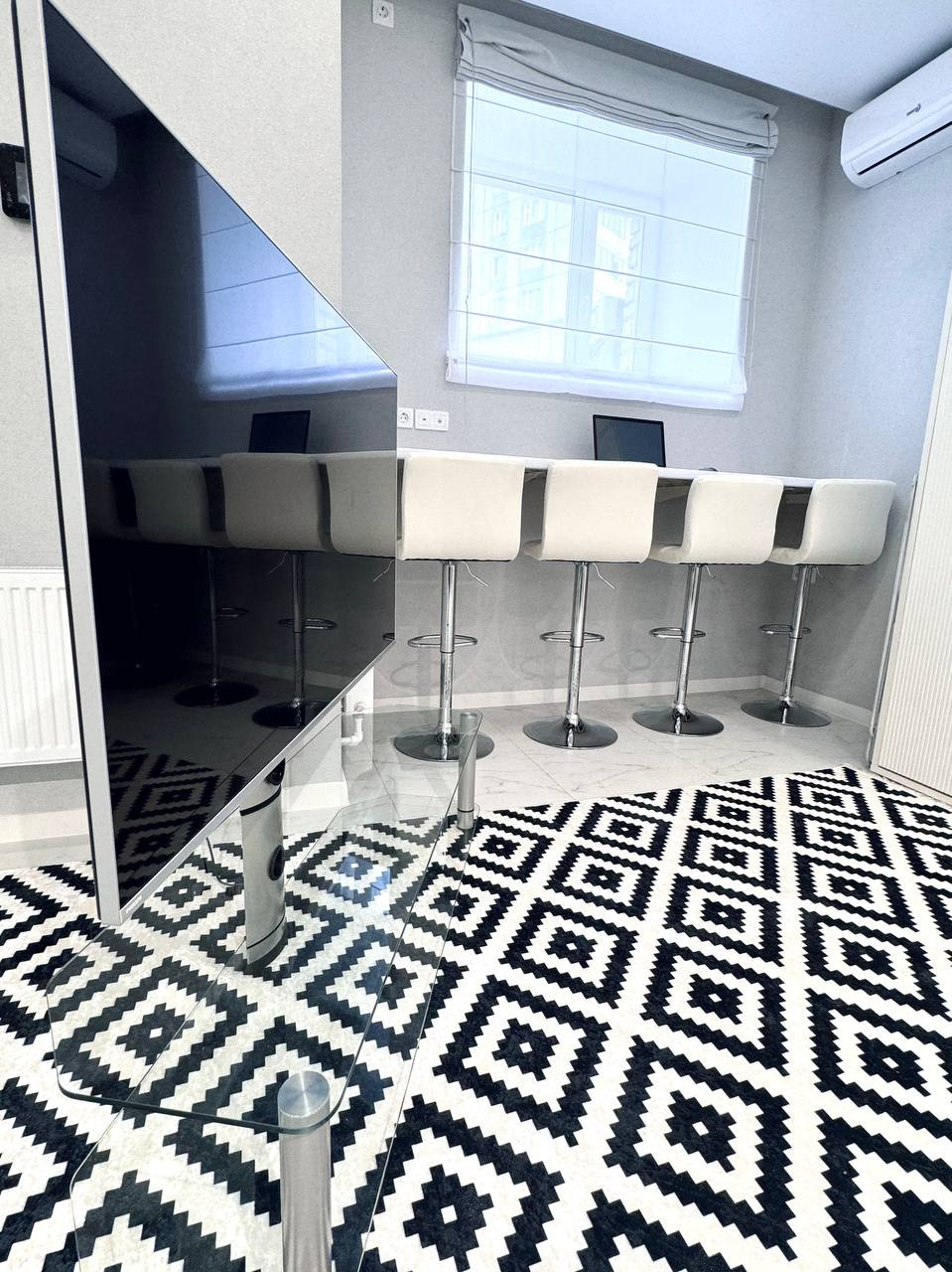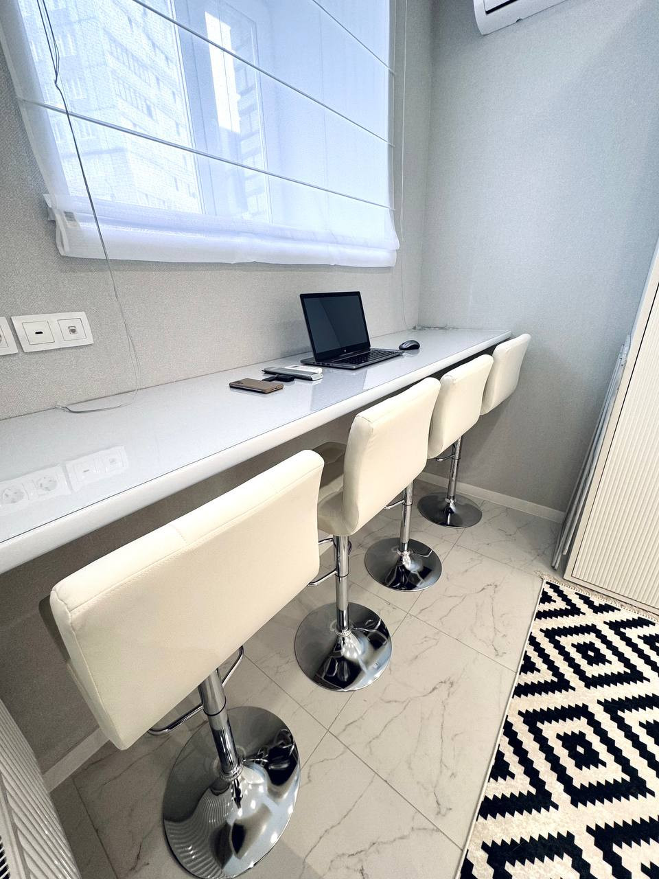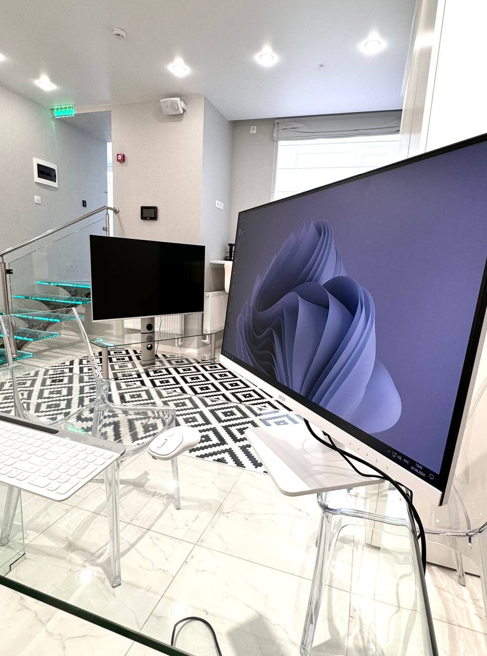 Удобство работы: просторное рабочее место с современным оборудованием, включая компьютер с монитором и Android TV диагональю 60 дюймов с голосовым управлением, что позволяет эффективно выполнять задачи и наслаждаться мультимедийным контентом.