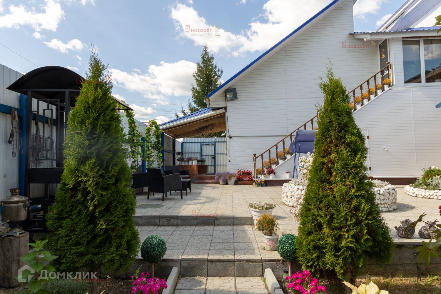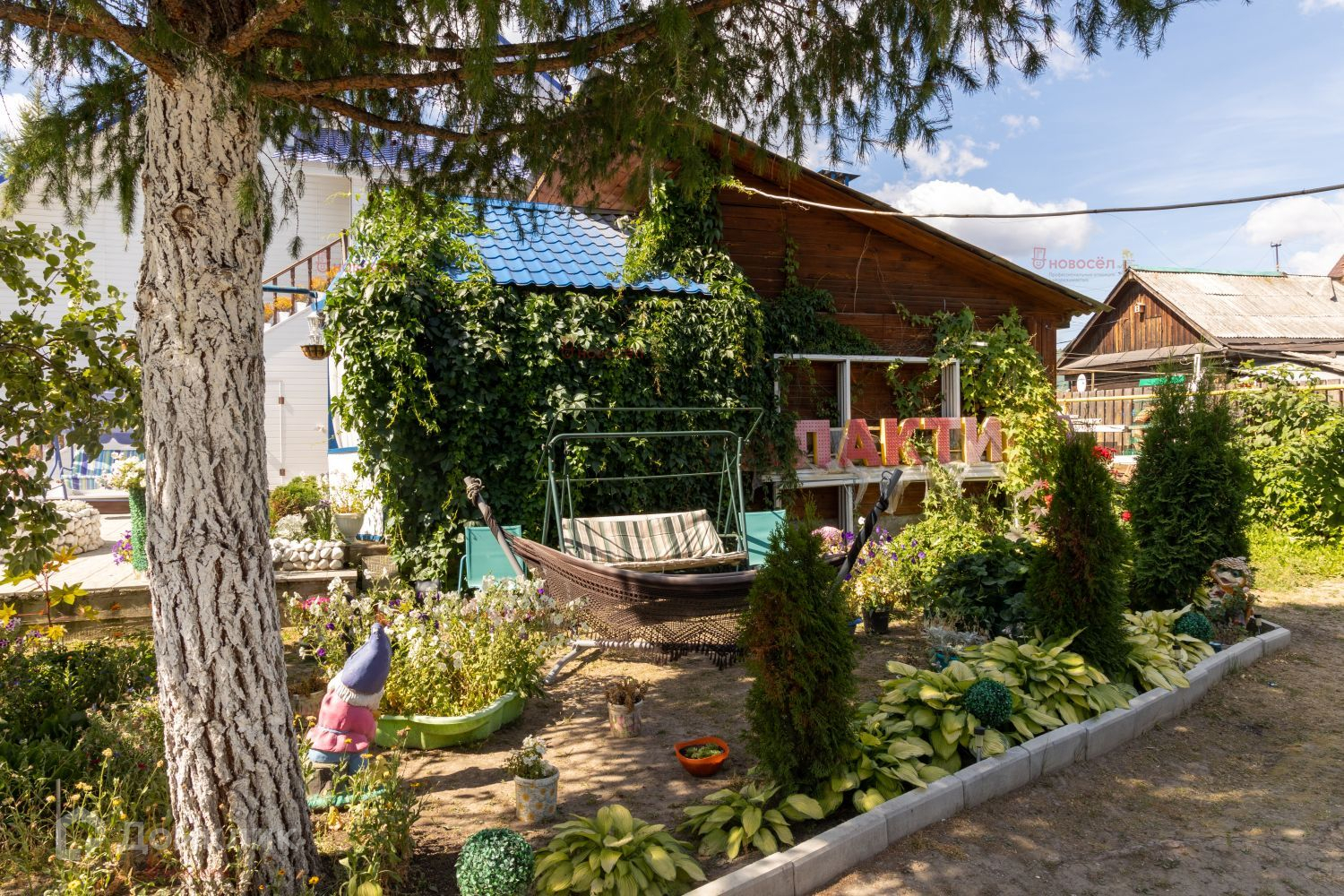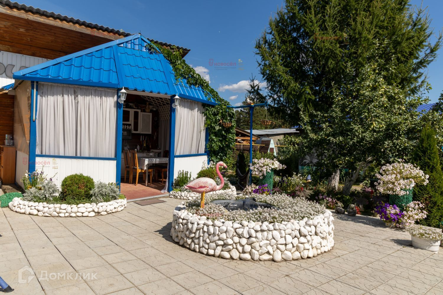 На территории располагается беседка с летней кухней и видом на фонтан, в которой можно собираться компанией или просто отдыхать тихими летними вечерами. Участок вымощен плиткой, ландшафт с различными декоративными и плодовыми насаждениями. Перед домом раскинулся цветочный сад – это гордость хозяйки!