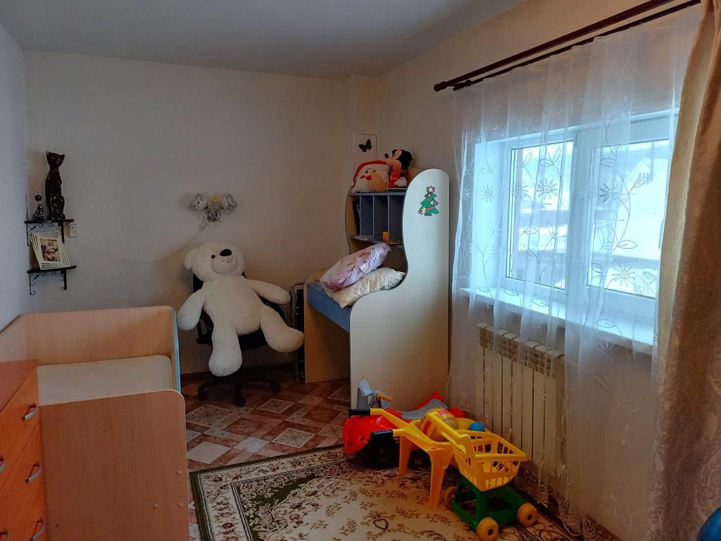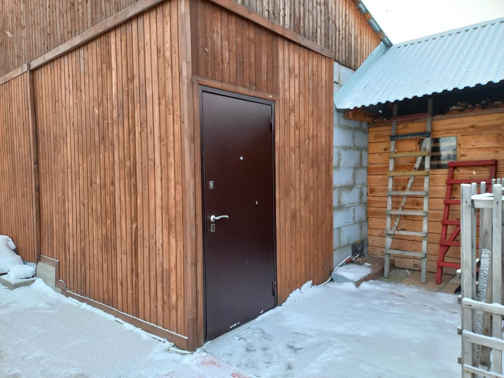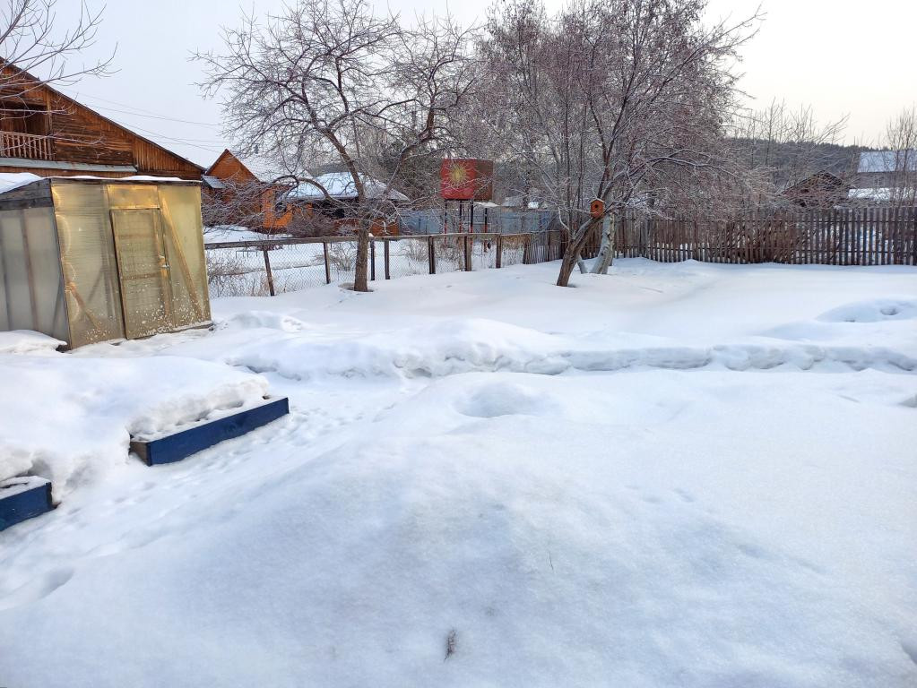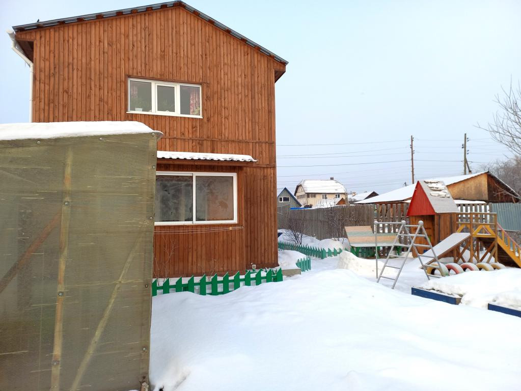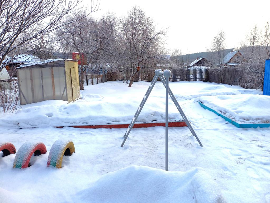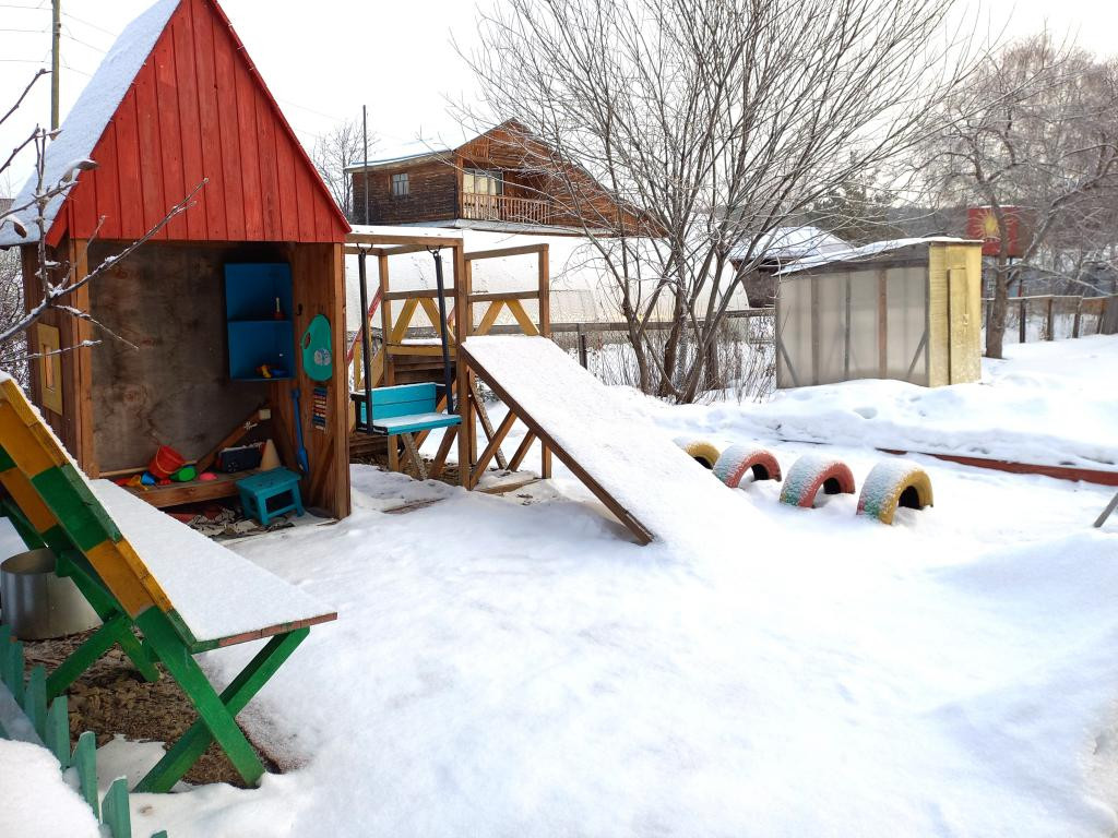 Детская площадка, двор выложен тротуарной плиткой. Есть сарай для домашних животных, птиц. Дровяник.