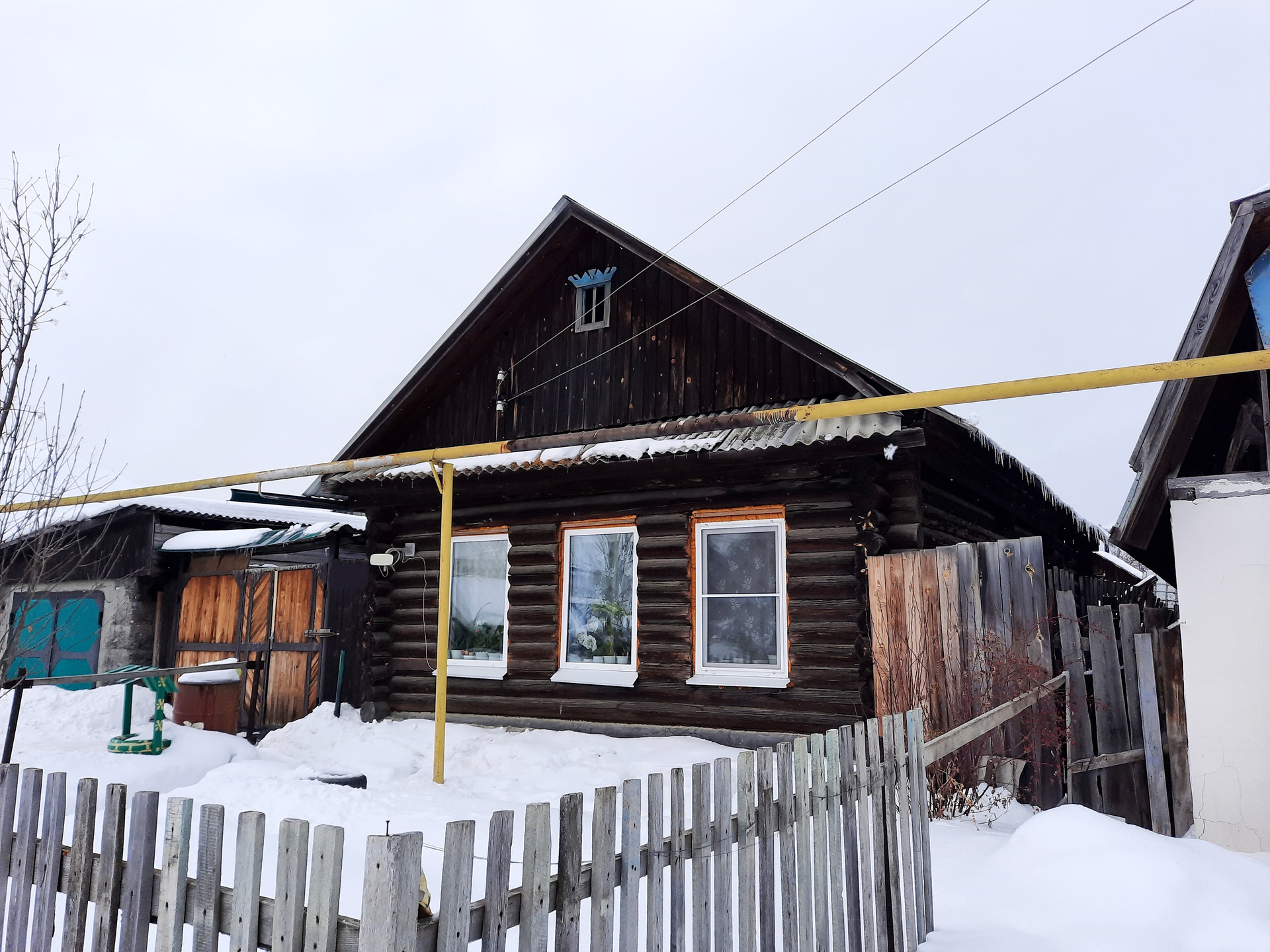 Дом бревенчатый, фундамент ленточный, крыша металлопрофиль, окна пластиковые стеклопакеты (частично).