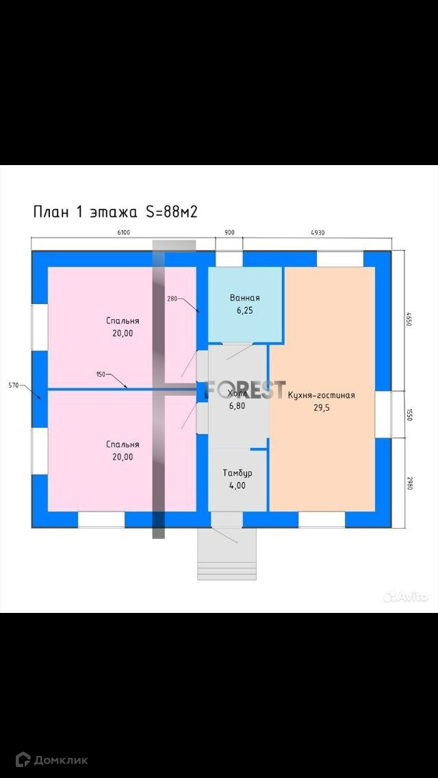 две спальные комнаты по 20 кв.мкухня-гостиная 29,5 кв.мсанузел 6.25 кв.м.