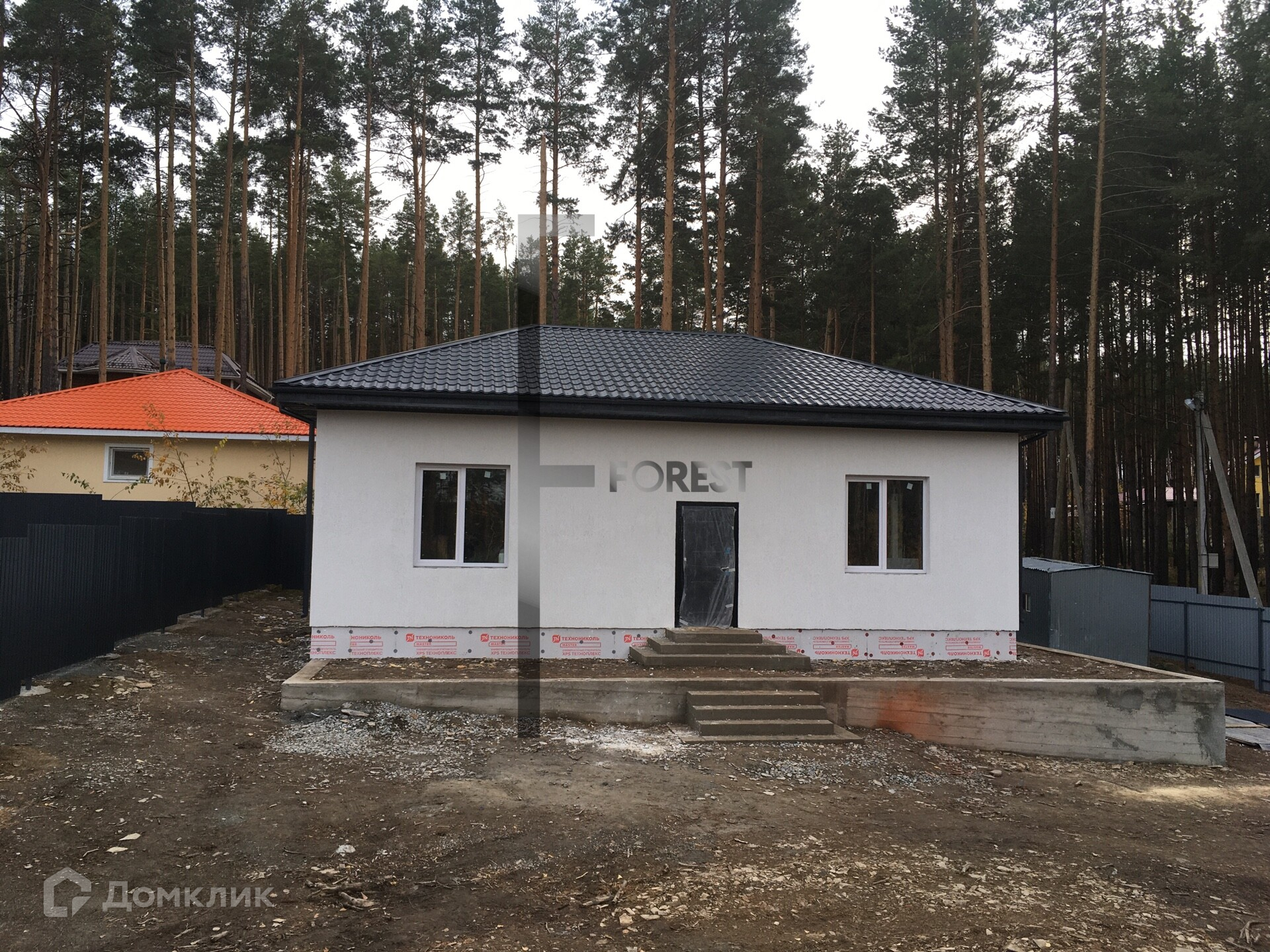 Участок правильной прямоугольной формы, огорожен забором с откатными воротами, находится в окружении соснового леса.