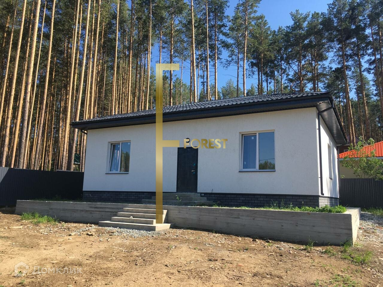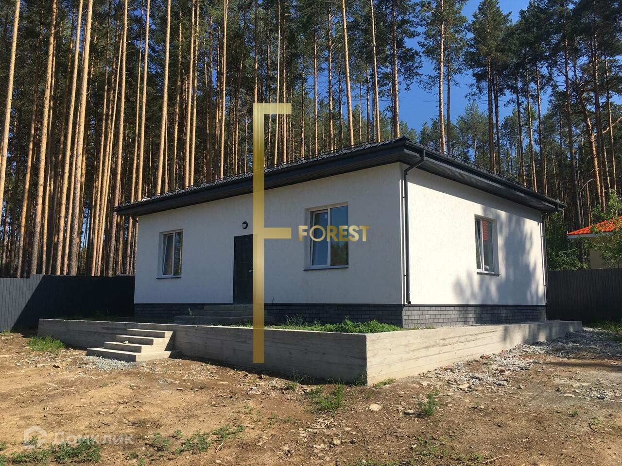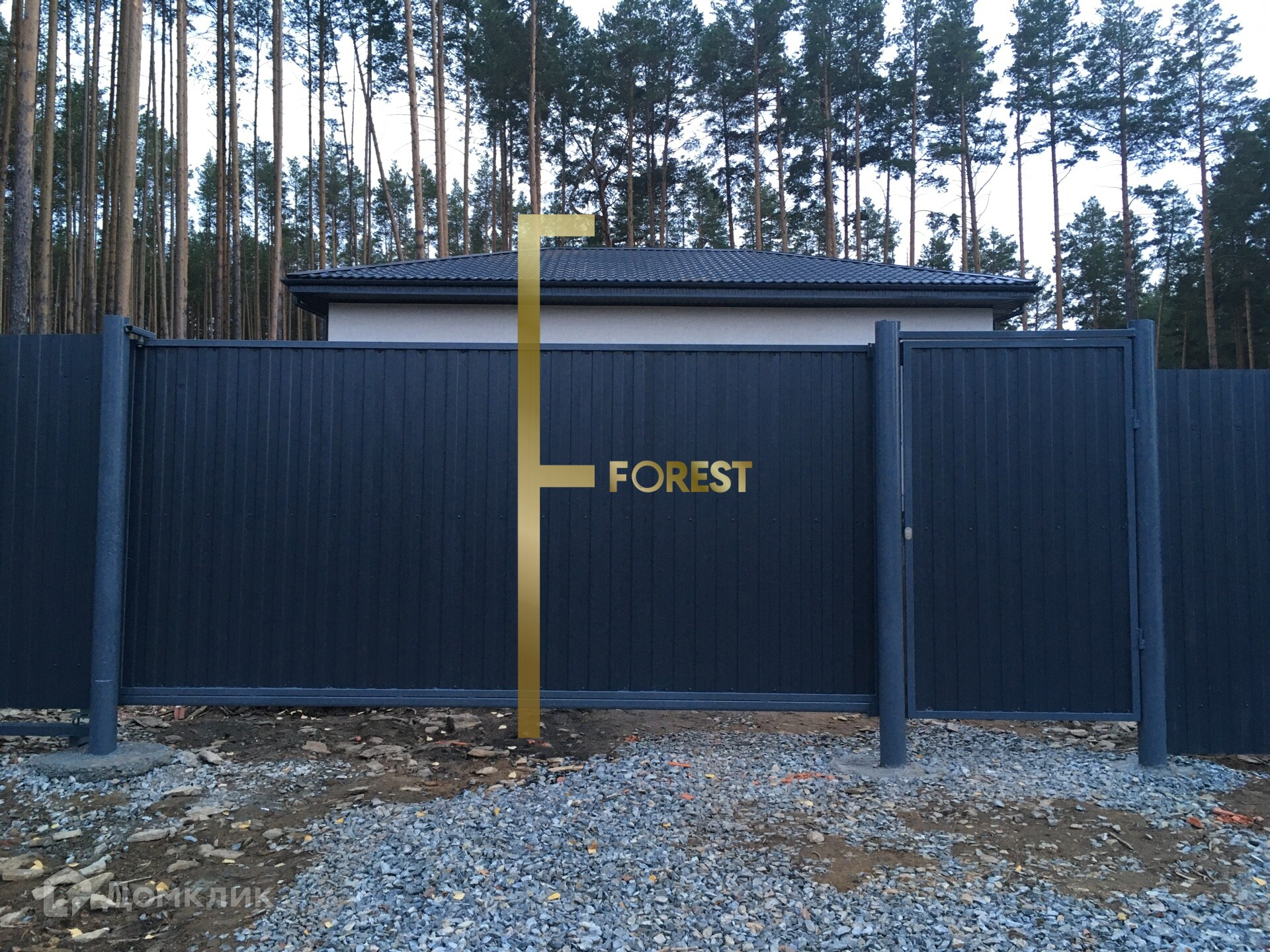 Участок правильной прямоугольной формы, огорожен забором с откатными воротами, находится в окружении соснового леса.