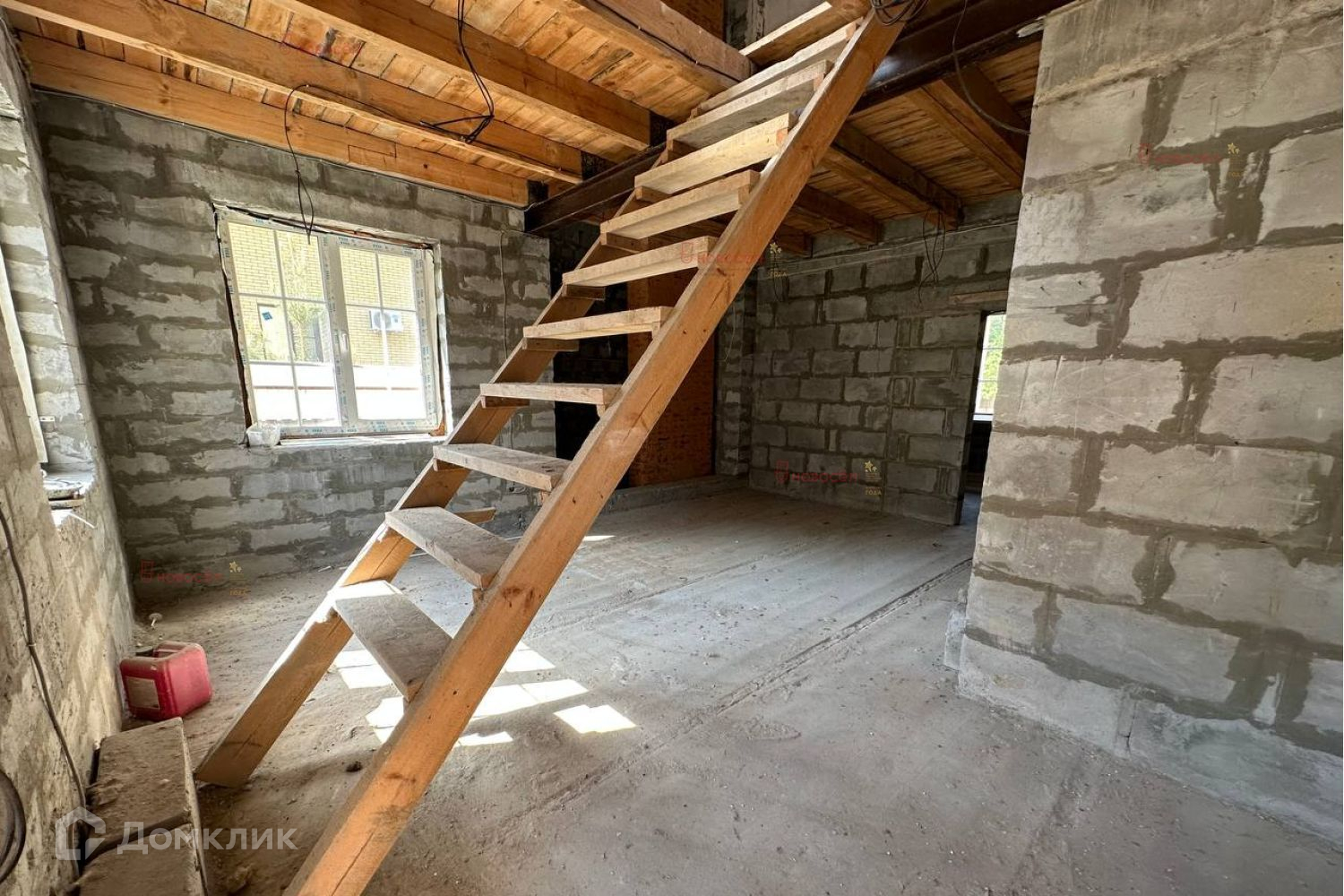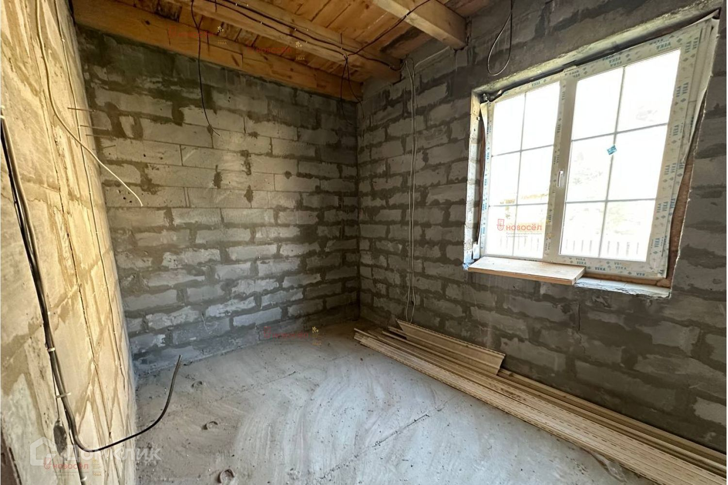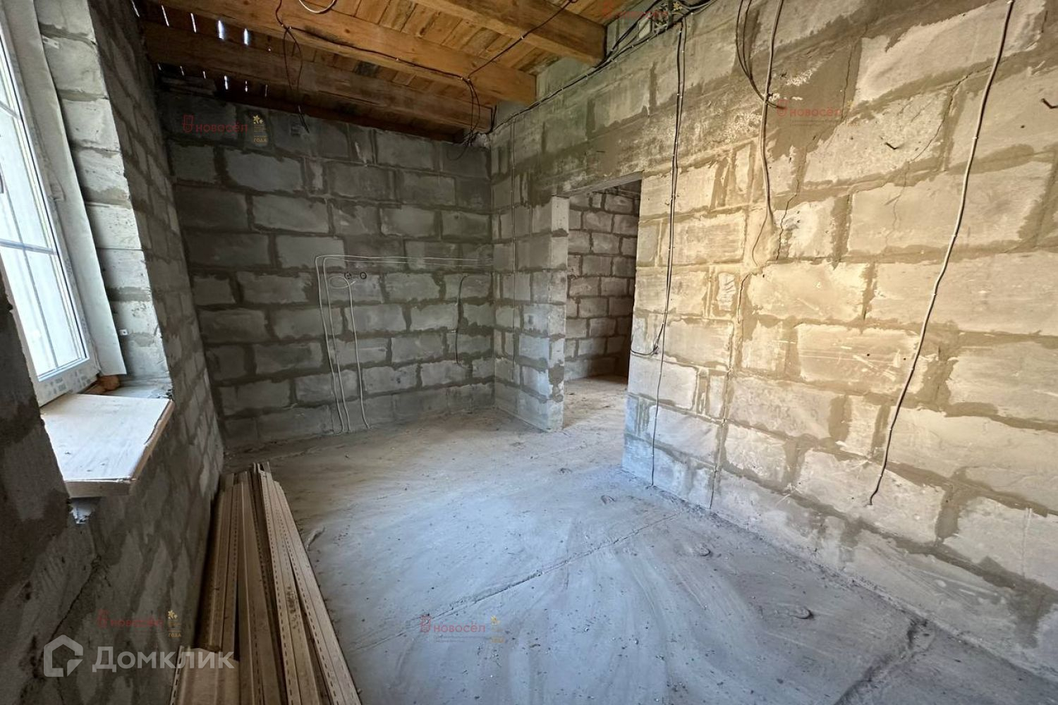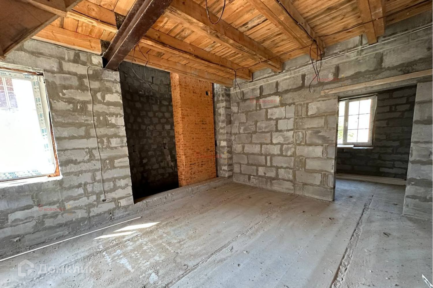 Планировка свободная. Перекрытие: 1 этаж- железобетонные плиты, 2- деревянное. Материал стен- цементный блок с облицовочным кирпичом. Крыша- металлочерепица. Окна пластиковые, французская раскладка (производитель фирма Veka). Электричество: выполнена разводка по дому, 220/380 V. Газ: проходит по участку. Канализация: выгребная яма (труба выведена). Вода: скважина внутри дома.