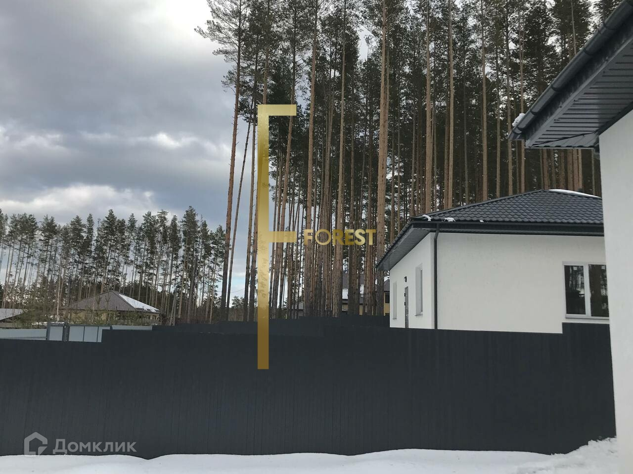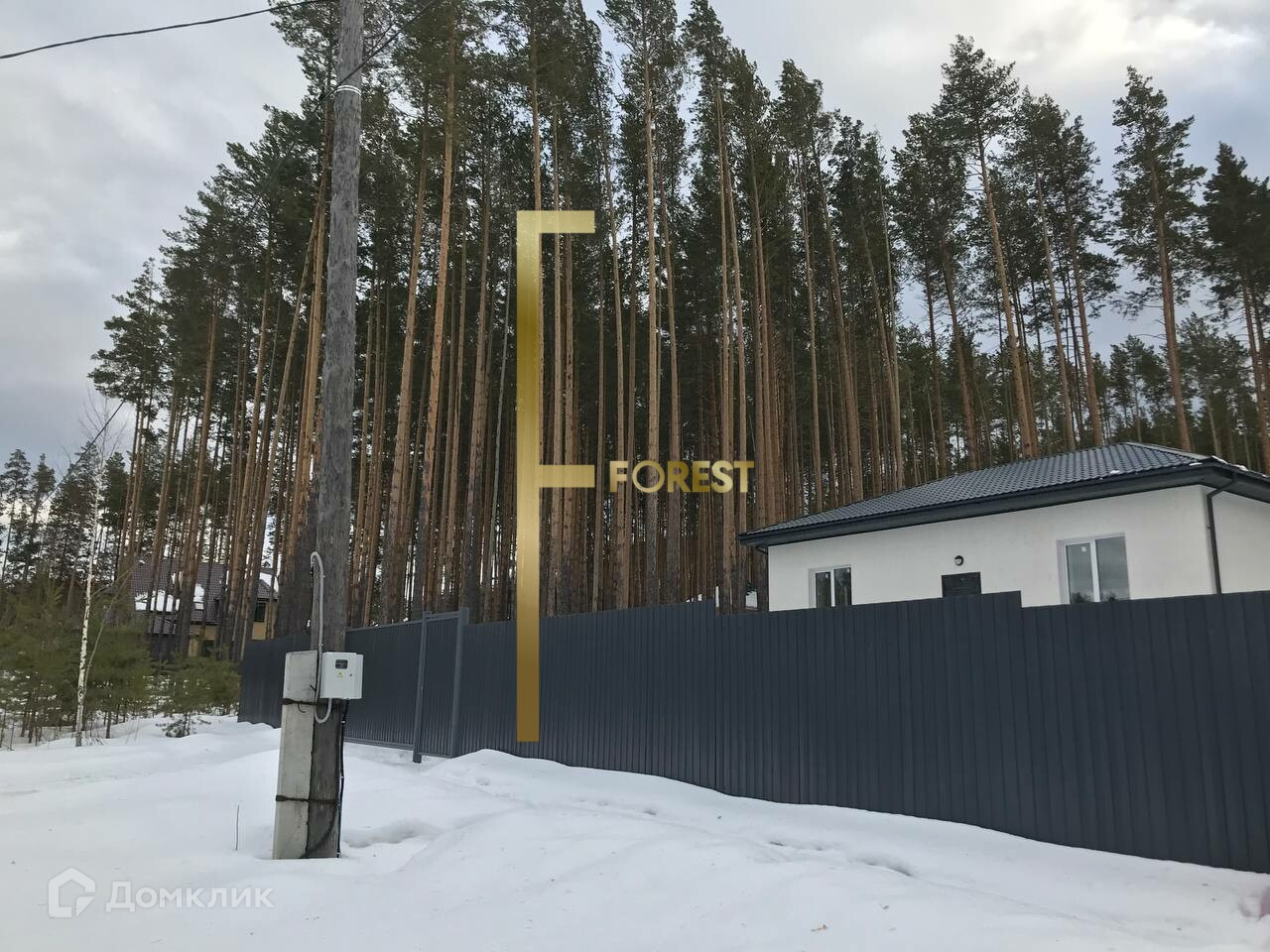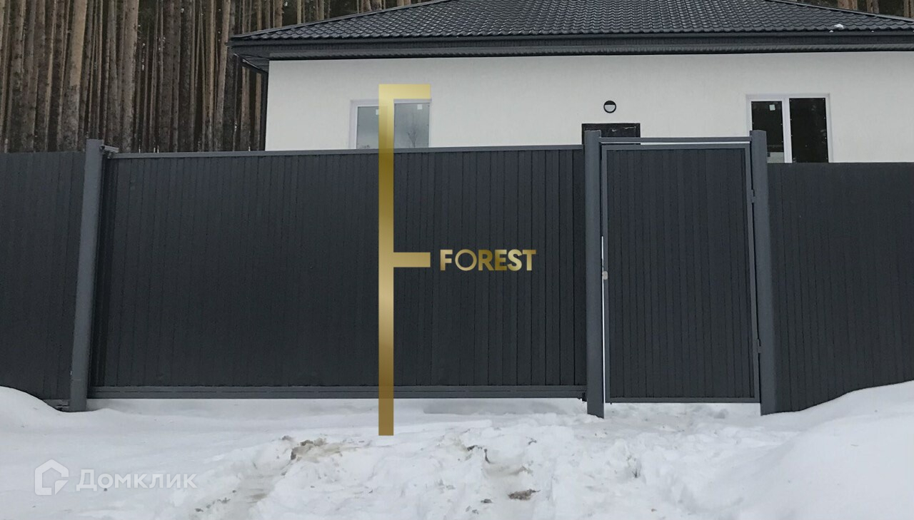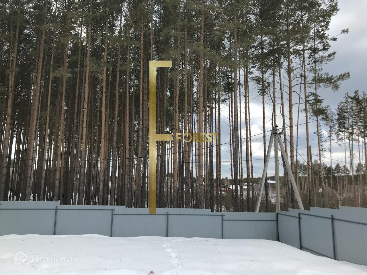 Участок правильной прямоугольной формы, огорожен забором с откатными воротами, находится в окружении соснового леса.