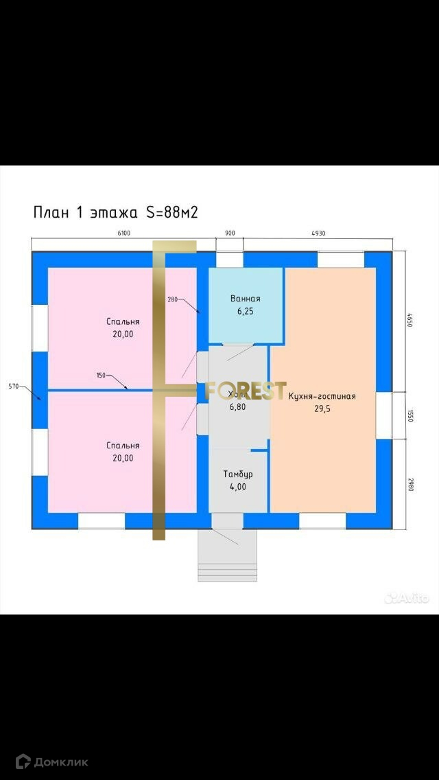 две спальные комнаты по 20 кв.мкухня-гостиная 29,5 кв.мсанузел 6.25 кв.м.
