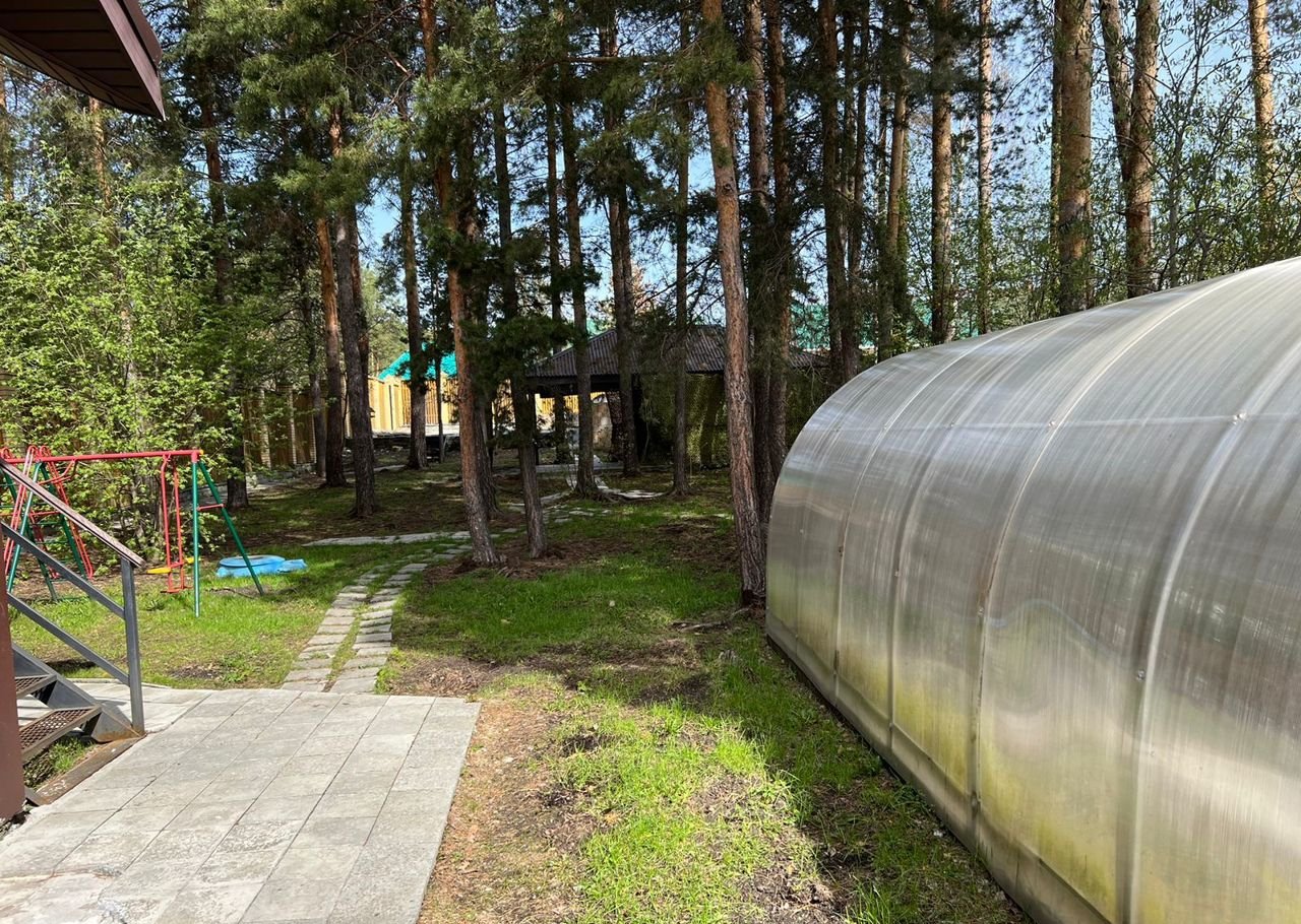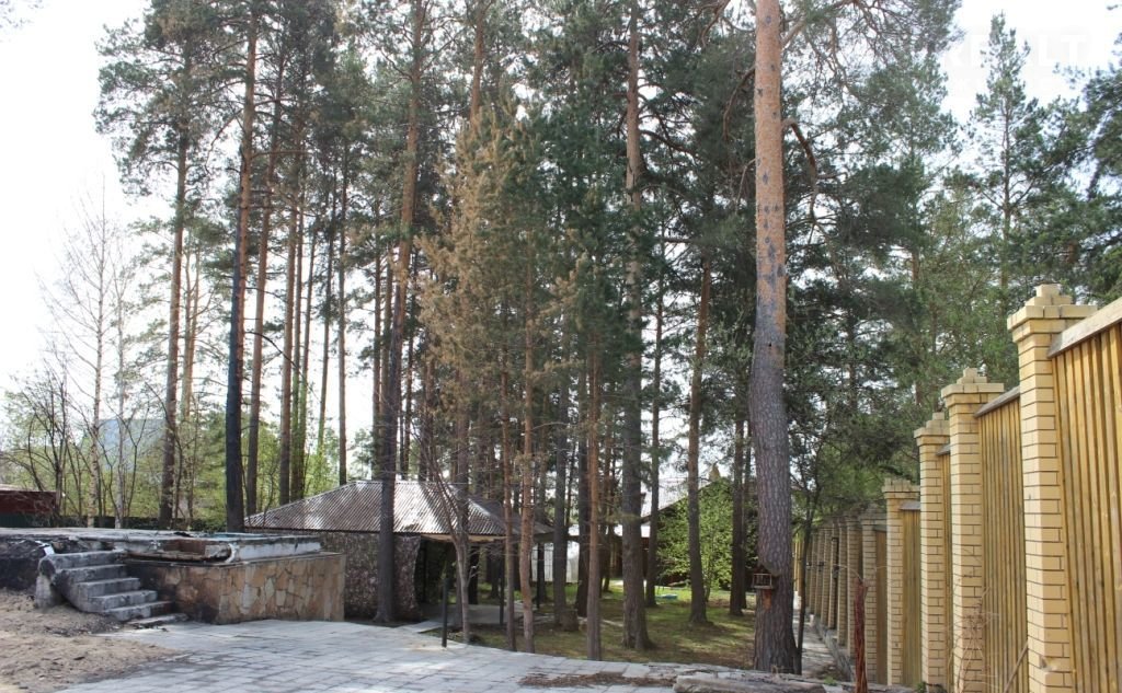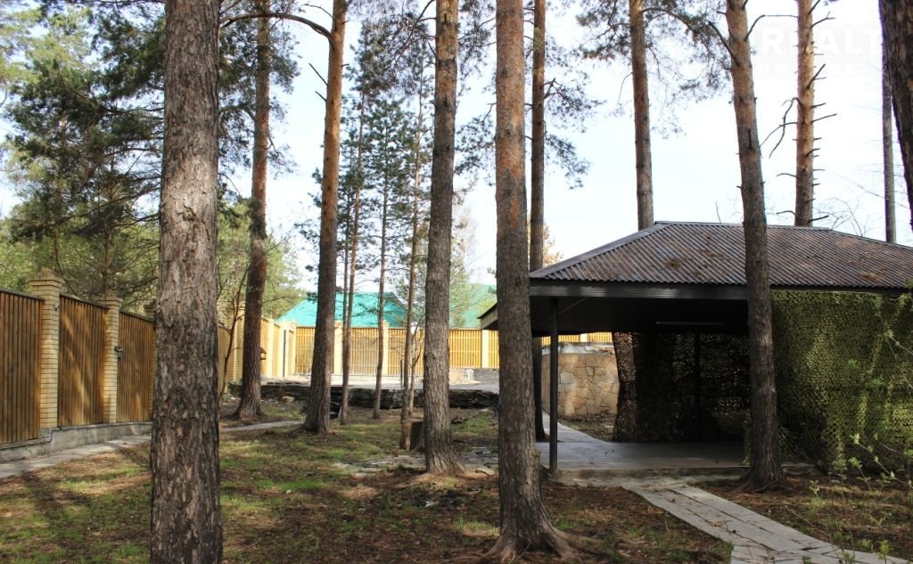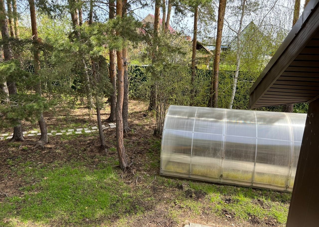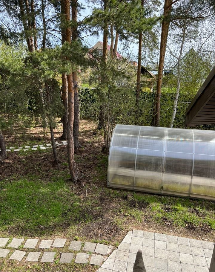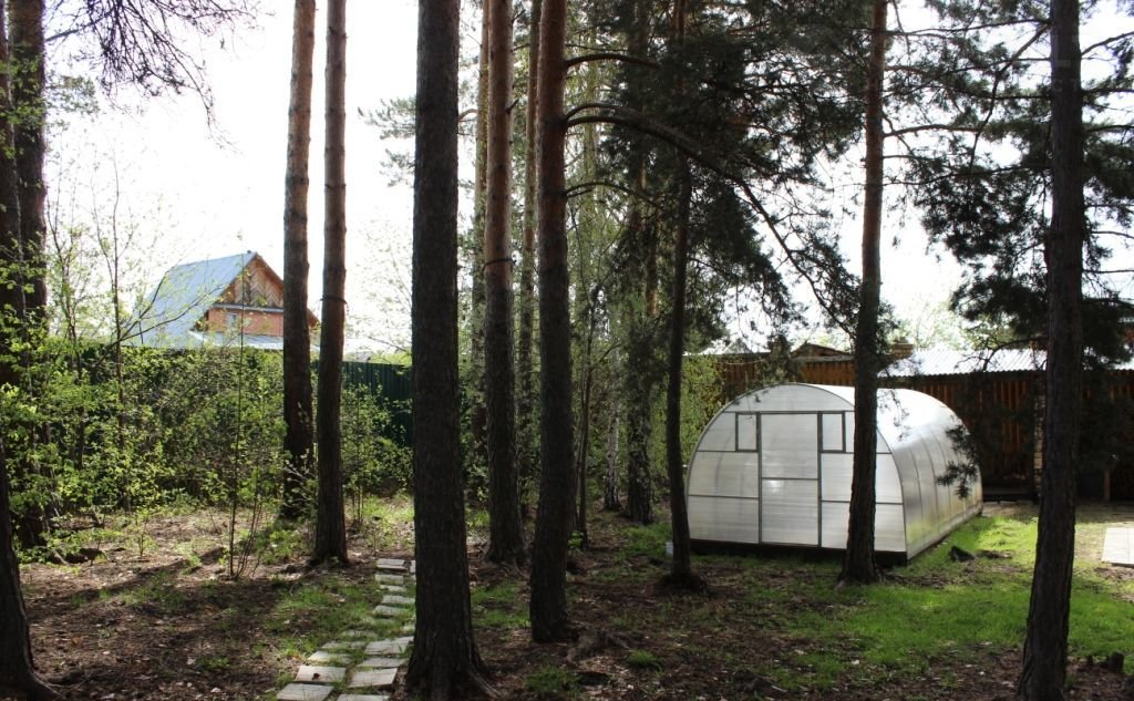 на участке - теплица, сосны, беседка - зона барбекю,