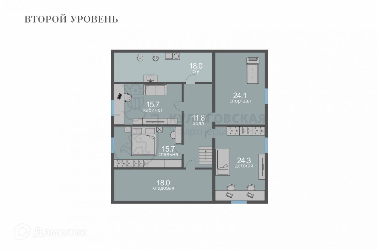 На втором этаже: детская комната, спальня, кабинет, спортзал (остается все спортивный инвентарь), кладовая и санузел. Будущим владельцам остается вся мебель и бытовая техника.