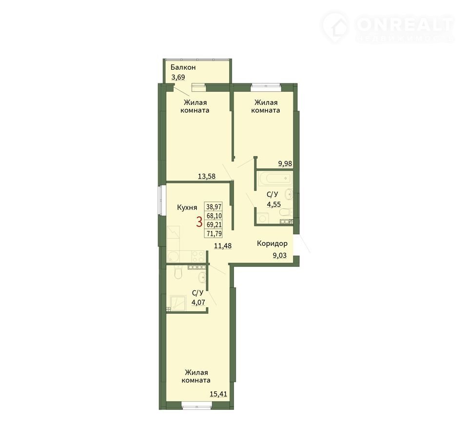 3 комнатная квартира. В ЖК Сказы Вторая очередь. Площадь: 69,21 квадратных метра. Отделка: Предчистовая