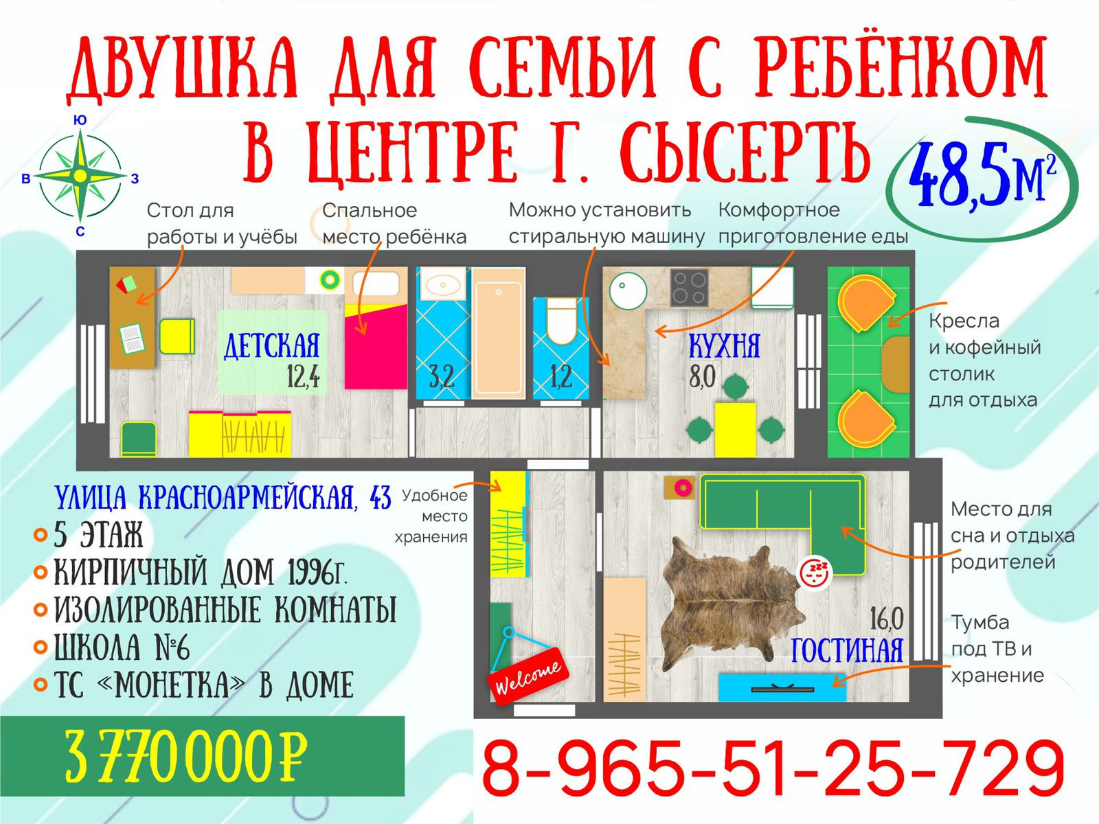 Площадь 48,5 кв.м.