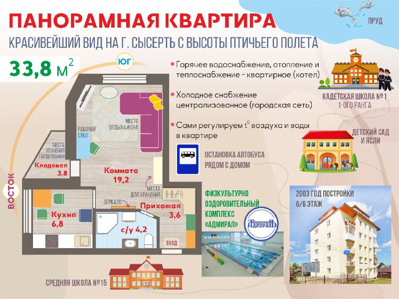 Общая площадь 33.8 м2