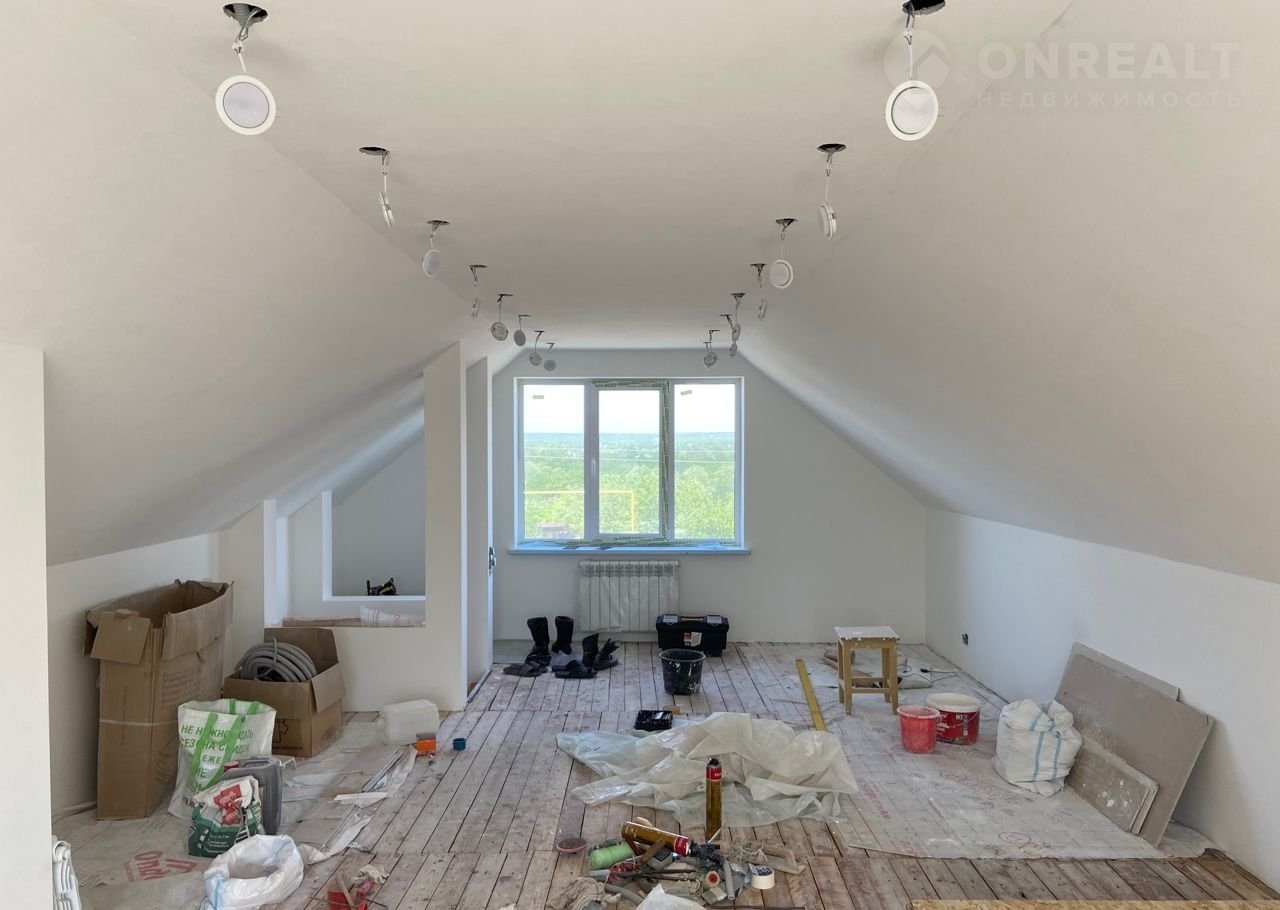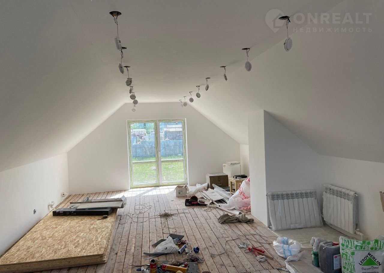 На мансарде потолок и стены зашпаклеваны и подготовлены под окраску, пол из доски, куплены OSB-плиты на всю площадь пола.