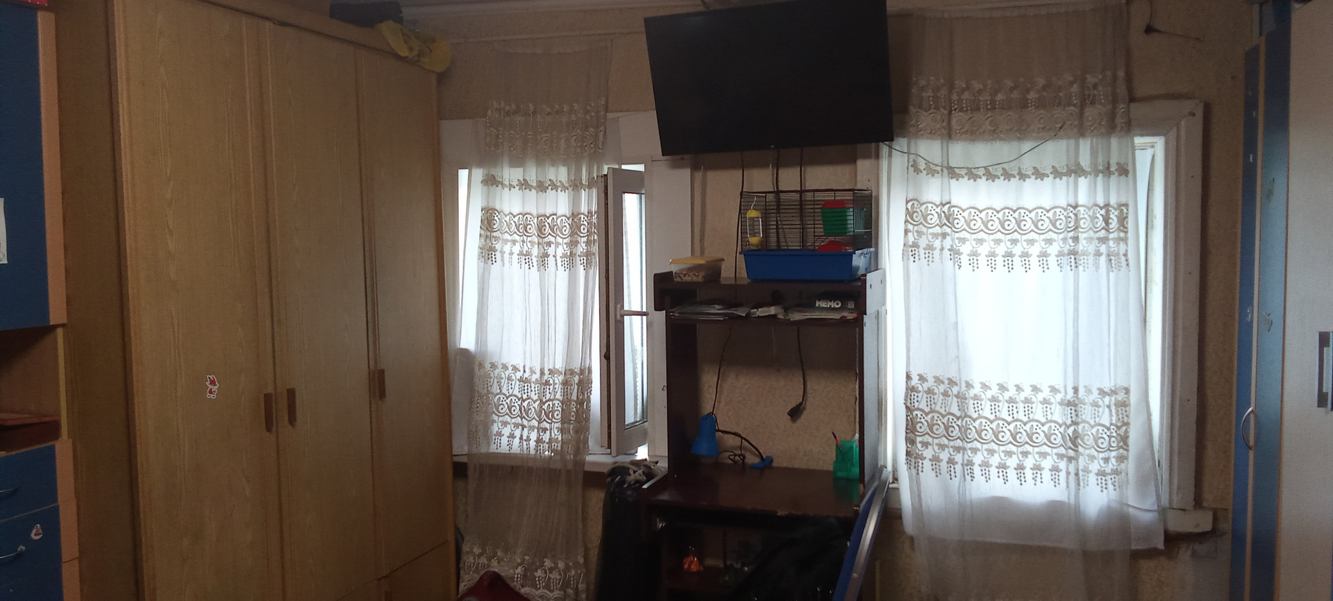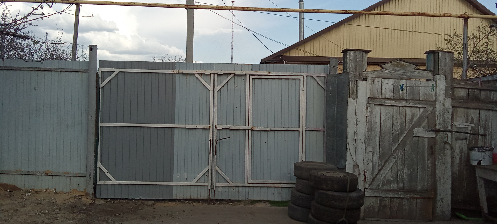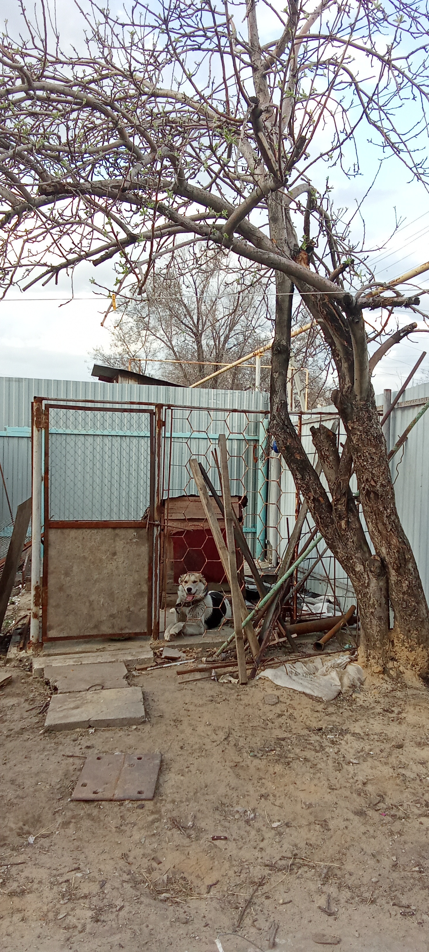Двор бетонированный, есть ворота для машины, огород,яблони, вишня, 2 сарая, кролятники, железный вольер для собаки.