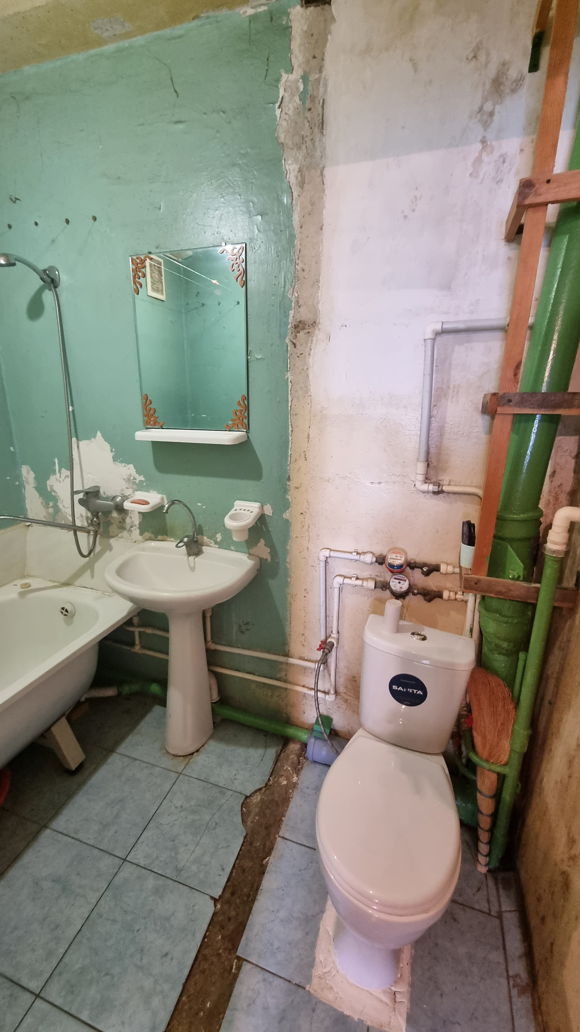 Счётчики на газ, воду и электричество, заменены трубы в санузле.