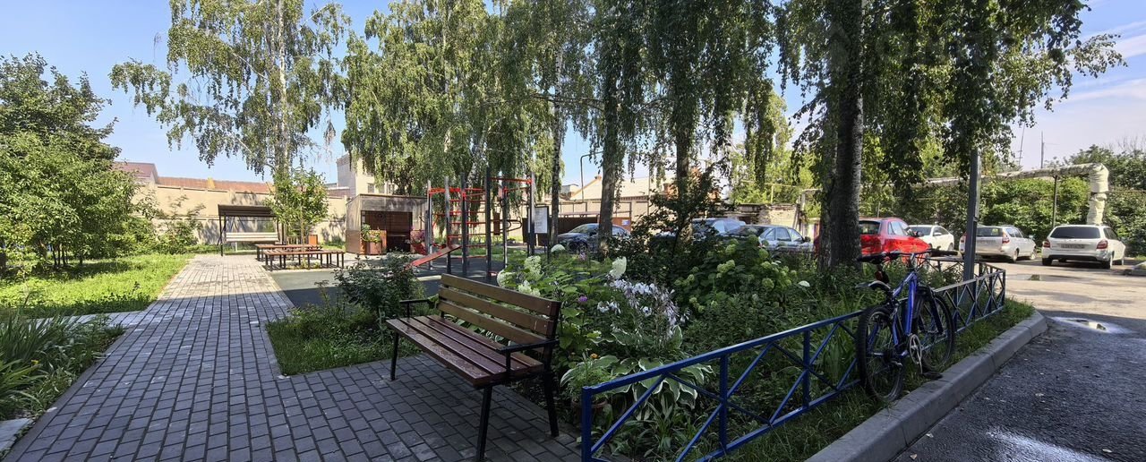 - Озеленённая территория с клумбами и деревьями;