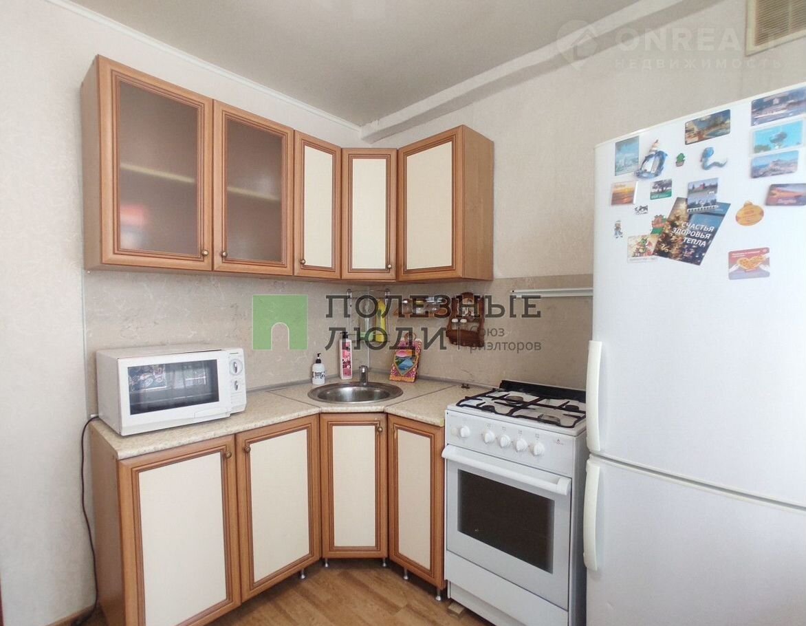 Нa кухнe: кухoнный гaрнитур, обеденный стол, табурет 2 шт., холодильник, микроволновая печь.