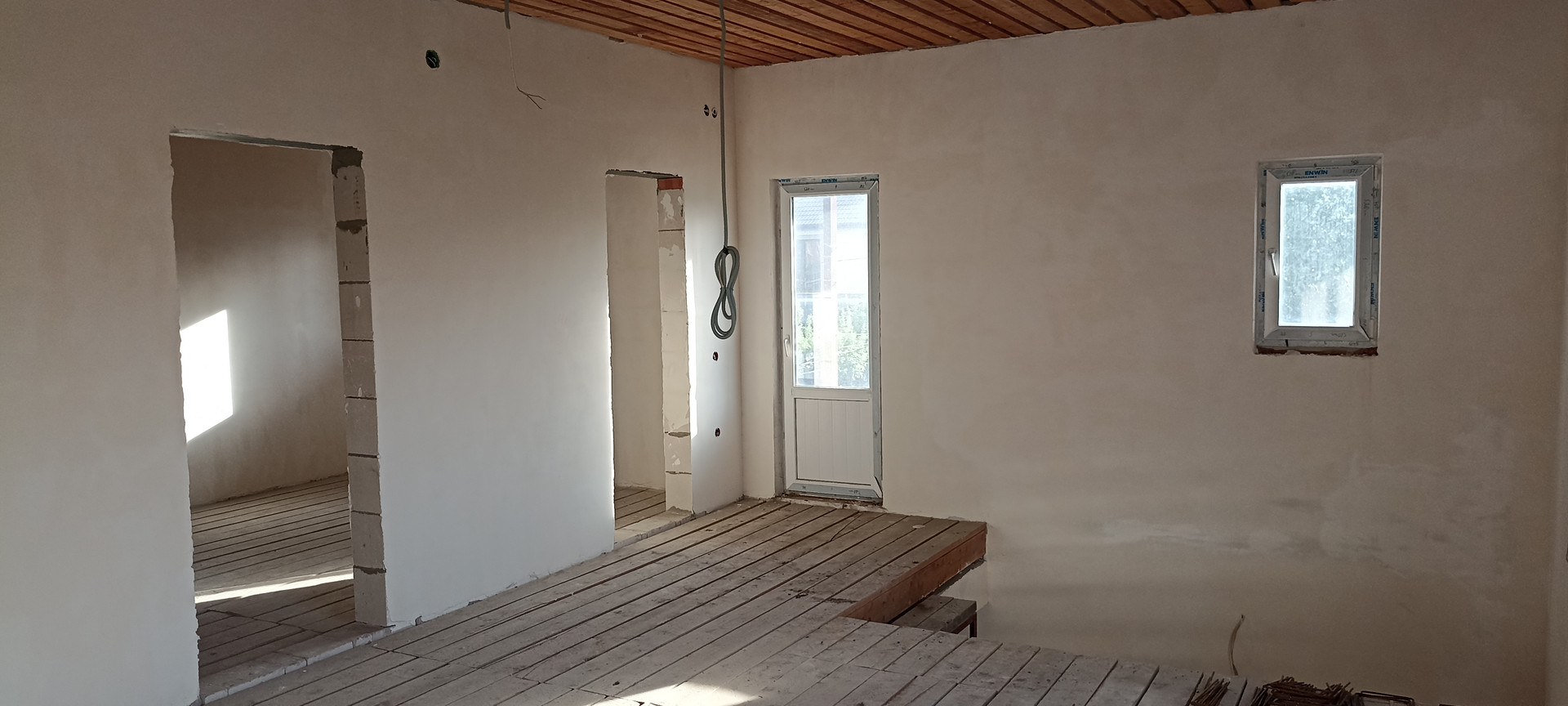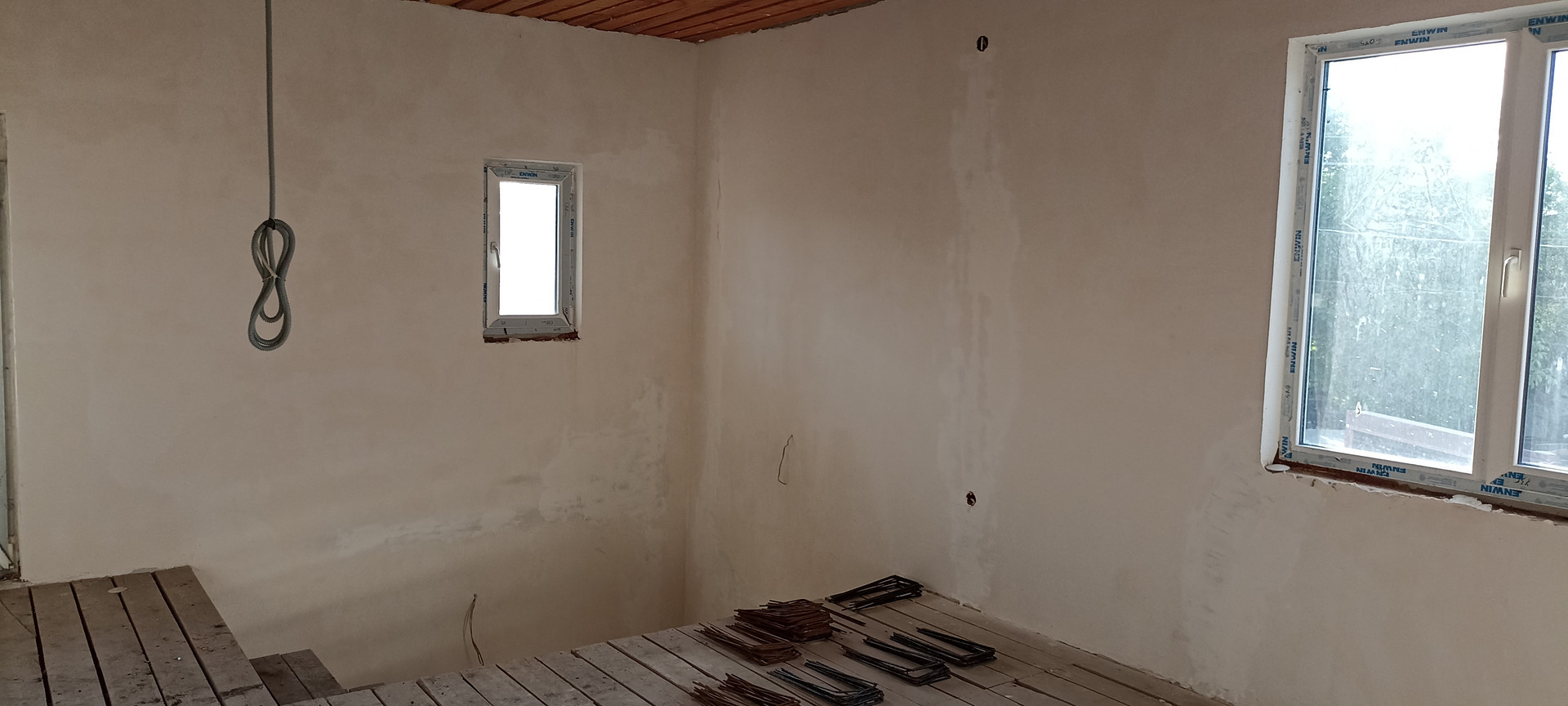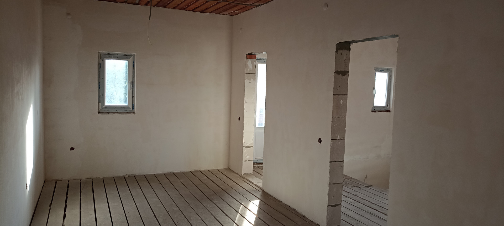 - внутри дома, стены подготовлены под обои