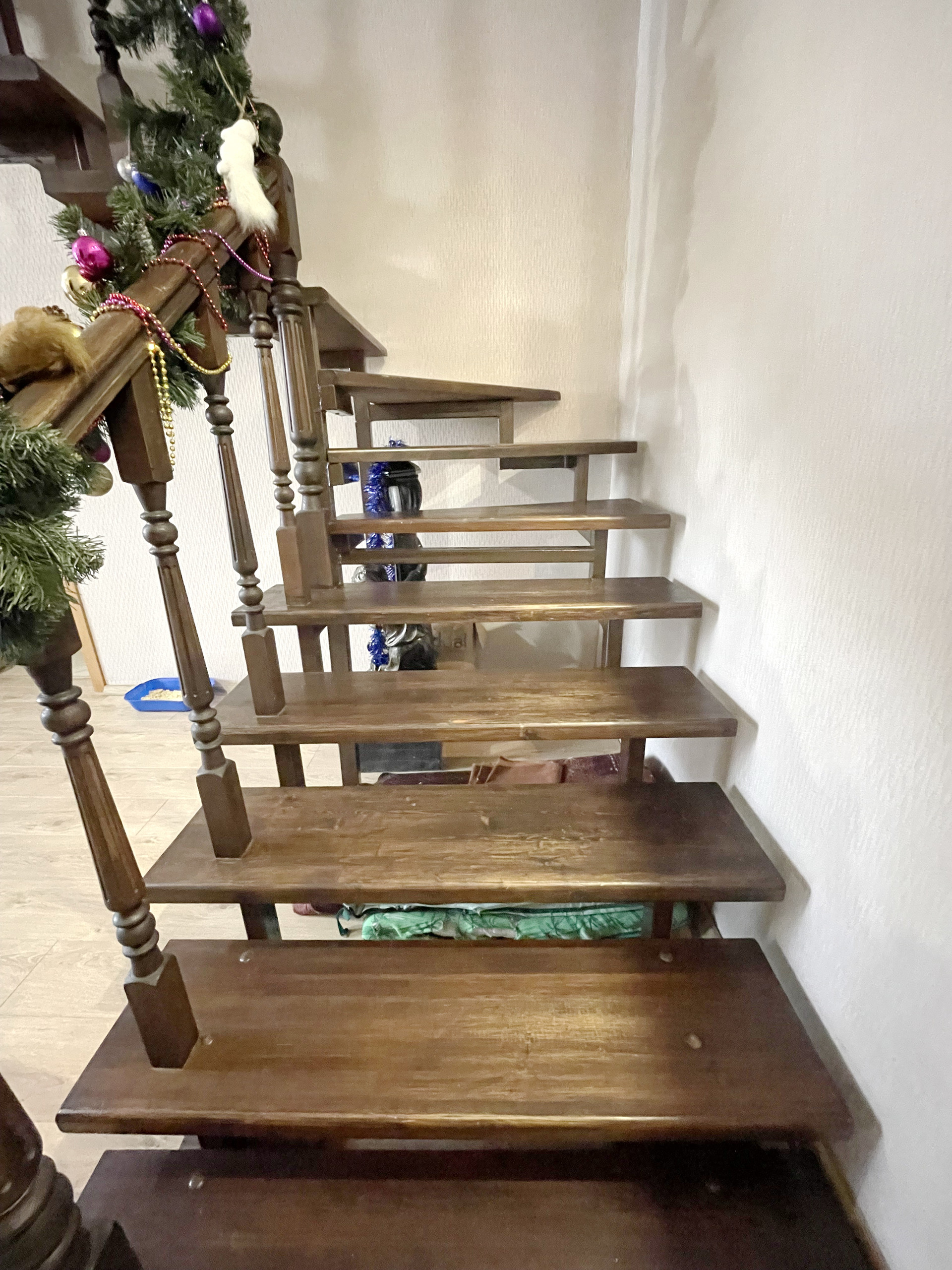 На второй этаж ведет деревянная лестница с удобным шагом для подъёма