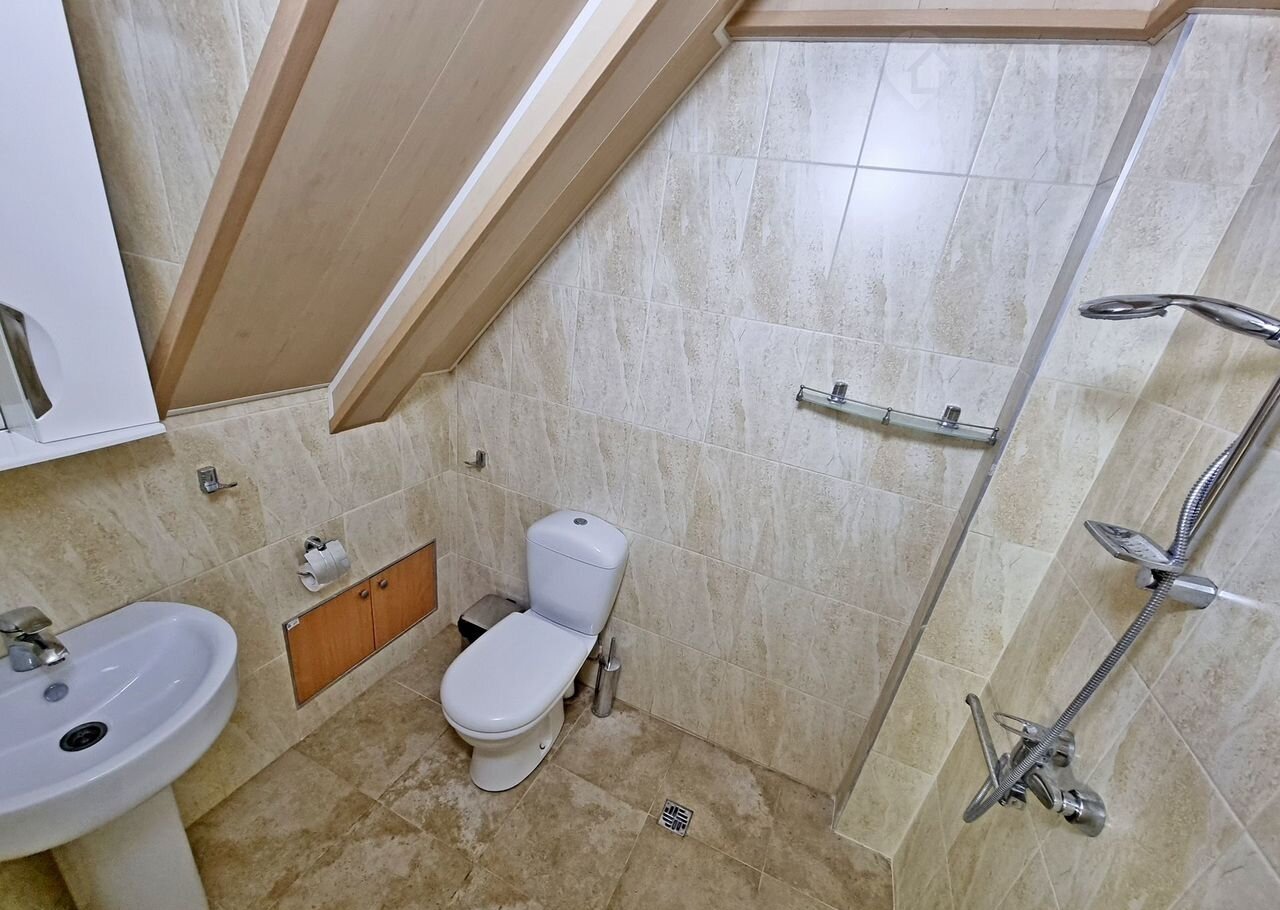 Первый этаж. Прихожая. Висит двухконтурный газовый котел для отопления дома. Дополнительно электрический бойлер для подогрева воды. Накопительный бак. Просторная кухня-гостиная с выходом через балкон к морю. На полу тротуарная плитка, стены и потолок обшиты пластиком. Просторный санузел, совмещенный с ванной комнатой. Стены и пол в плитке. Потолок обшит пластиком.