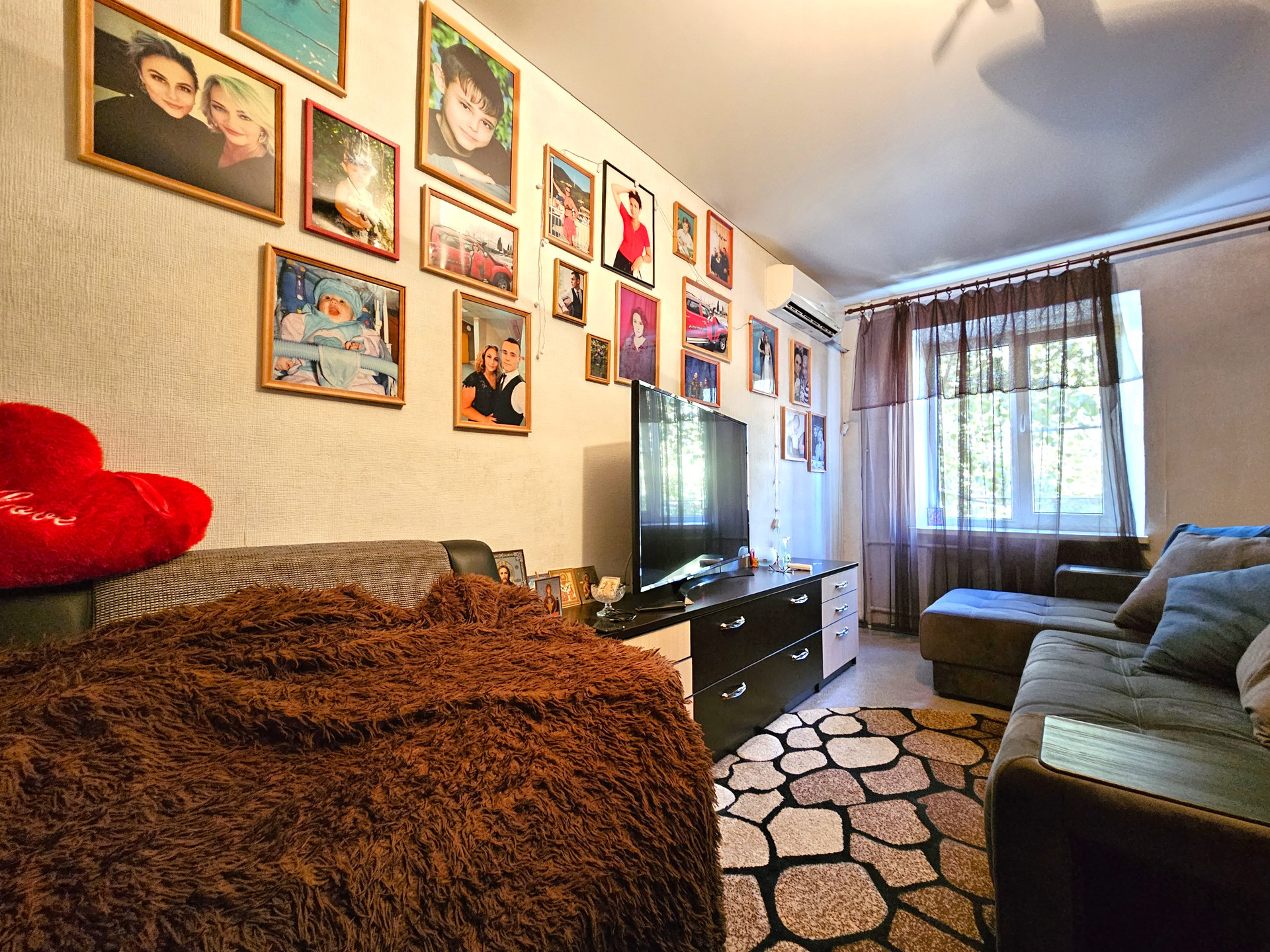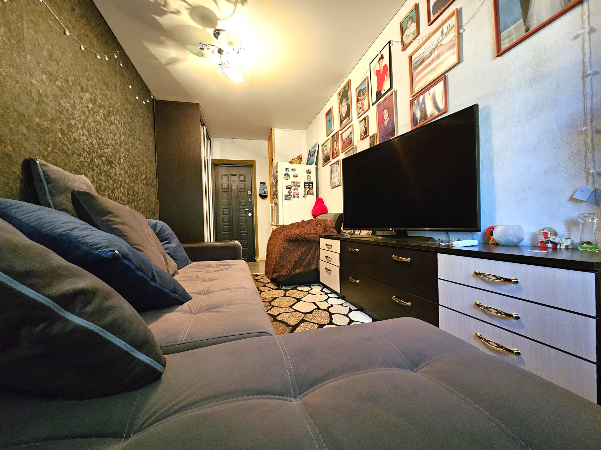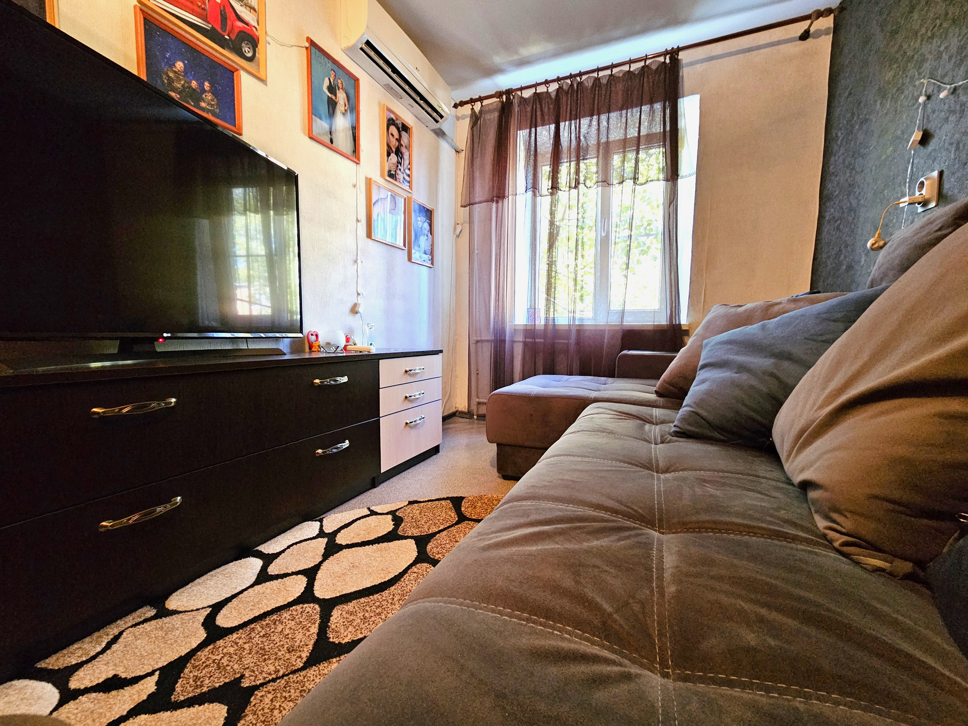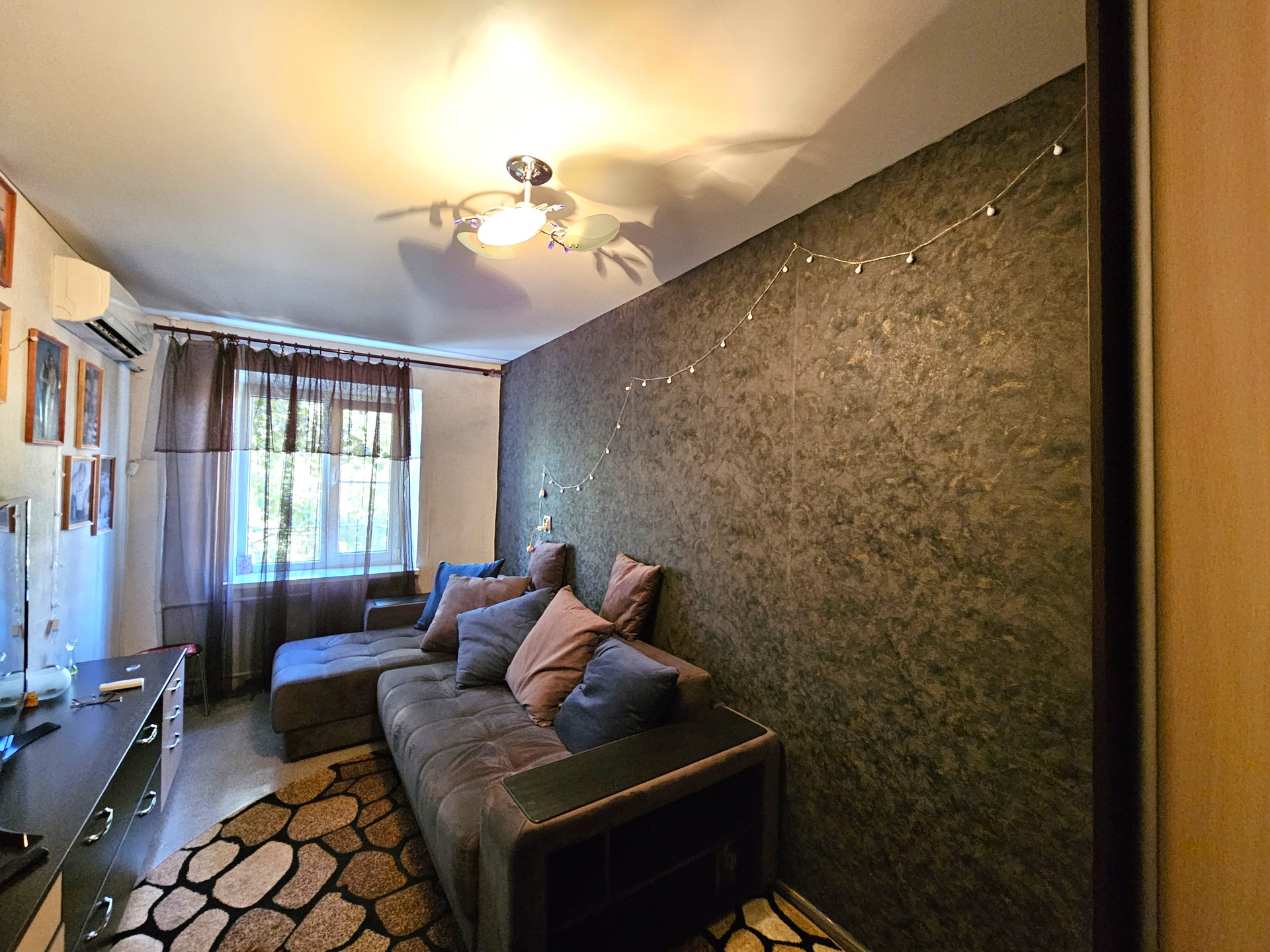 - В комнате расположен новый двухспальный раскладной диван, сплит система, натяжной потолок, темба под ТВ., раскладное кресло, холодильник, шкаф купе., заменен радиатор отопления, новая проводка, новые световые приборы, имеется кладовая, которую можно переделать под С/У.