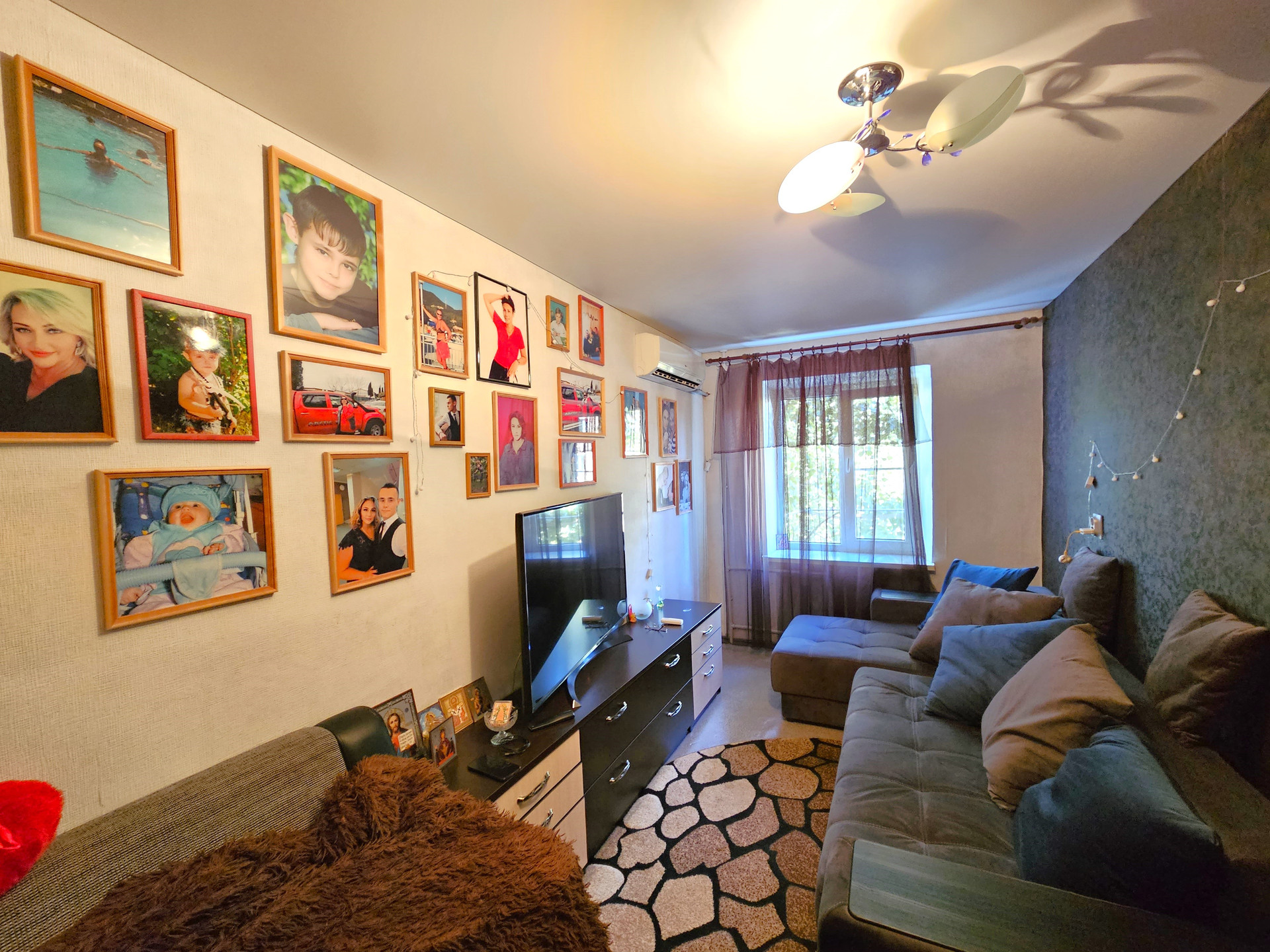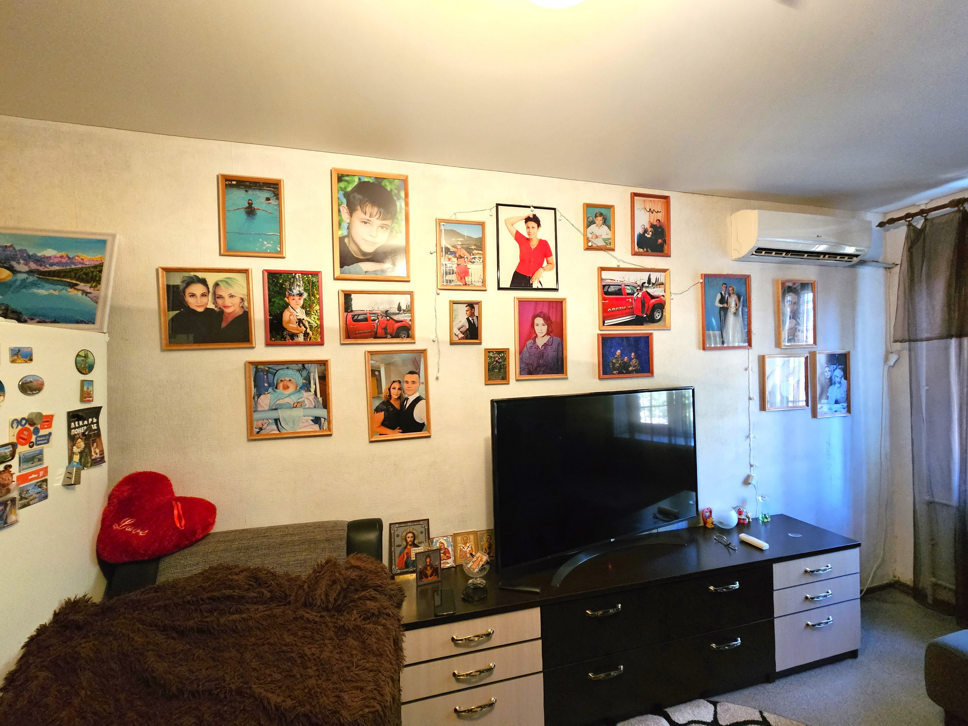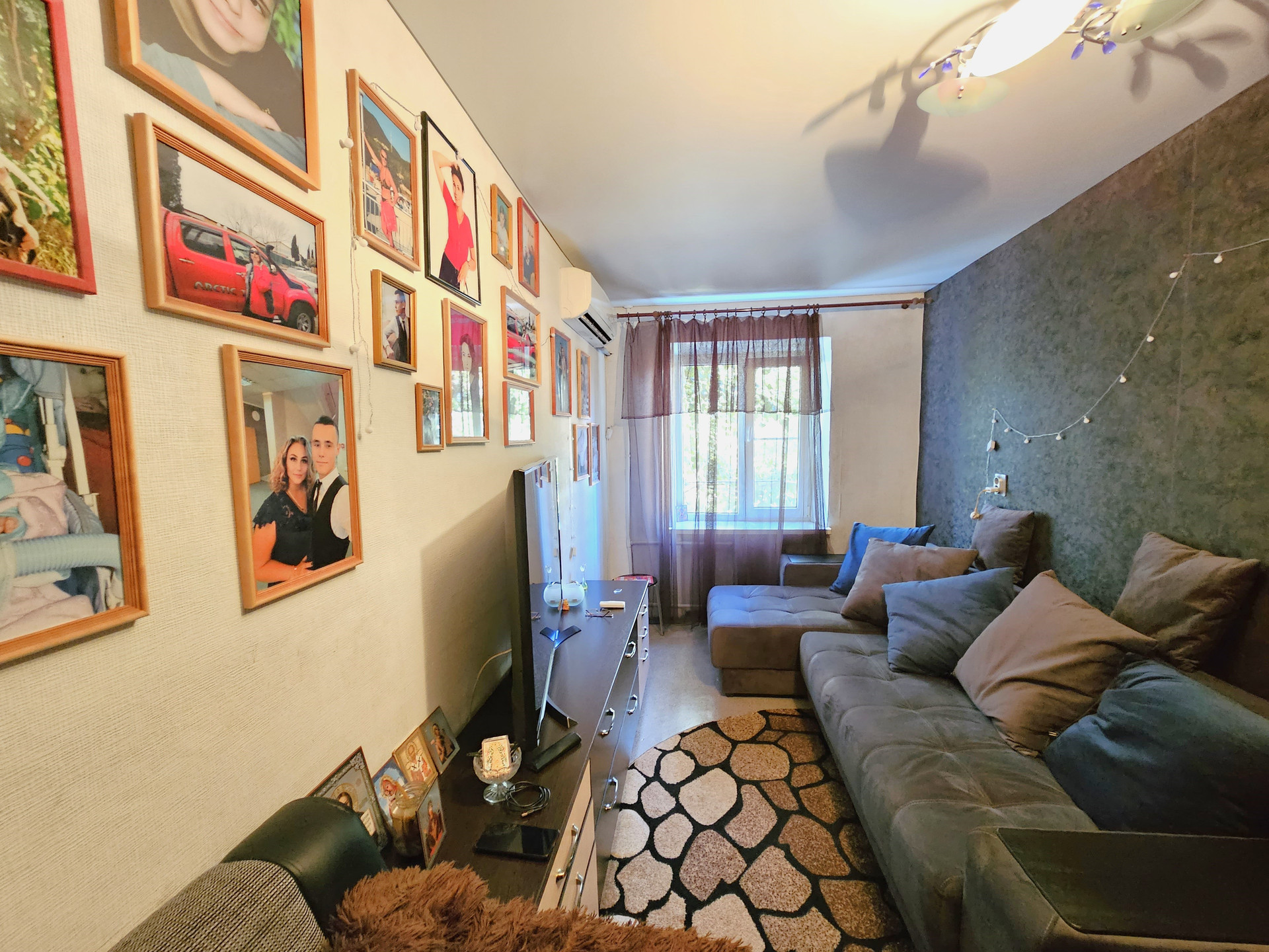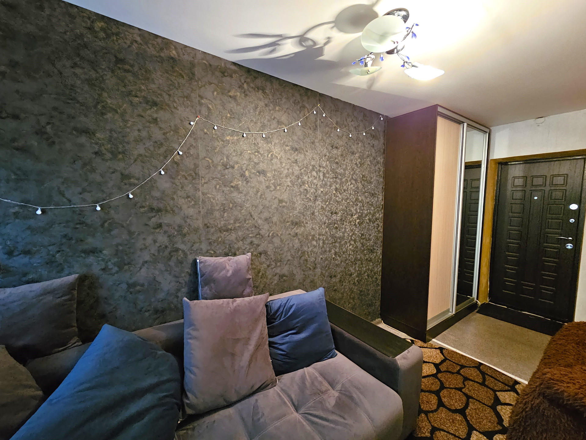 - В комнате расположен новый двухспальный раскладной диван, сплит система, натяжной потолок, темба под ТВ., раскладное кресло, холодильник, шкаф купе., заменен радиатор отопления, новая проводка, новые световые приборы, имеется кладовая, которую можно переделать под С/У.