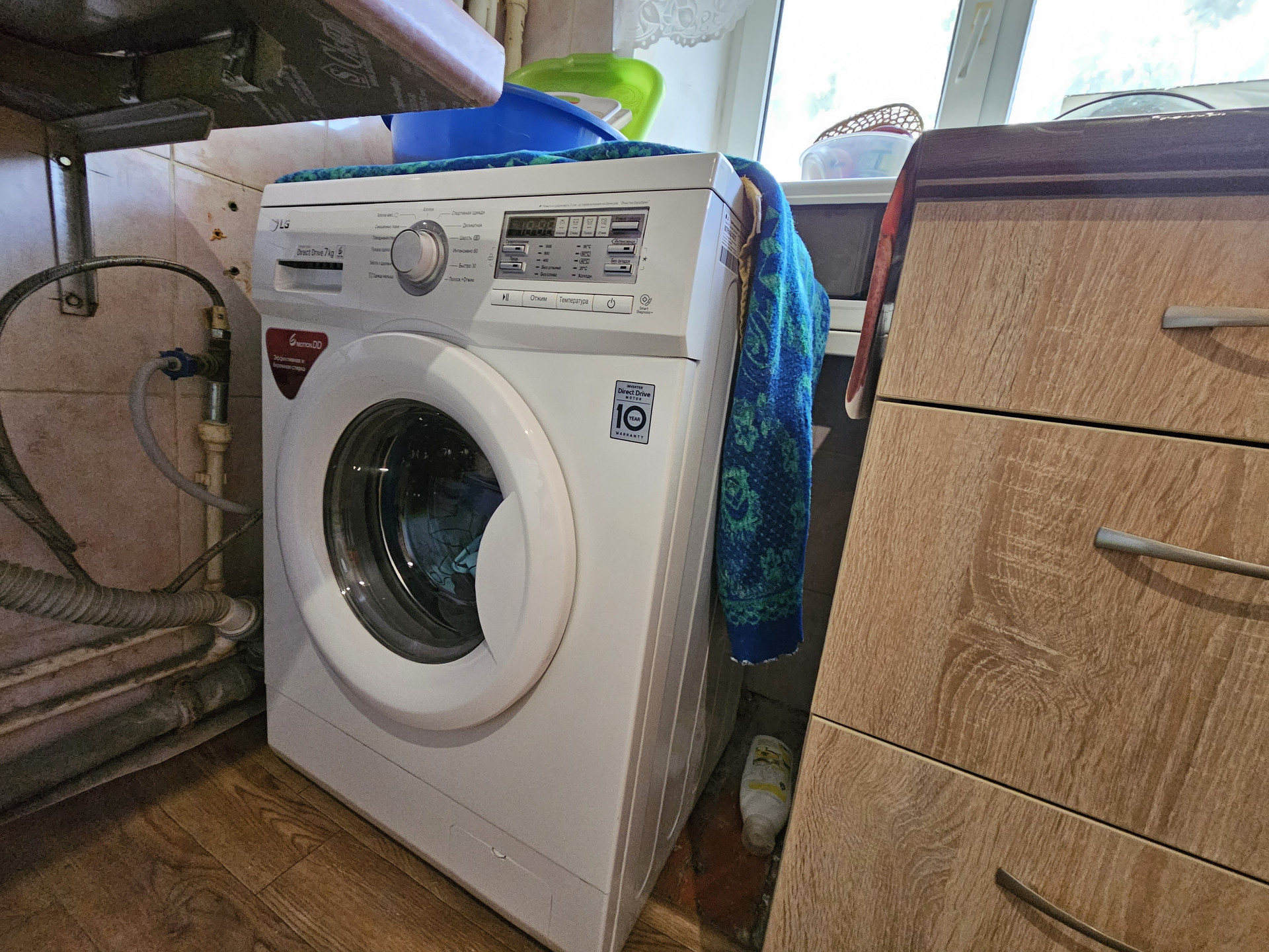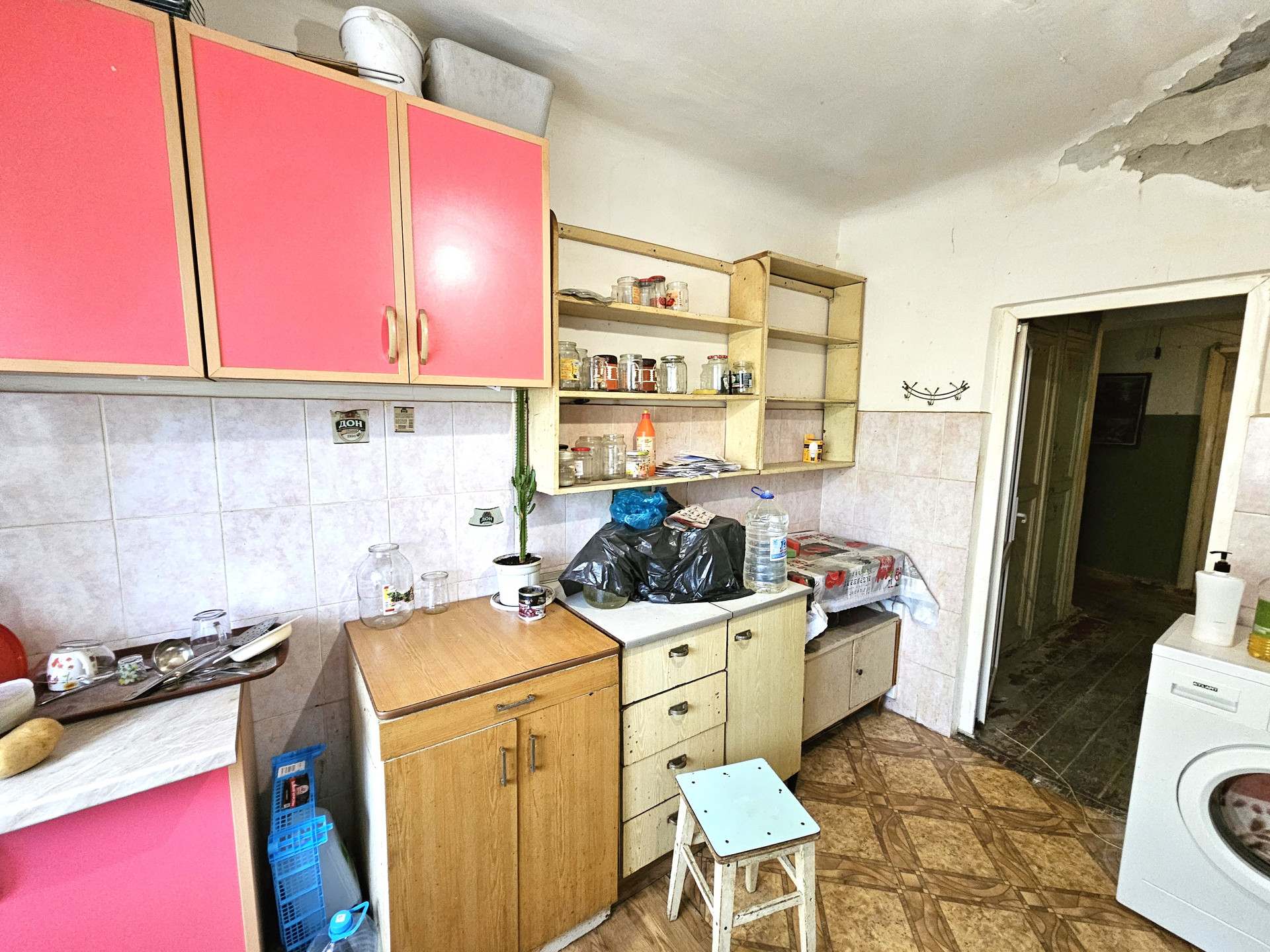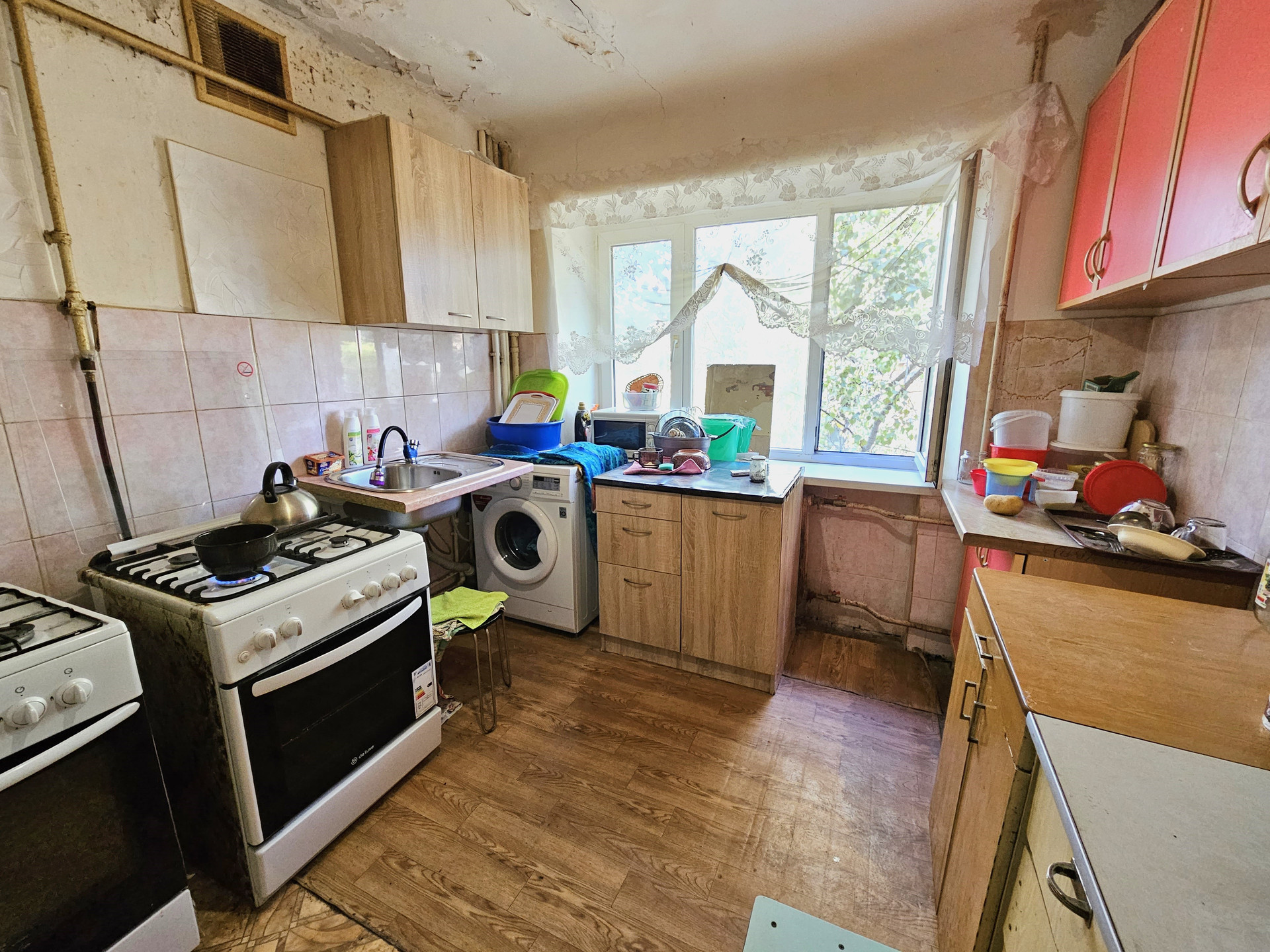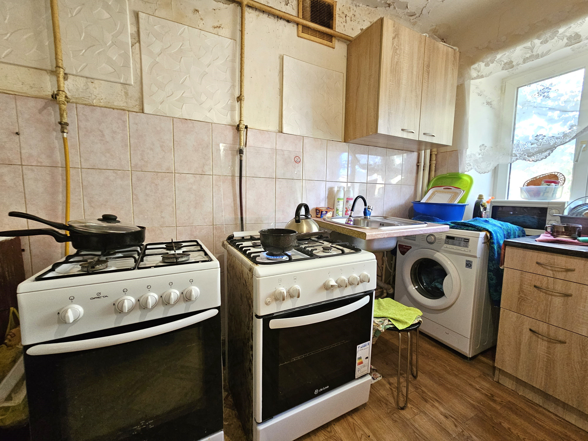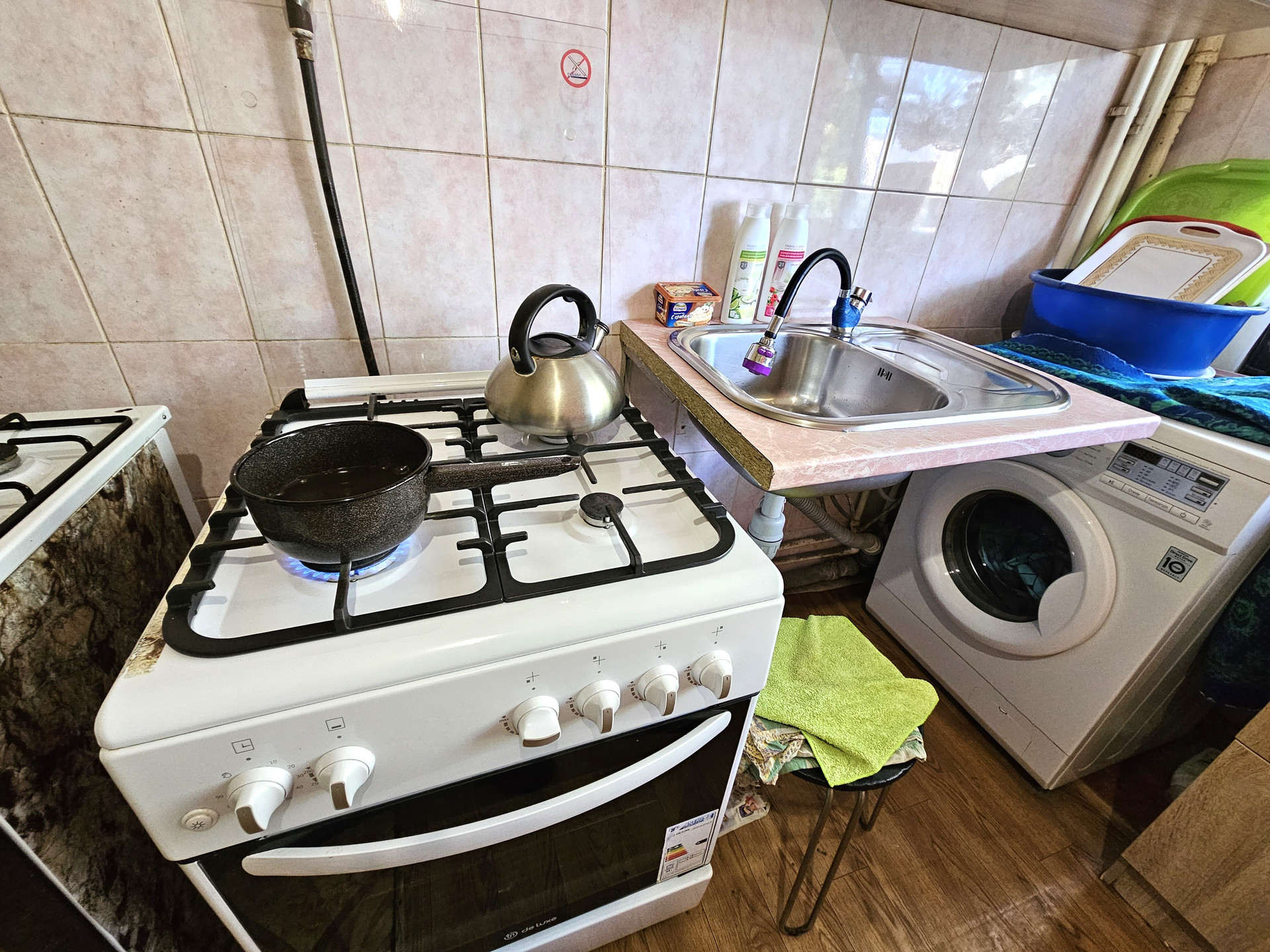 - На кухне своя газовая плита, раковина и стиральная машина.