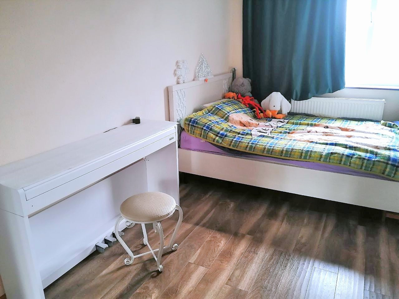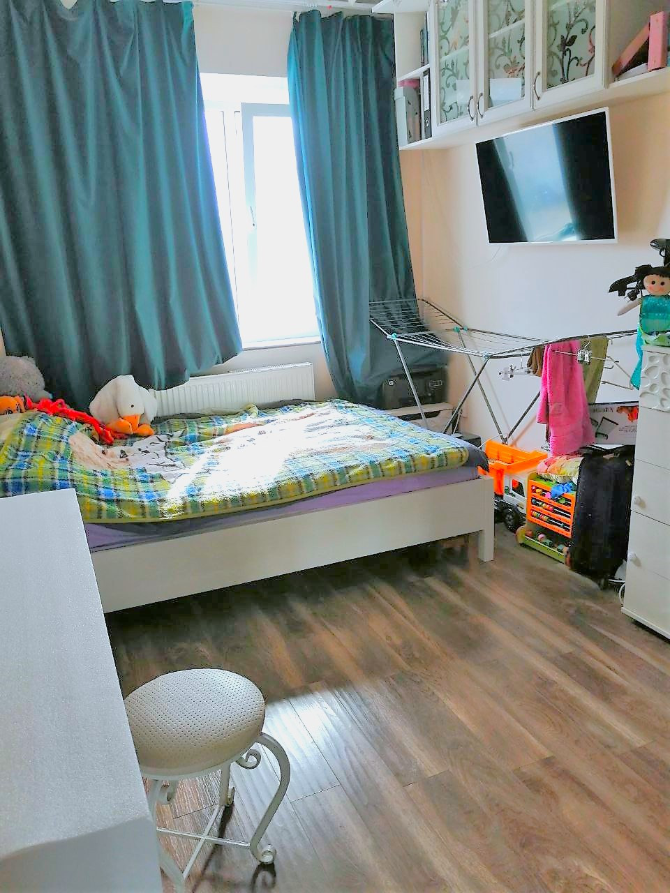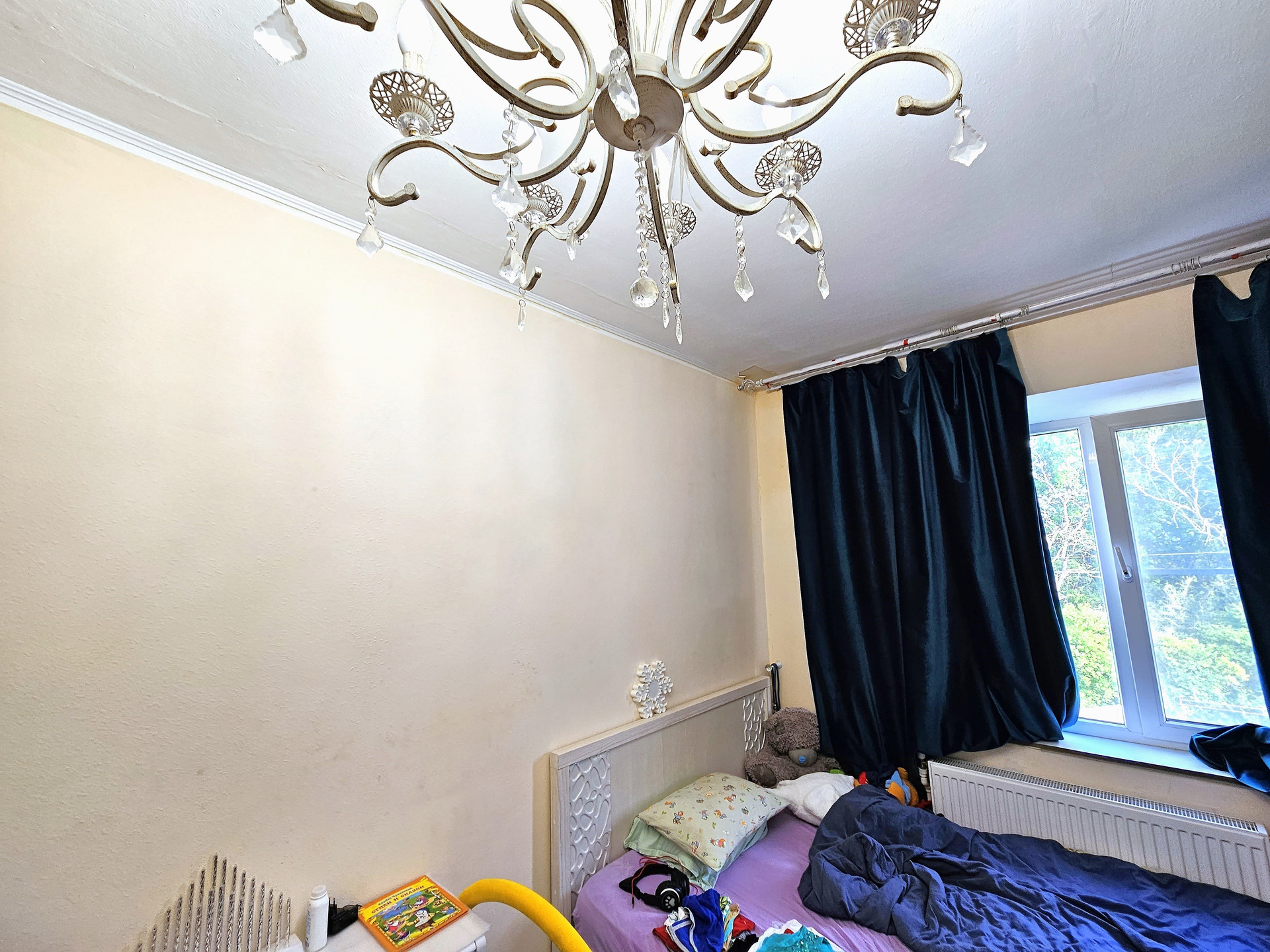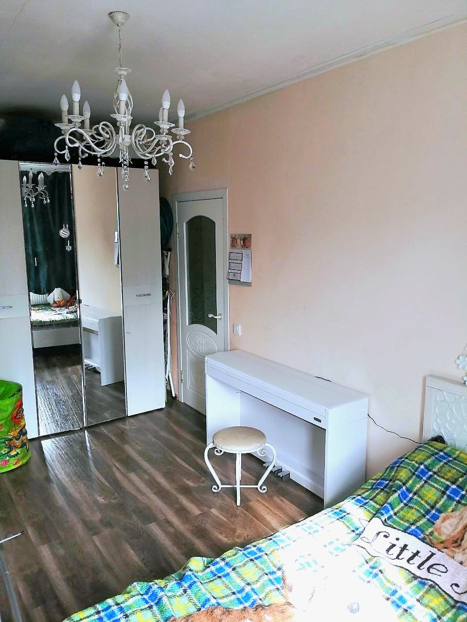 - В комнате расположена двухспальная кровать, на полу ламинат, окна м/п, поменяны радиаторы отопления, проводка заменена.