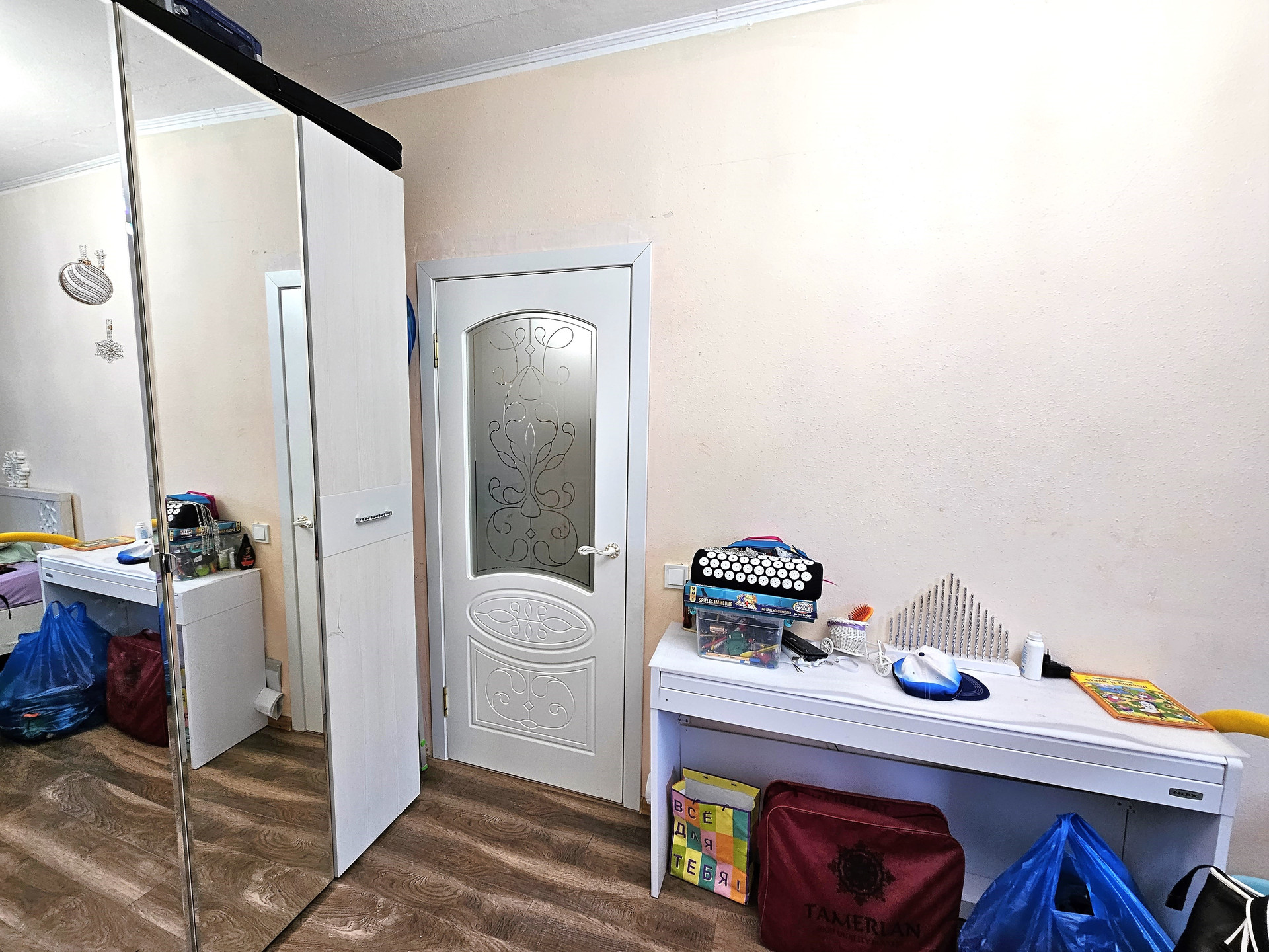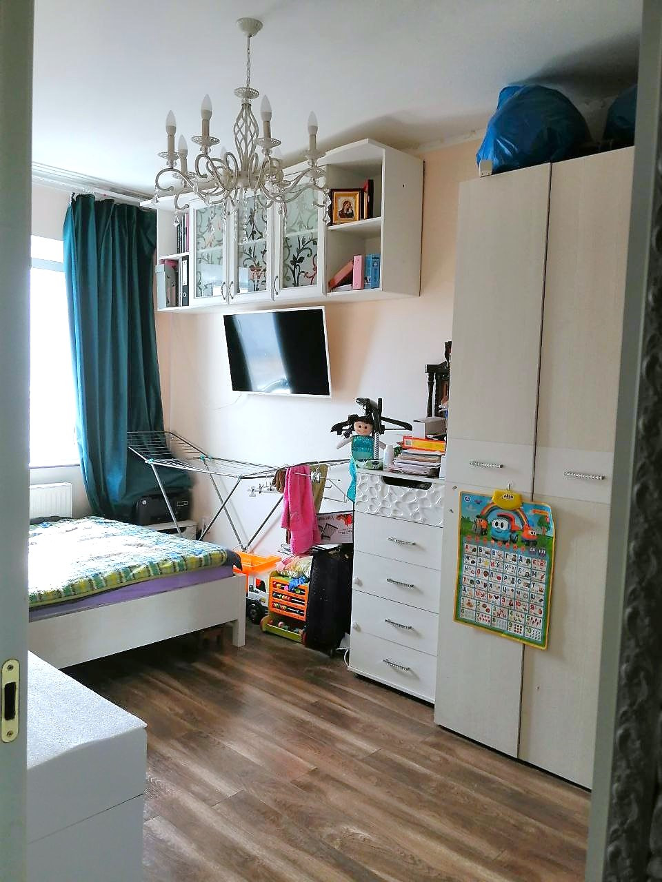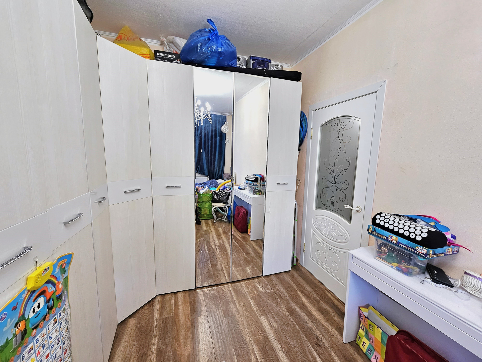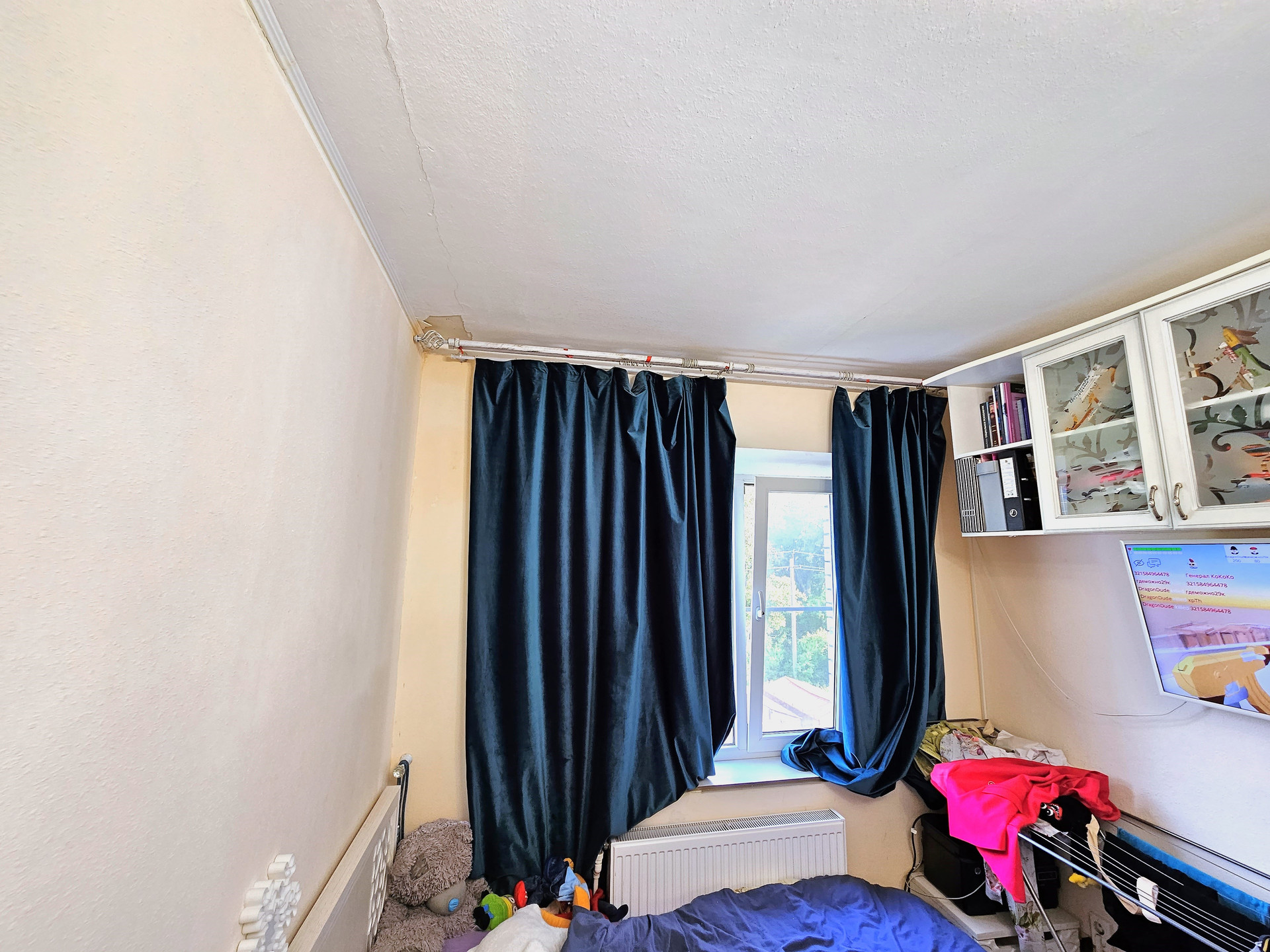 - В комнате расположена двухспальная кровать, на полу ламинат, окна м/п, поменяны радиаторы отопления, проводка заменена.