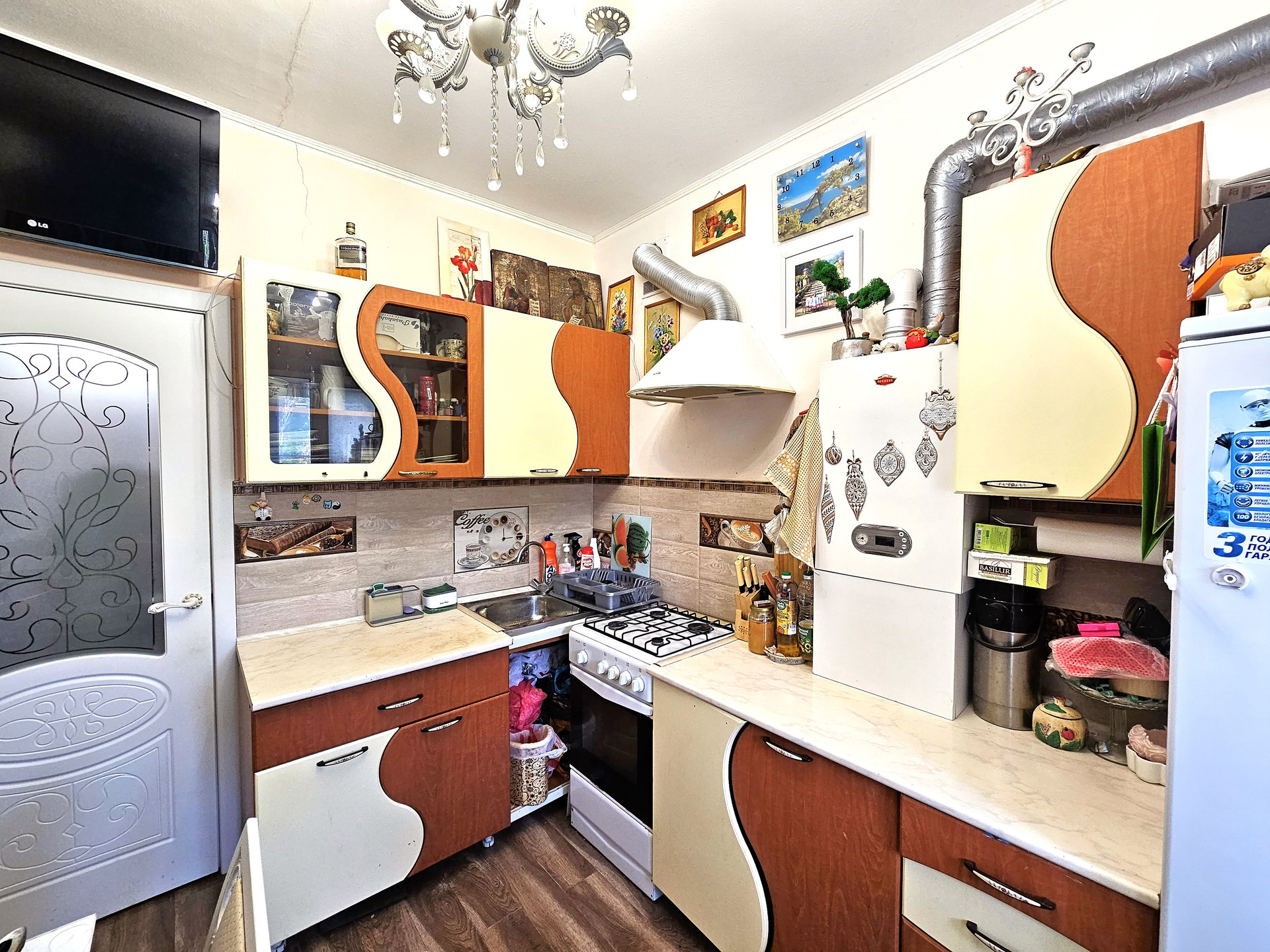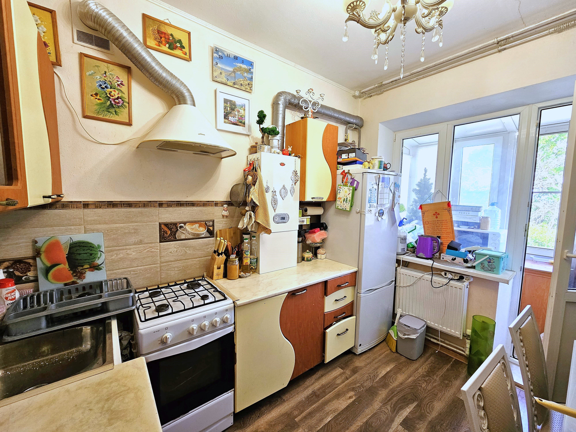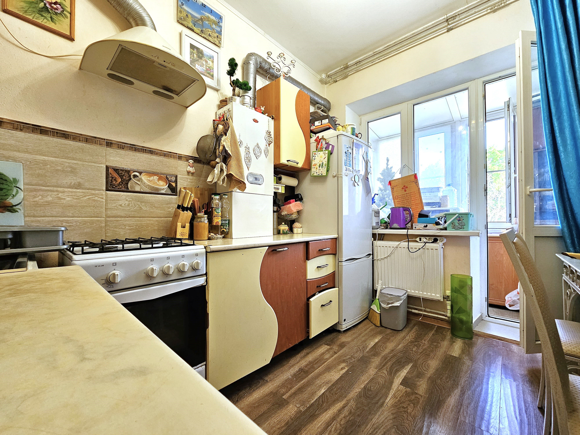 - На кухне кухонный гарнитур, вытяжка, двухконтурный котел, газовая плита, новый ламинат и радиаторы отопления. Выход на балкон