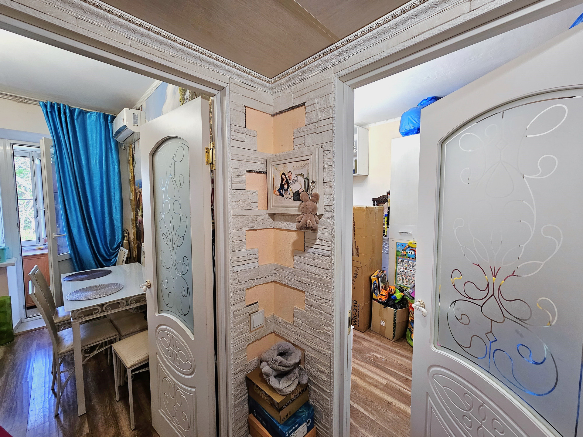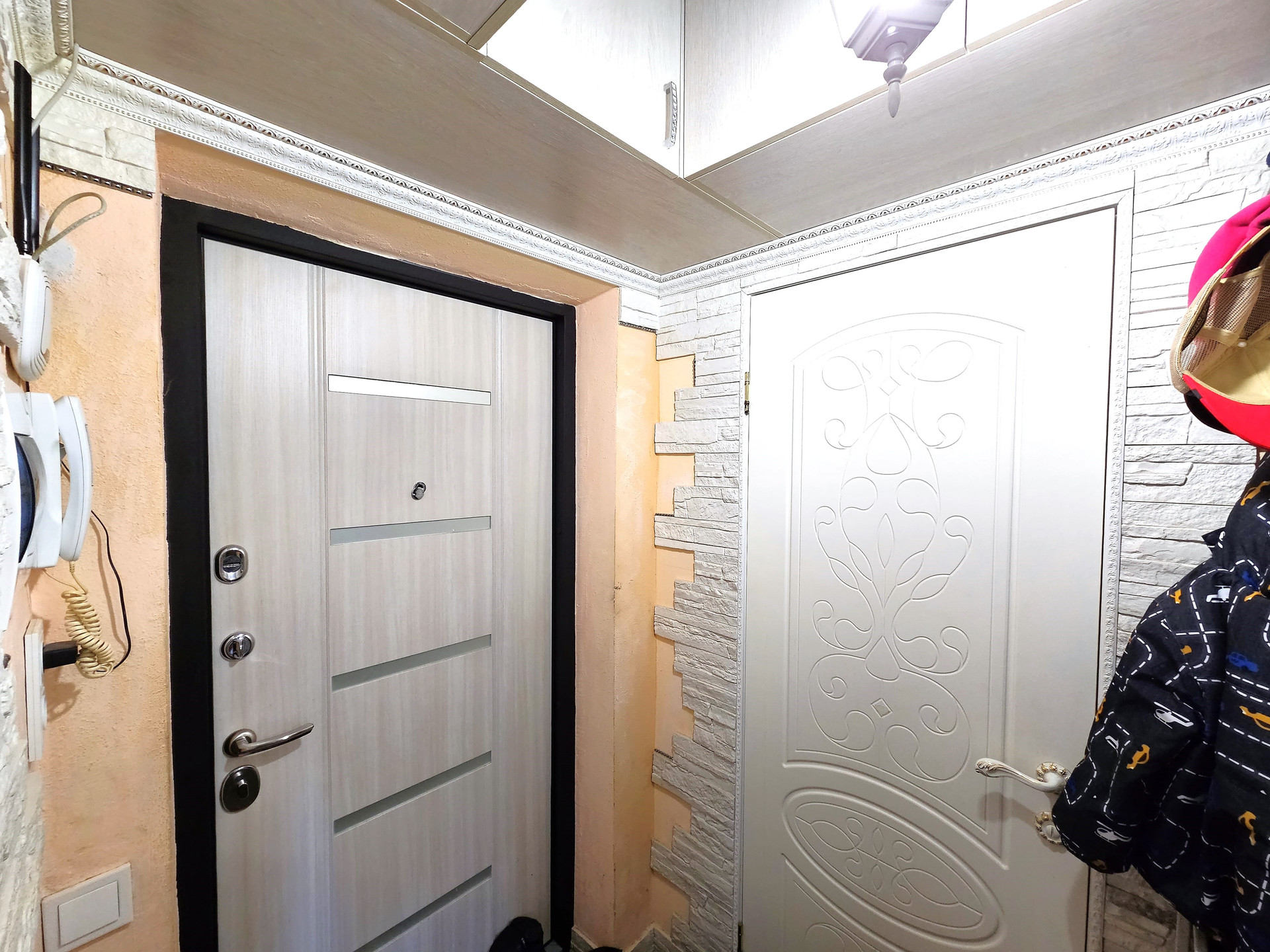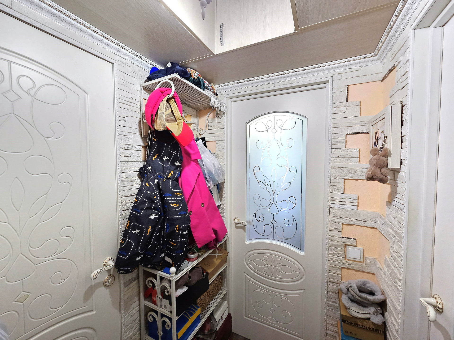 - В коридоре декоративная плитка, удобные нише для хранения вещей.