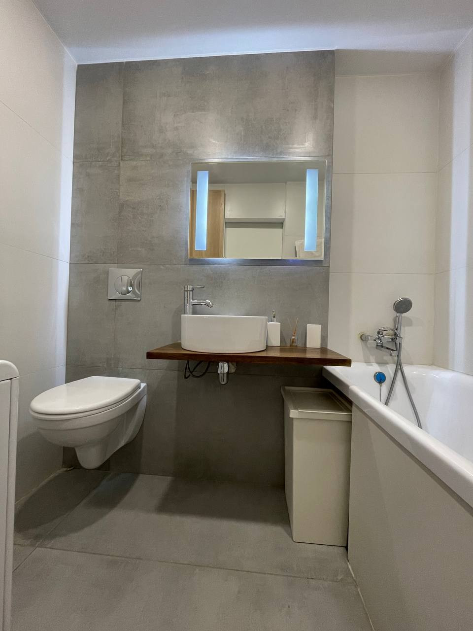 В ванной комнате уложен крупноформатный керамогранит. На полу электрический теплый пол. Качественная инсталляция, и накладной умывальник на подставке из массива натурального дуба (обработанного спец составом).