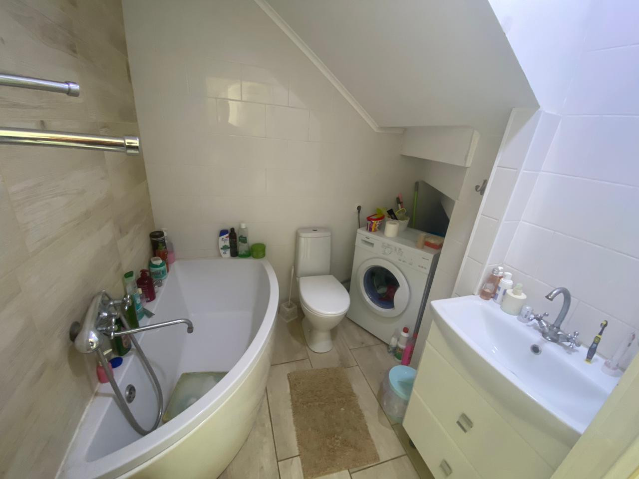Общая площадь 60м2, на первом этаже просторная кухня-гостиная 25м2, совместный санузел (кафель) и коридор с тёплым полом. Второй этаж спальня и детская комната.