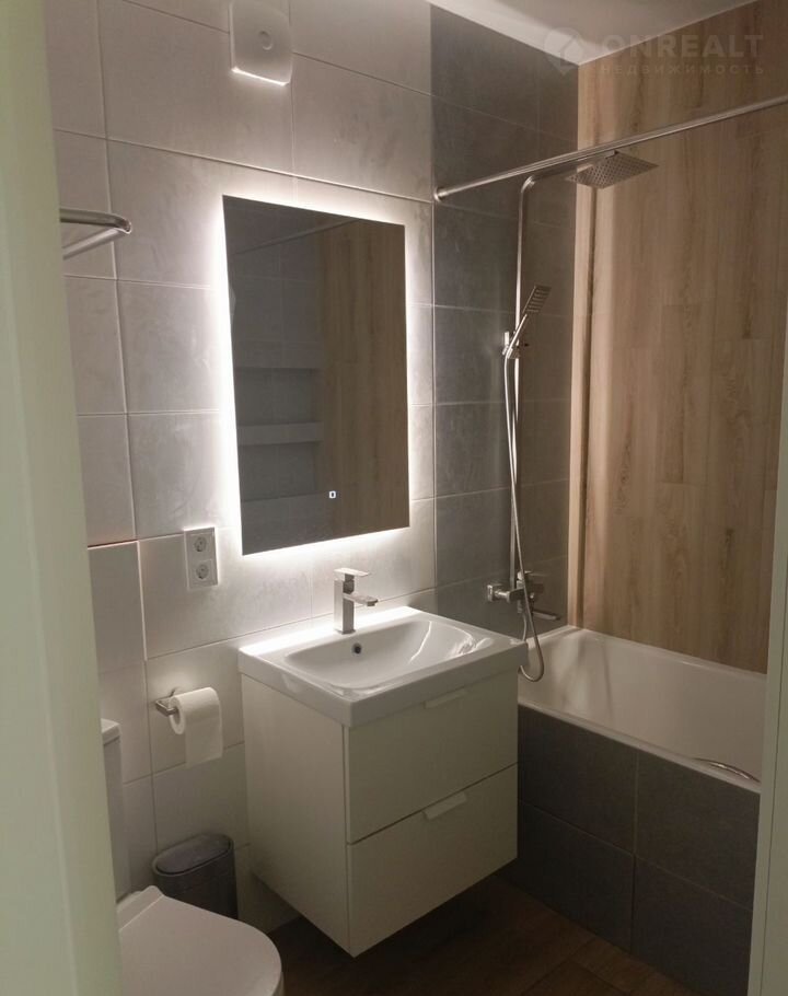 Сан.узел совмещённый выложен кафелем зеркало с подсветкой,полочки и шкафчик.