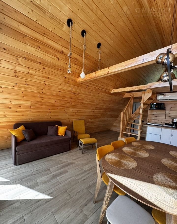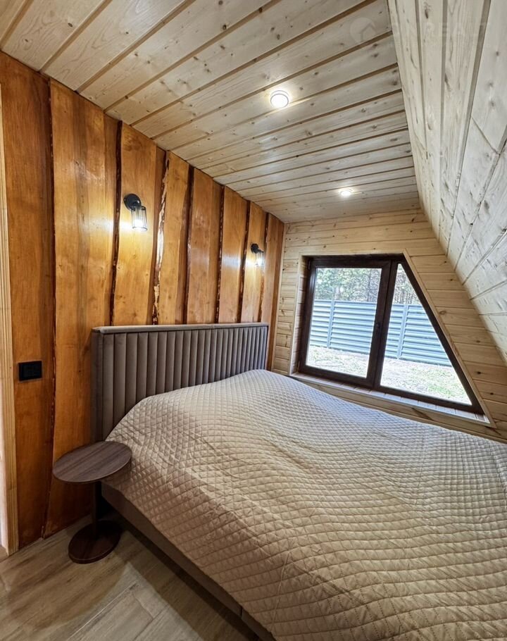 - В треугольном доме до 7 спальных мест: комната с двухместной кроватью на первом этаже, комната с двухместной кроватью на втором этаже, раскладной диван на первом этаже, по запросу можем предоставить раскладушку (+1 спальное место).