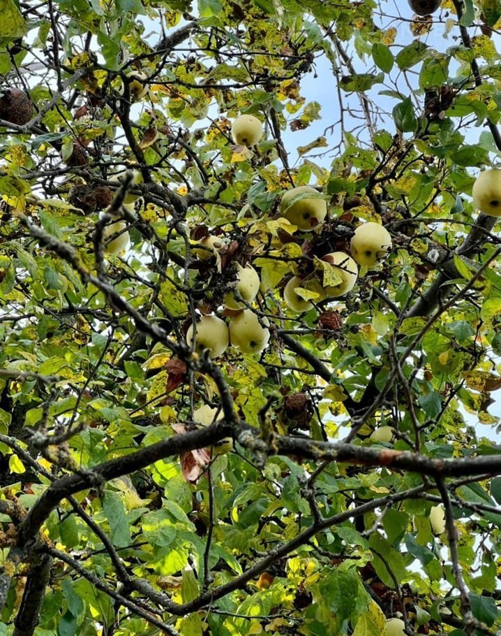 На участке растут плодоносящие яблони и груша, виноград.