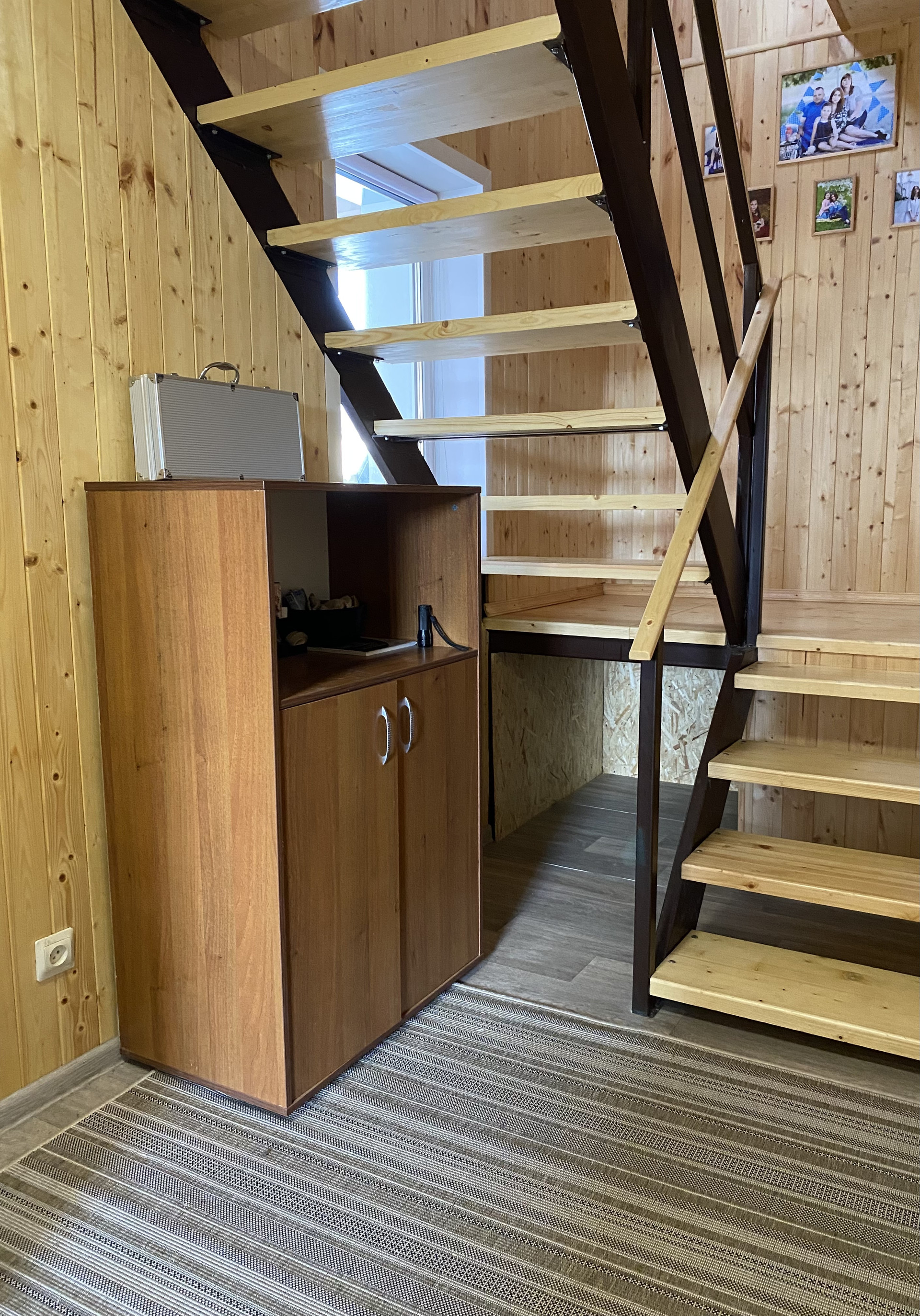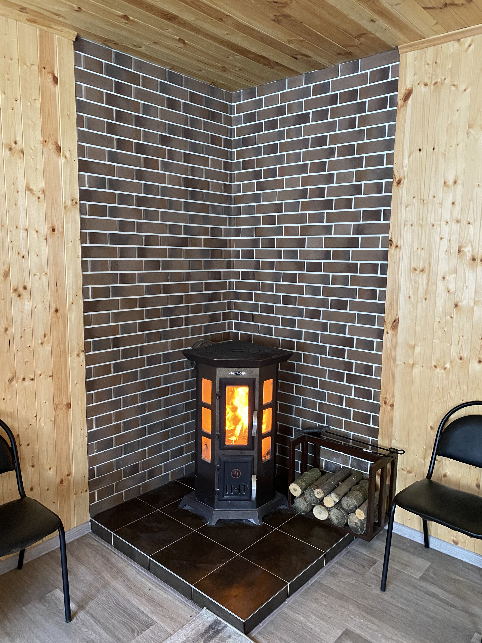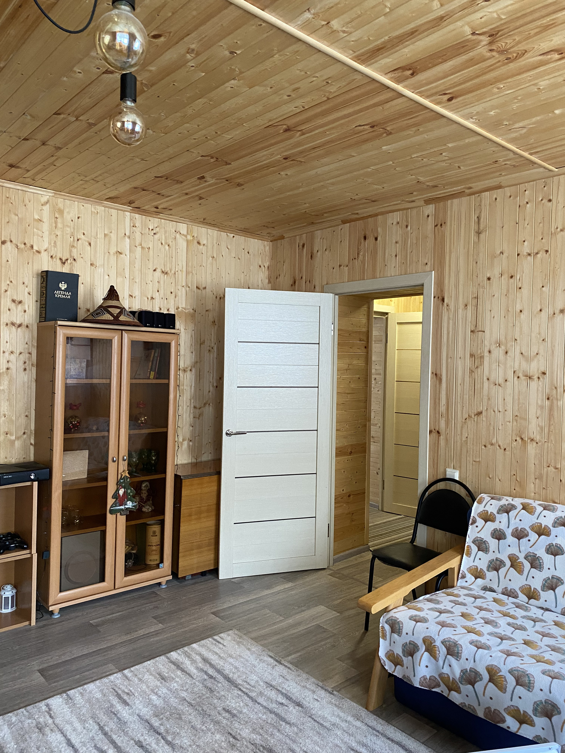 На 1-ом этаже - гостиная с камином, кухня, санузел, баня и коридор.