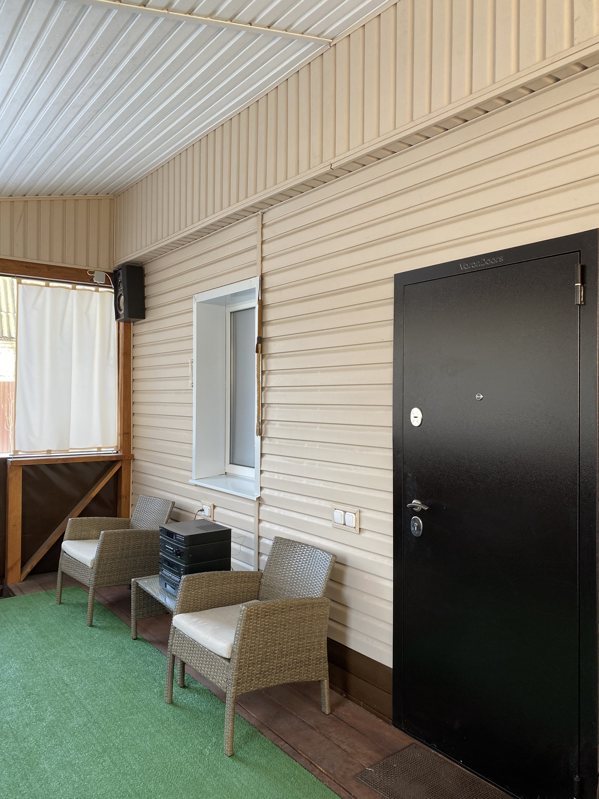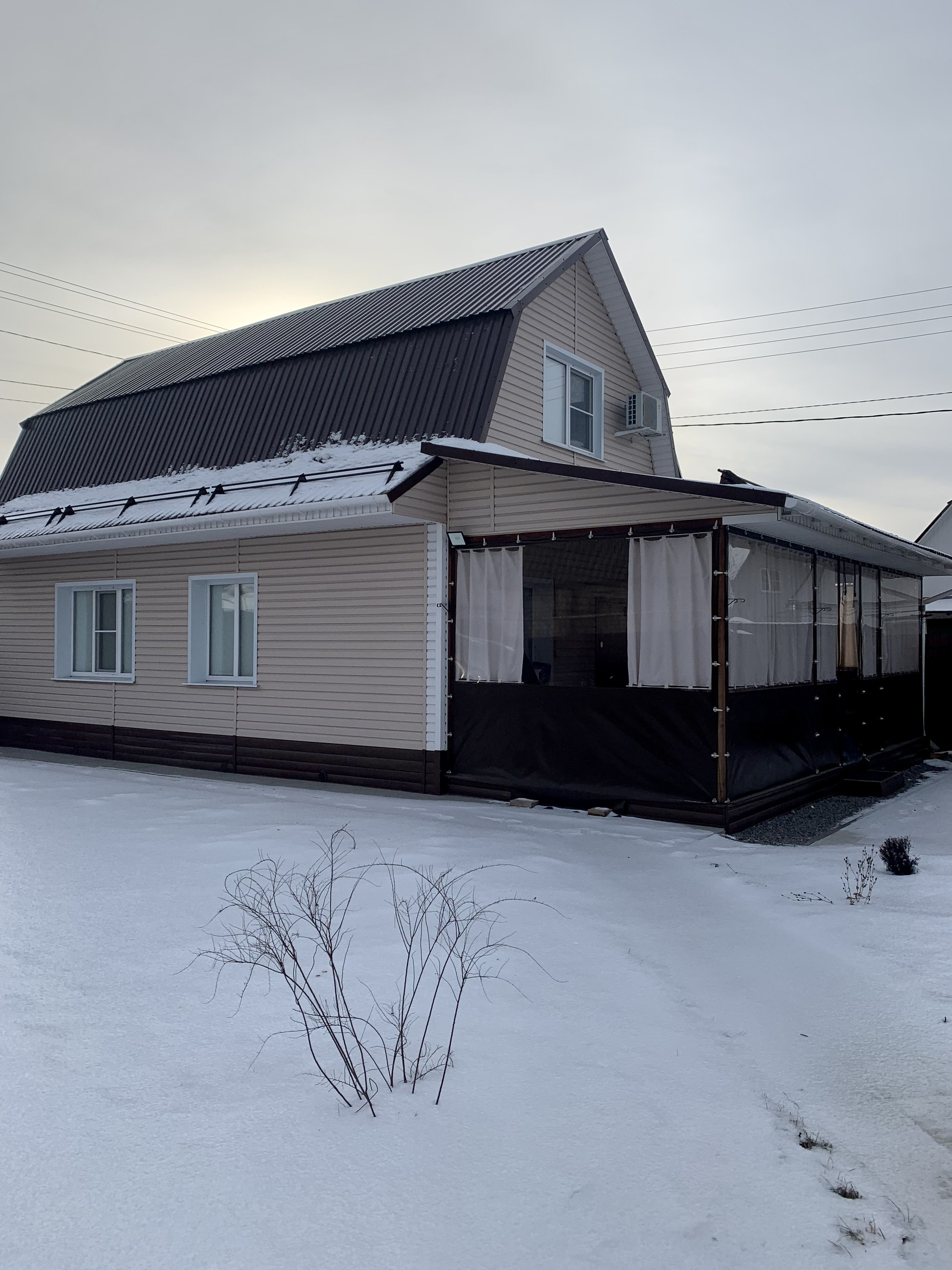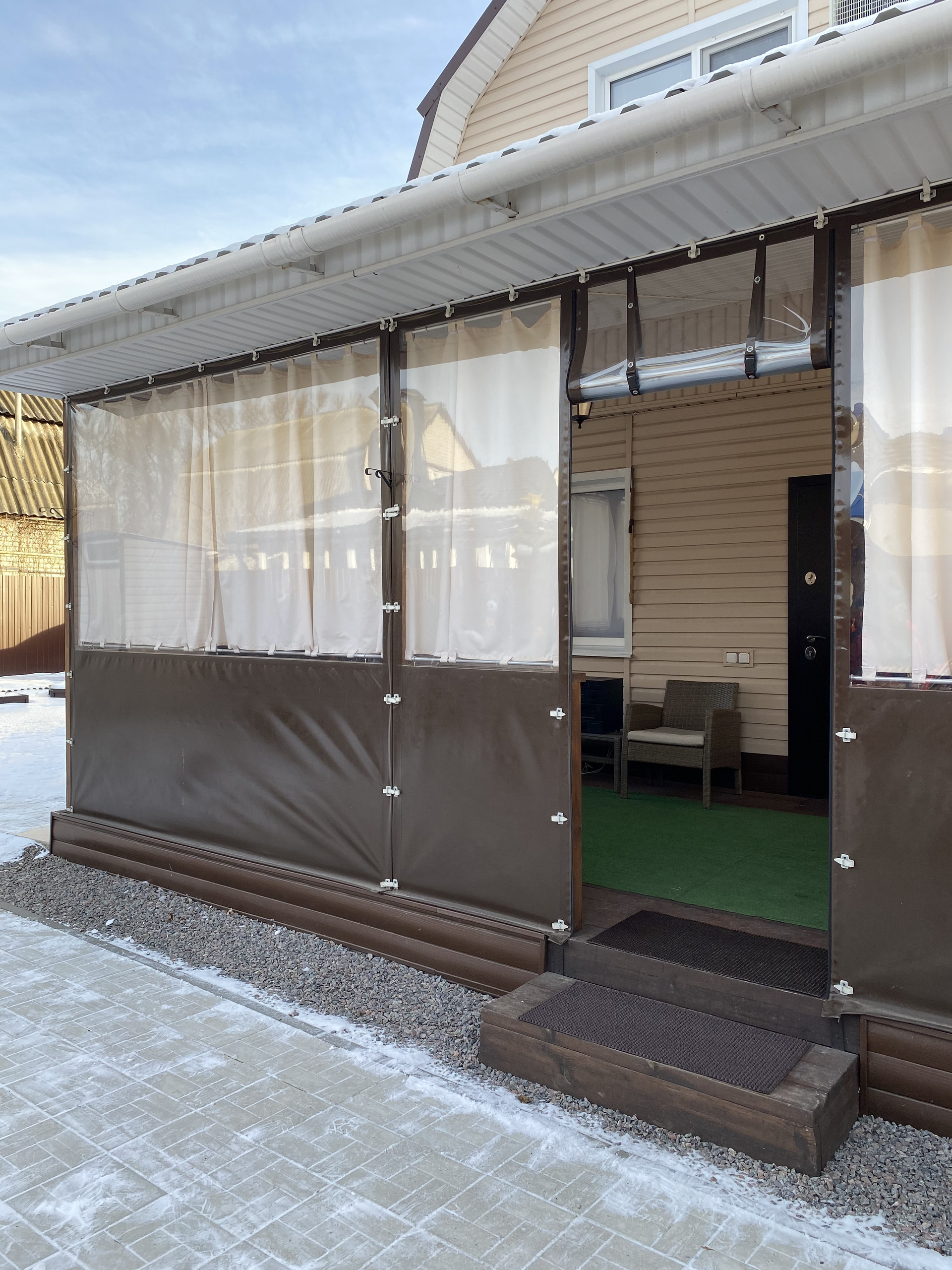 Веранда площадью 30 кв.м. пристроена к дому, утеплена мягкими окнами по периметру.