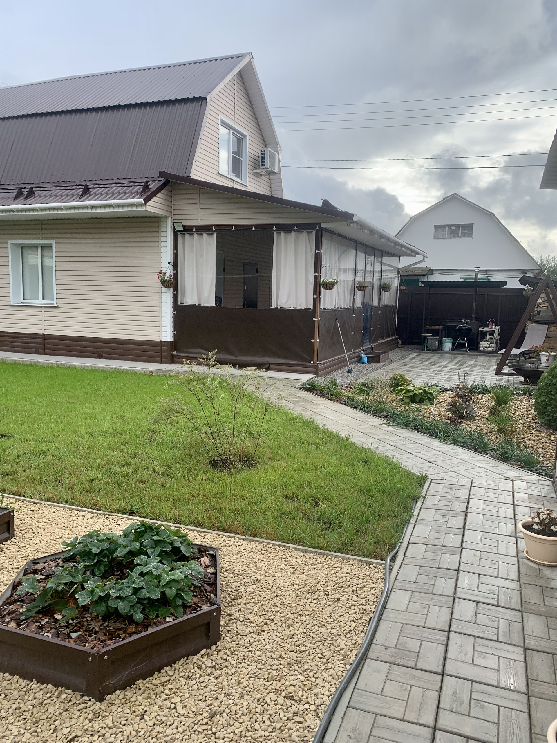На участке дорожки и зона барбекю вымощены плиткой, есть хозблок (сарай, туалет).