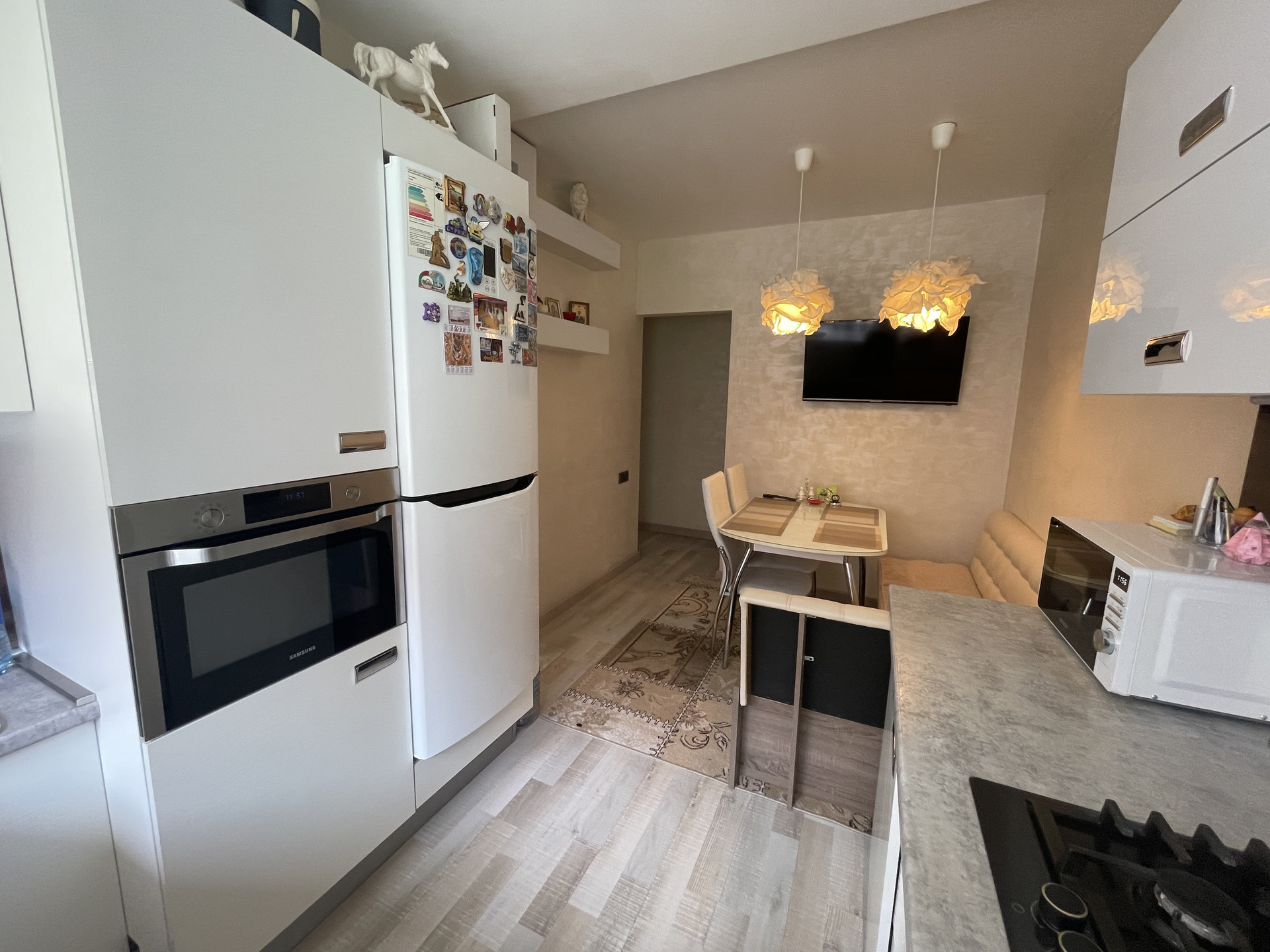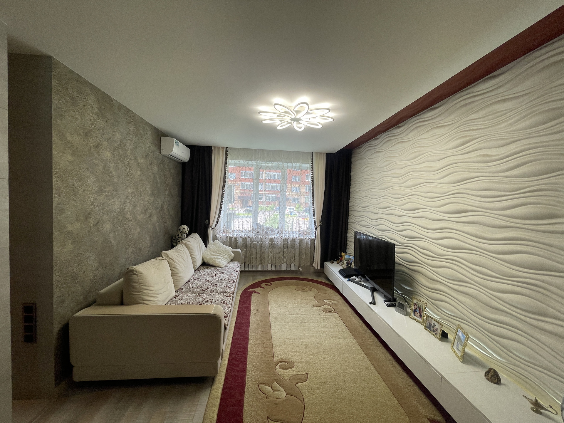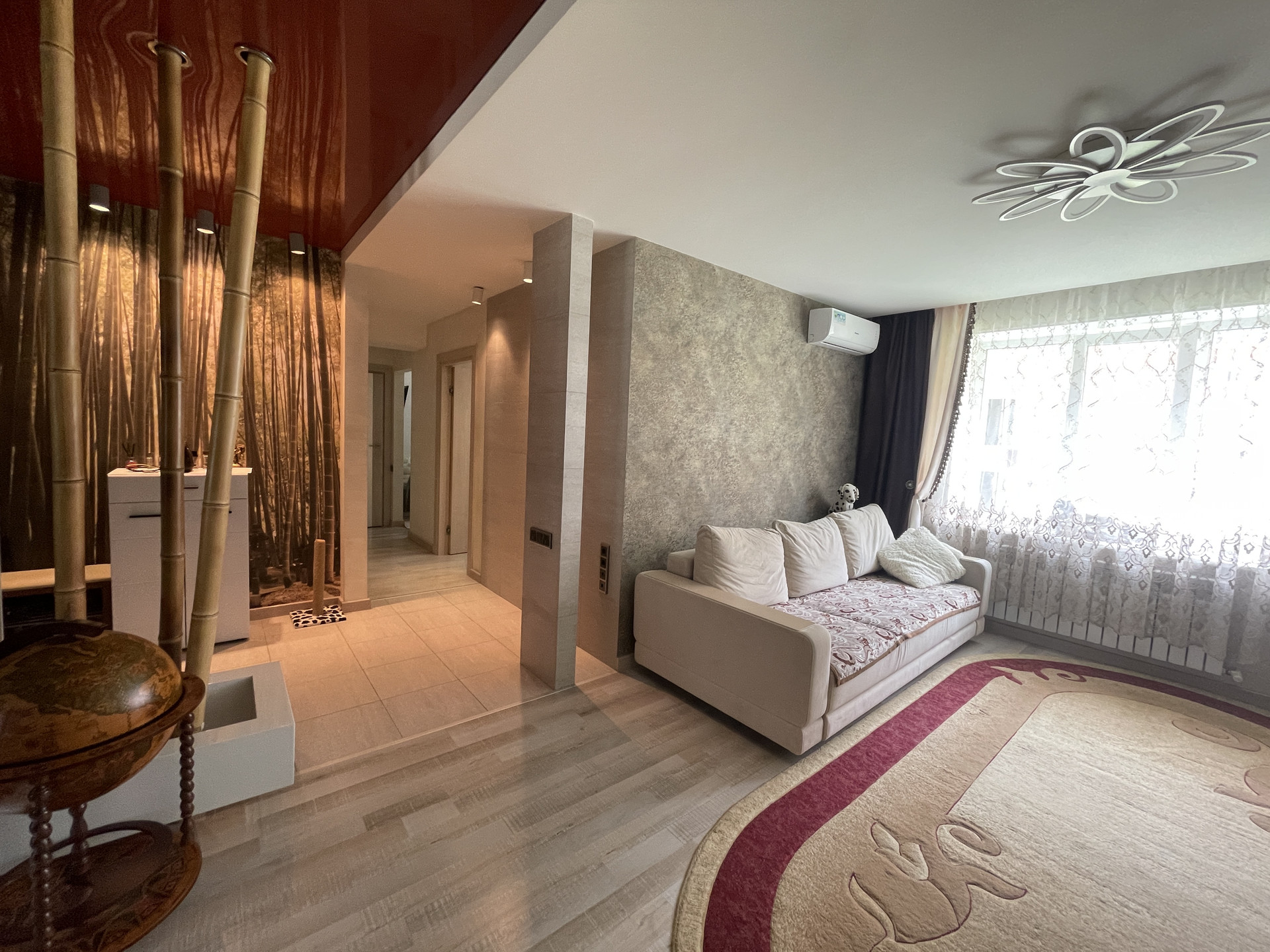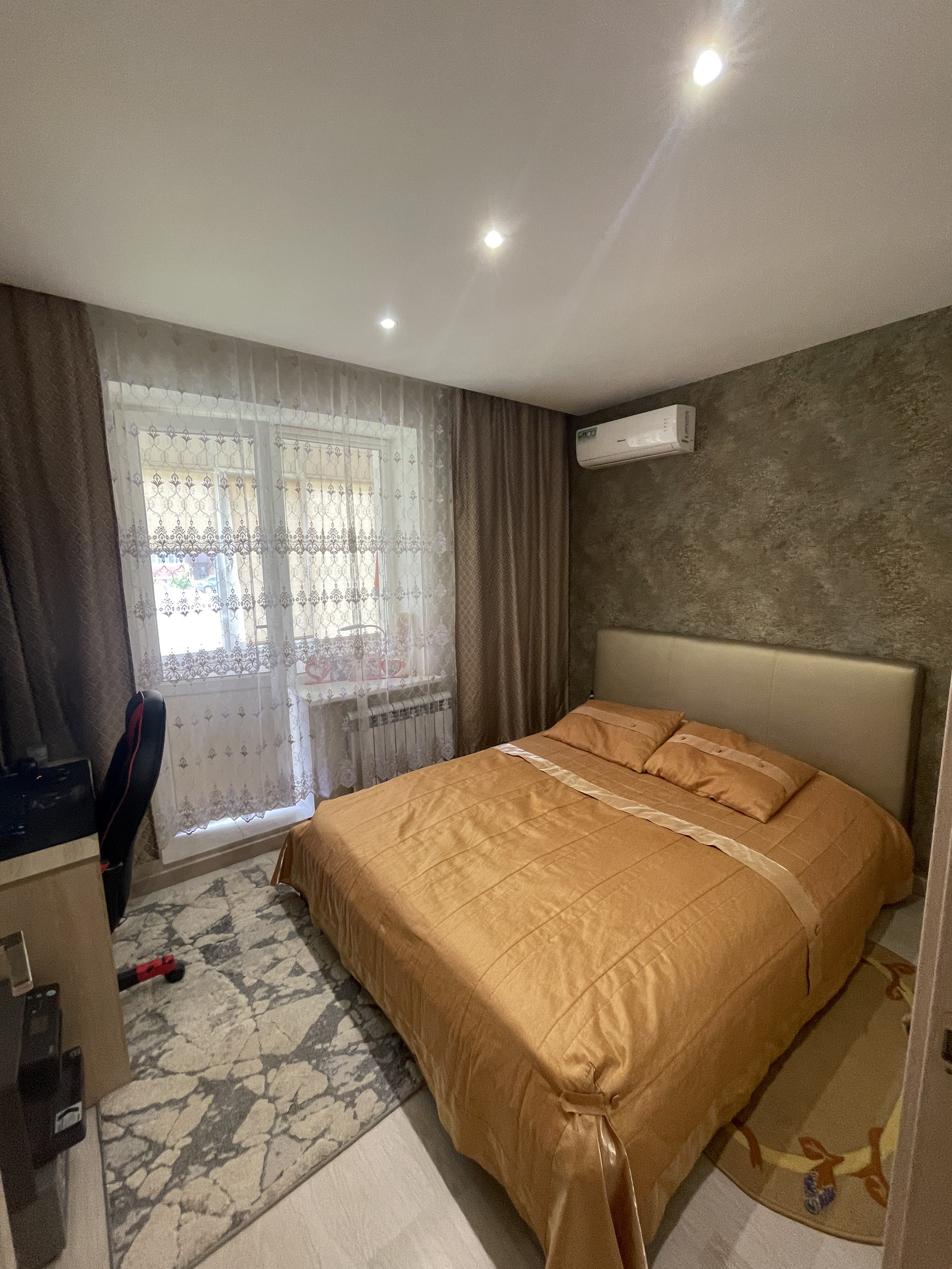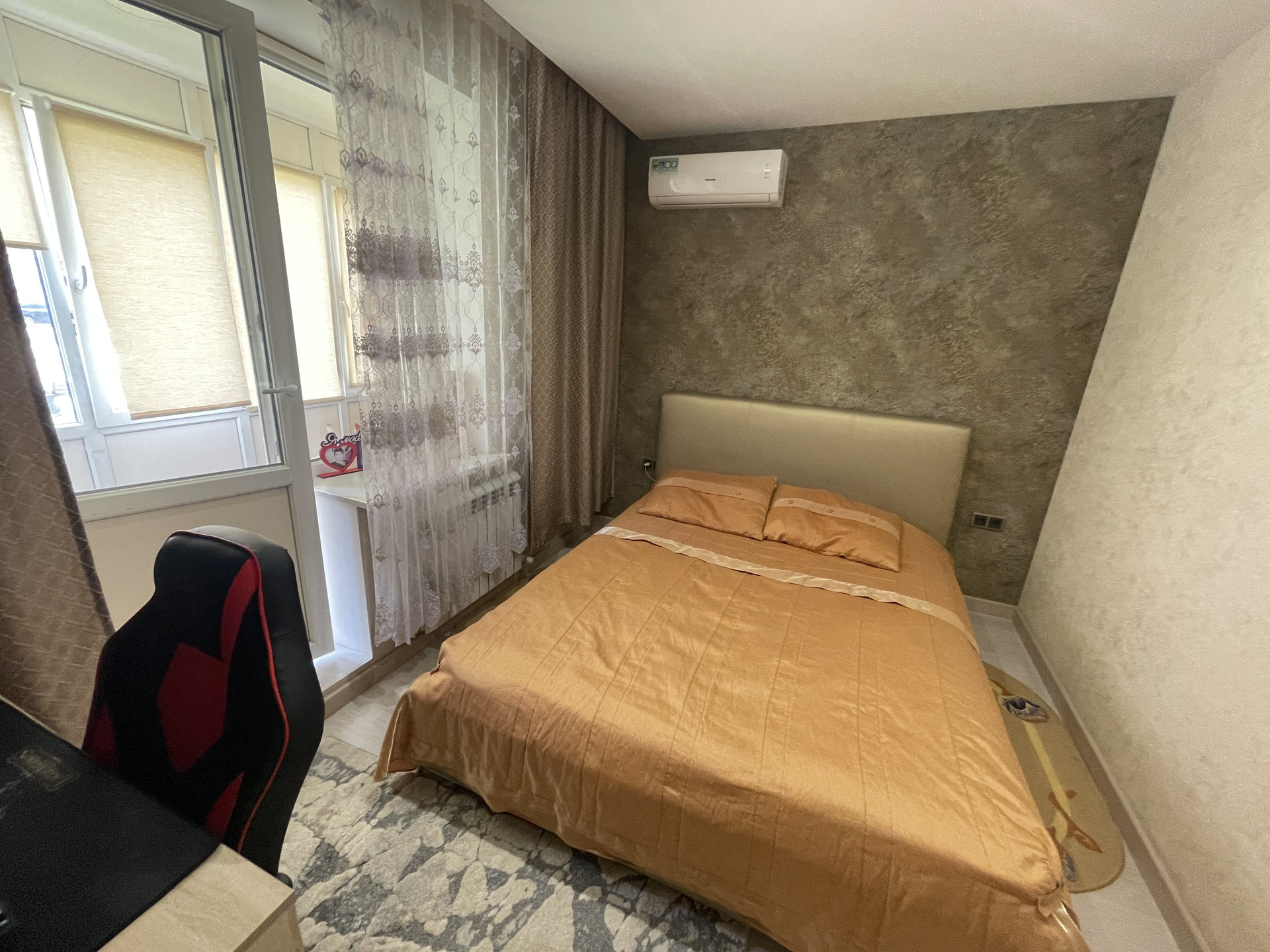 Остаётся мебель, встроенная кухня и техника. В комнатах кондиционеры. Спальня с выходом на просторную застеклённую лоджию.
